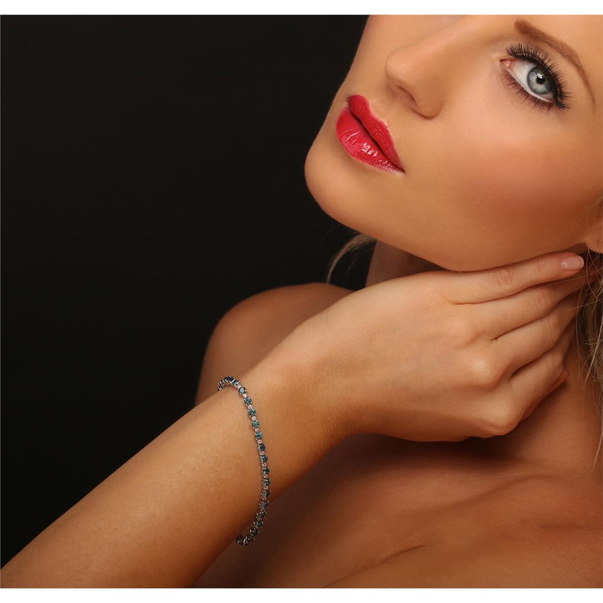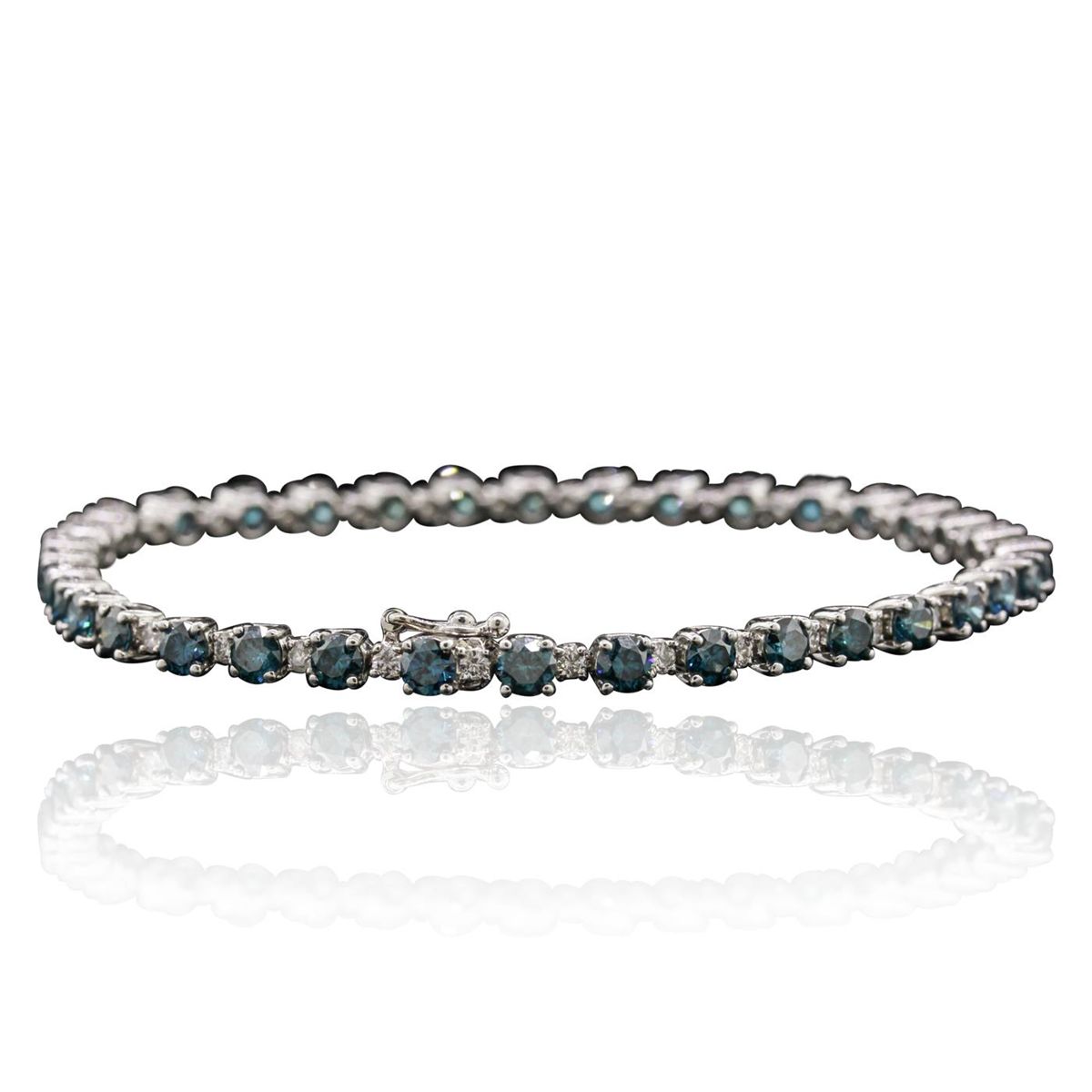 One electronically tested 14KT white gold ladies cast & assembled diamond bracelet with a bright polish finish. Condition is new, good workmanship. Seven and one-quarter inch length bracelet features a flexible ribbon of diamonds terminating in a concealed clasp with safety. Trademark is CJ. Identified with markings of "14K". Containing: Thirty-Six prong set round brilliant cut diamonds, measuring 1.80 - 1.70 x 1.05mm (depth est.) approximate total weight of 36 Stones = 0.81ct. Graded in the setting. Clarity I-1 to I-2. Color G - I. Thirty-Six round brilliant cut diamonds, measuring 3.30 - 3.20 x 1.95mm (depth est.) approximate total weight of 36 Stones = 4.63ct. Indications of laboratory irradiated enhanced color. Graded in the setting. Clarity SI-2 to I-2. Color fancy very slightly greenish blue. Total Weight of Diamonds 5.44 ct. Total Weight of Bracelet 9.30 grams. AIG Appraised at $10,515.00.