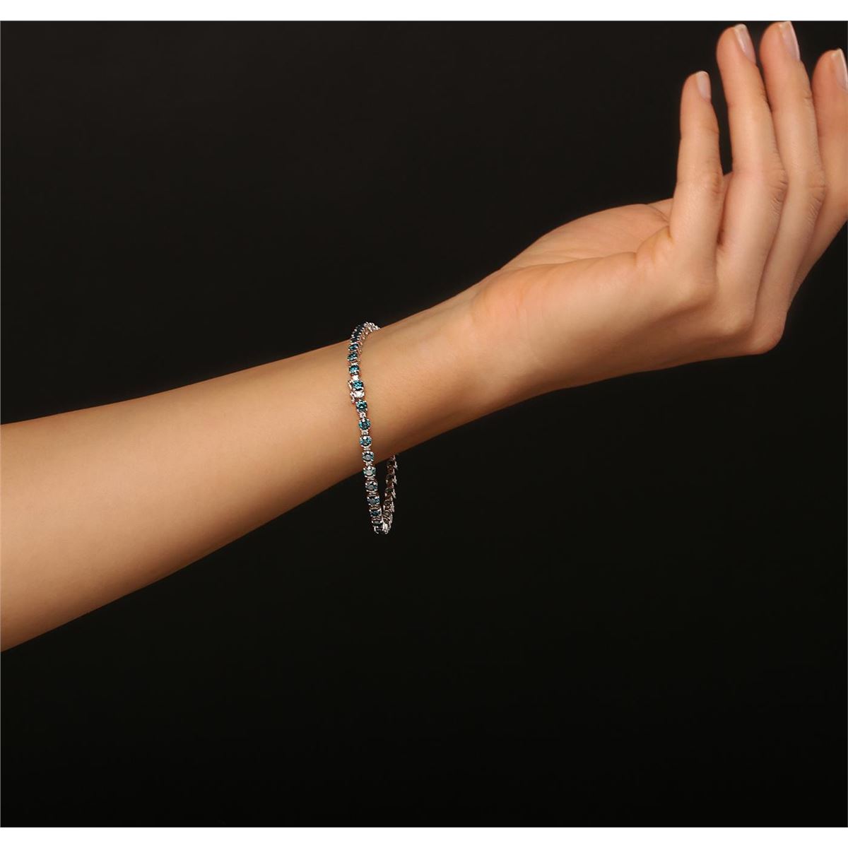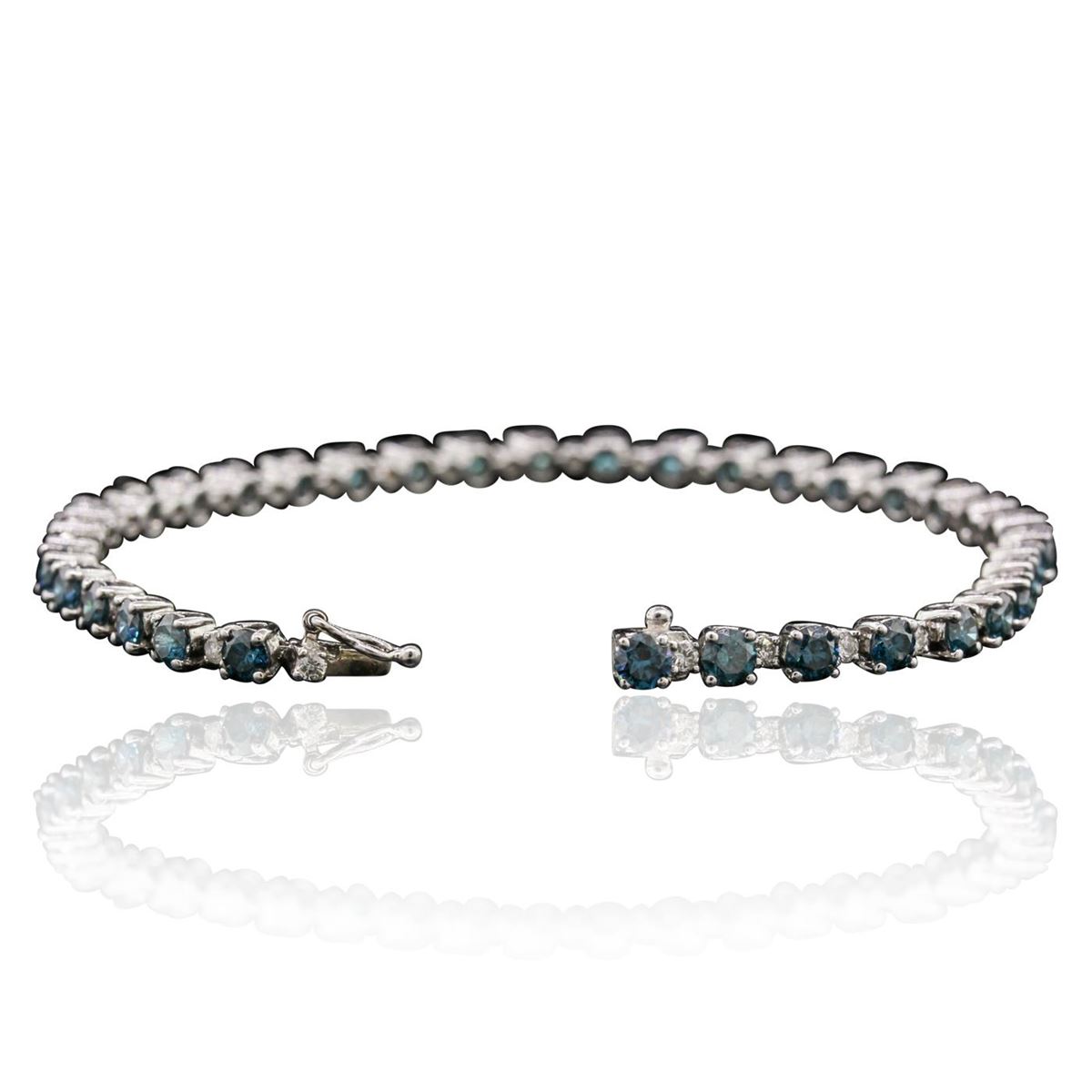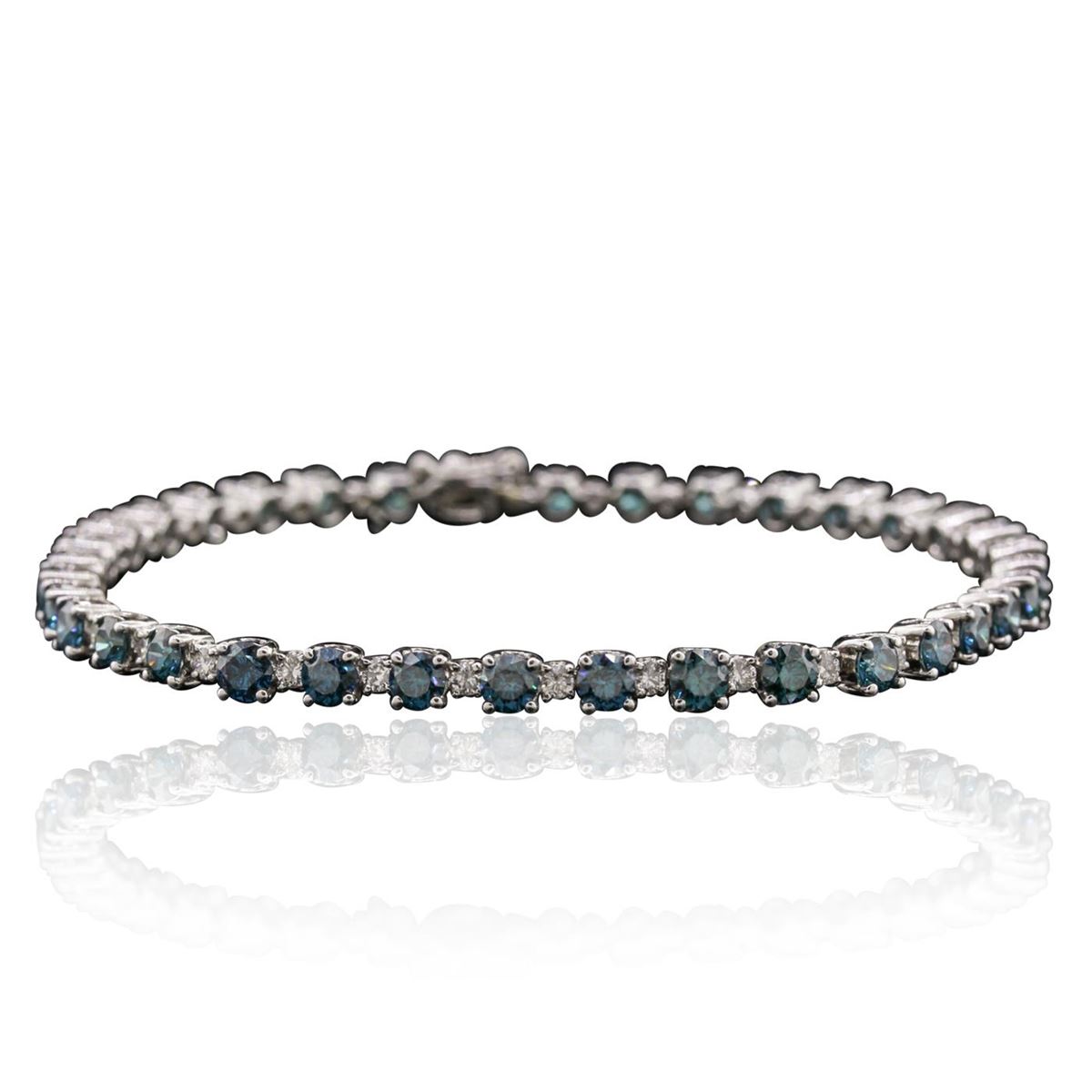 One electronically tested 14KT white gold ladies cast & assembled diamond bracelet with a bright polish finish. Condition is new, good workmanship. Seven and one-quarter inch length bracelet features a flexible ribbon of diamonds terminating in a concealed clasp with safety. Trademark is CJ. Identified with markings of "14K". Containing: Thirty-Six prong set round brilliant cut diamonds, measuring 1.80 - 1.70 x 1.05mm (depth est.) approximate total weight of 36 Stones = 0.81ct. Graded in the setting. Clarity I-1 to I-2. Color G - I. Thirty-Six round brilliant cut diamonds, measuring 3.30 - 3.20 x 1.95mm (depth est.) approximate total weight of 36 Stones = 4.63ct. Indications of laboratory irradiated enhanced color. Graded in the setting. Clarity SI-2 to I-2. Color fancy very slightly greenish blue. Total Weight of Diamonds 5.44 ct. Total Weight of Bracelet 9.30 grams. AIG Appraised at $10,515.00.