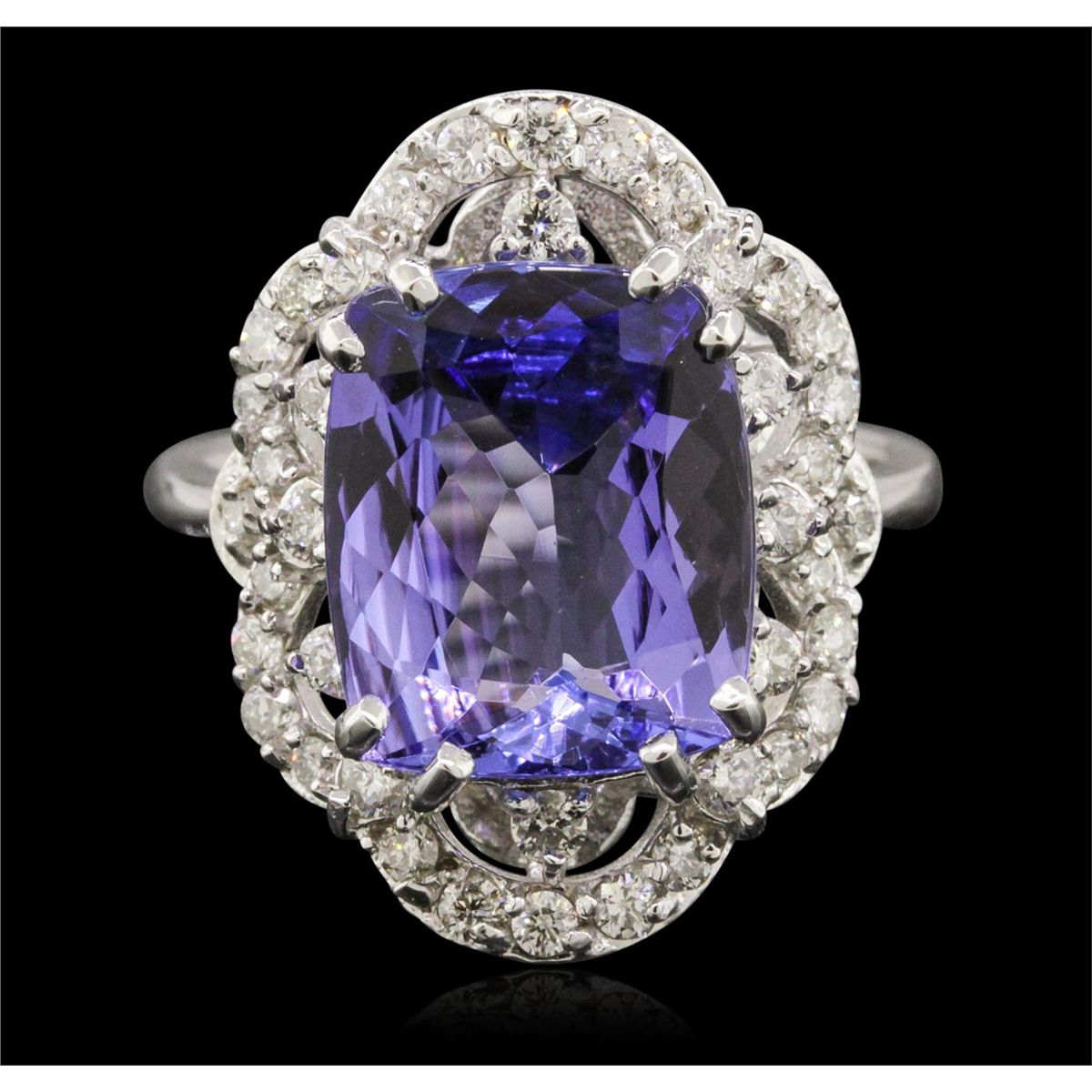 One electronically tested 14KT white gold ladies combination cast & assembled ring with a bright polish finish. Condition is new. Identified with markings of "K14". Containing: One prong set rectangular cushion modified brilliant cut natural tanzanite, measuring 12.50 x 10.04 x 5.52mm, approximate weight of 5.45ct., clarity is eye clean, type I, medium light, very slightly grayish, violet color, (GIA V 4/3), cut is good. Forty prong set round brilliant cut diamonds, measuring 1.80 - 1.40 x 0.96mm (depth est.) approximate. Total Weight of 40 Stones = 0.60ct. Clarity: SI-2 to I-1. Color: J - K, Cut is Good. Colored gemstones are presumed to have been subjected to commonly used enhancement processes. All diamonds and colored gemstones are graded in the mounting, unless otherwise stated. Total Weight of Colored Stones 5.45ct. Total Weight of Diamonds 0.60ct. Total Weight of Ring 7.00 grams. GGL Appraised at $10,805.00.