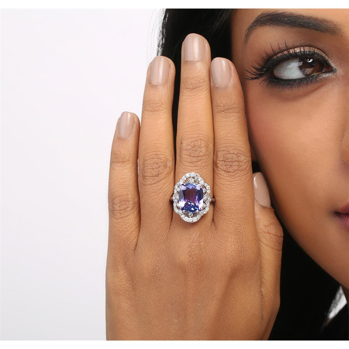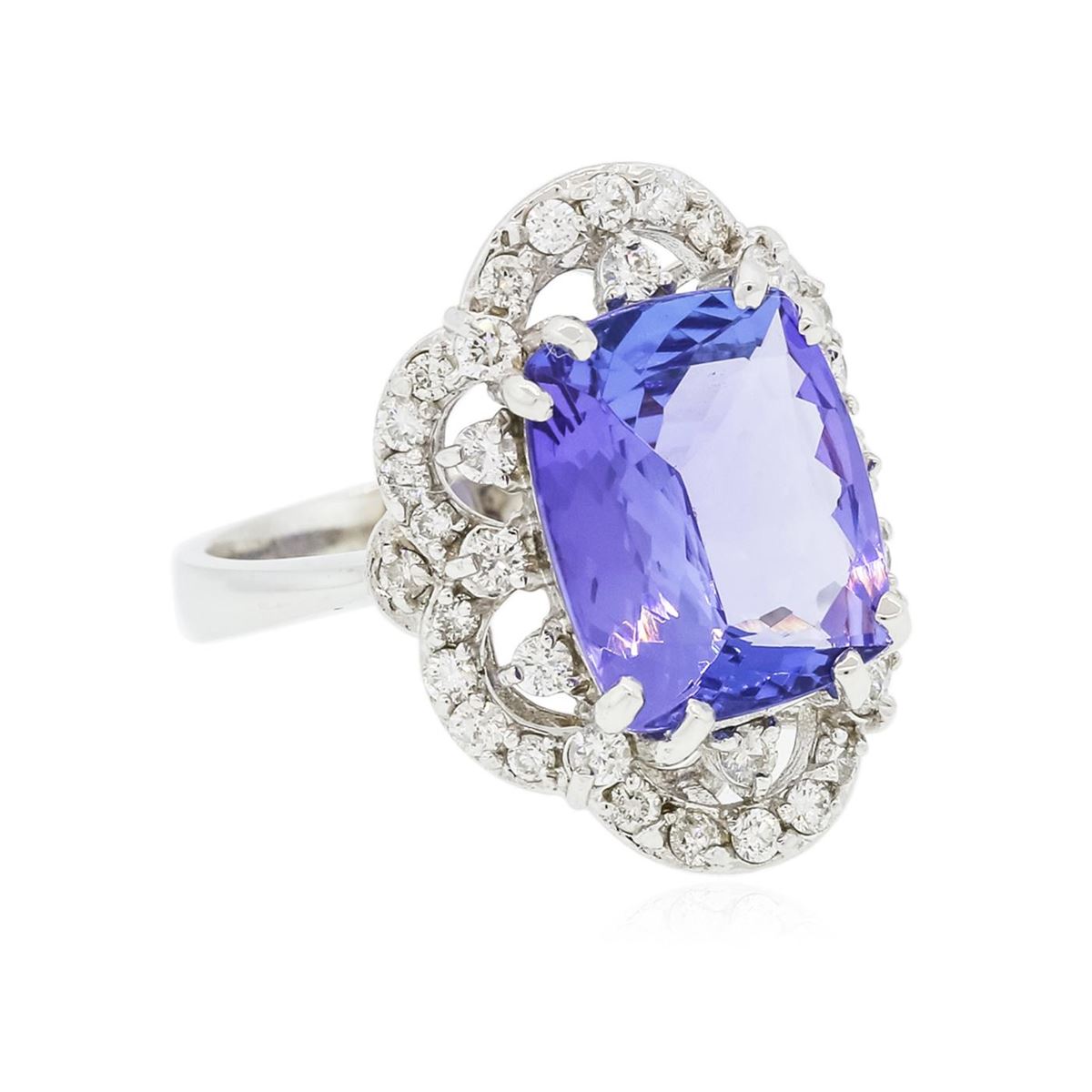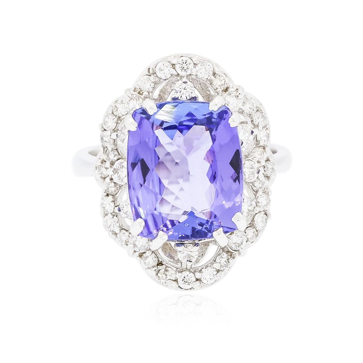 One electronically tested 14KT white gold ladies combination cast & assembled ring with a bright polish finish. Condition is new. Identified with markings of "K14". Containing: One prong set rectangular cushion modified brilliant cut natural tanzanite, measuring 12.50 x 10.04 x 5.52mm, approximate weight of 5.45ct., clarity is eye clean, type I, medium light, very slightly grayish, violet color, (GIA V 4/3), cut is good. Forty prong set round brilliant cut diamonds, measuring 1.80 - 1.40 x 0.96mm (depth est.) approximate. Total Weight of 40 Stones = 0.60ct. Clarity: SI-2 to I-1. Color: J - K, Cut is Good. Colored gemstones are presumed to have been subjected to commonly used enhancement processes. All diamonds and colored gemstones are graded in the mounting, unless otherwise stated. Total Weight of Colored Stones 5.45ct. Total Weight of Diamonds 0.60ct. Total Weight of Ring 7.00 grams. GGL Appraised at $10,805.00.