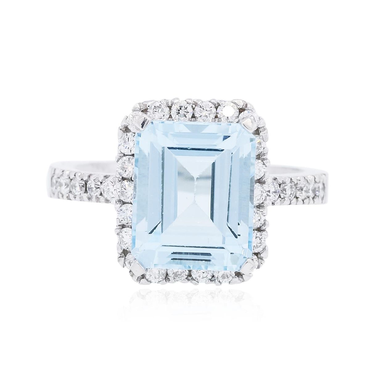 One electronically tested 14KT white gold ladies combination cast & assembled topaz and diamond ring with a flat shank with a bright polish finish. Identified with markings of "K14". Condition is new. Containing: One prong set emerald modified brilliant cut natural blue topaz, measuring 11.03 x 9.02 x 5.76mm, approximate weight of 5.46ct., clarity is eye clean, type I, medium light, slightly grayish, blue color, (GIA B 4/2), cut is good. Thirty-Two prong set round brilliant cut diamonds, measuring 1.50 - 1.50 x 0.90mm (depth est.) approximate total weight of 32 Stones = 0.39ct. Clarity: SI-1 to I-1. Color: I - J, Cut is Good. Colored gemstones are presumed to have been subjected to commonly used enhancement processes. All diamonds and colored gemstones are graded in the mounting, unless otherwise stated. Total Weight of Colored Stones 5.46ct. Total Weight of Diamonds 0.39ct. Total Weight of Ring 6.60 grams. GGL Appraised at $2,365.00.