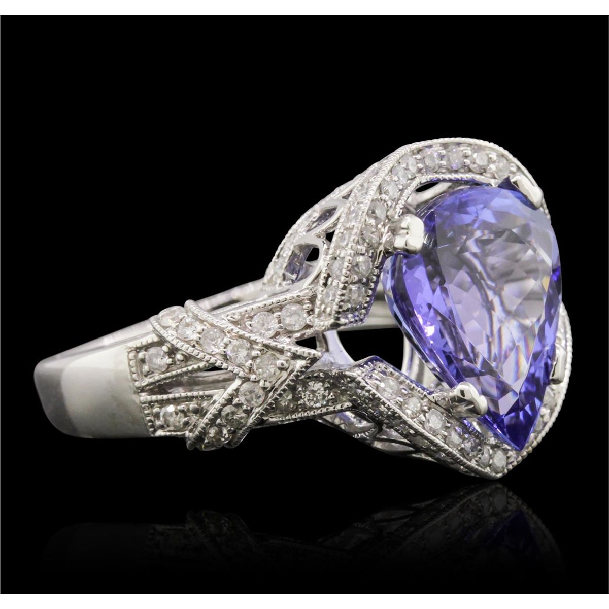 One electronically tested 14KT white gold ladies cast tanzanite and diamond ring. The featured tanzanite is set within a diamond bezel supported by elaborate diamond set shoulders, completed by a two and one-half millimeter wide band. Bright polish finish with milgrain detailing throughout. Trademark is PMI. Identified with markings of "14K". Condition is new, good workmanship. Containing: One prong set pear mixed cut natural tanzanite, measuring 12.30 x 10.10 x 6.20mm, 6%. bulge factor, approximate weight of 5.47ct., clarity is eye clean, type I, medium dark, moderately strong, bluish violet color, (GIA bV 6/4), cut is good. Transmitting light with no distortion, transparent. Colored Stone Grading Report attached. Graded in the setting. Tanzanite is a very rare gemstone that is only found in the country of Tanzania. Originally discovered in 1967. Tiffany & Company, named the stone Tanzanite. It is found in the Usumburu Mountains that border the Umba Valley of northern Tanzania. Tanzanite occurs in gray, brown, violet, blue, reddish-purple, & green. The gem is interesting because of its exceptional pleochroism. Rotated in different directions a tanzanite will exhibit multiple changes of color. Tanzanite has a low tolerance to ultrasonic cleaning, and should not be cleaned using this method. One Hundred Thirteen prong set round brilliant cut diamonds, measuring 1.30 - 1.20 x 0.75mm (depth est.) approximate total weight of 113 Stones = 0.90ct. Graded in the setting. Clarity: SI-1 to I-1 . Color: G - I. Total Weight of Colored Stones 5.47ct. Total Weight of Diamonds 0.90ct. Total Weight of Ring 7.80 grams. AIG Appraised at $18,330.00.