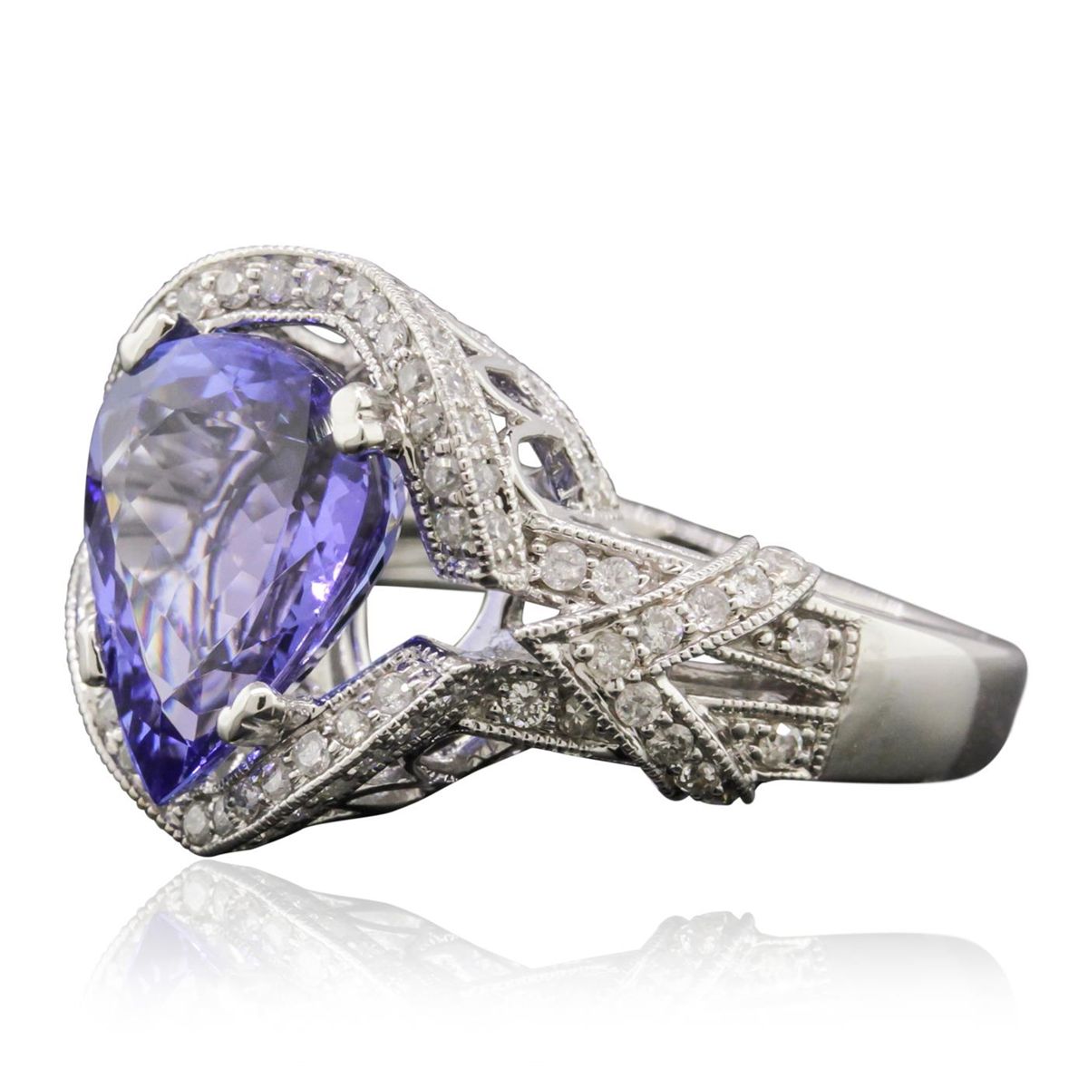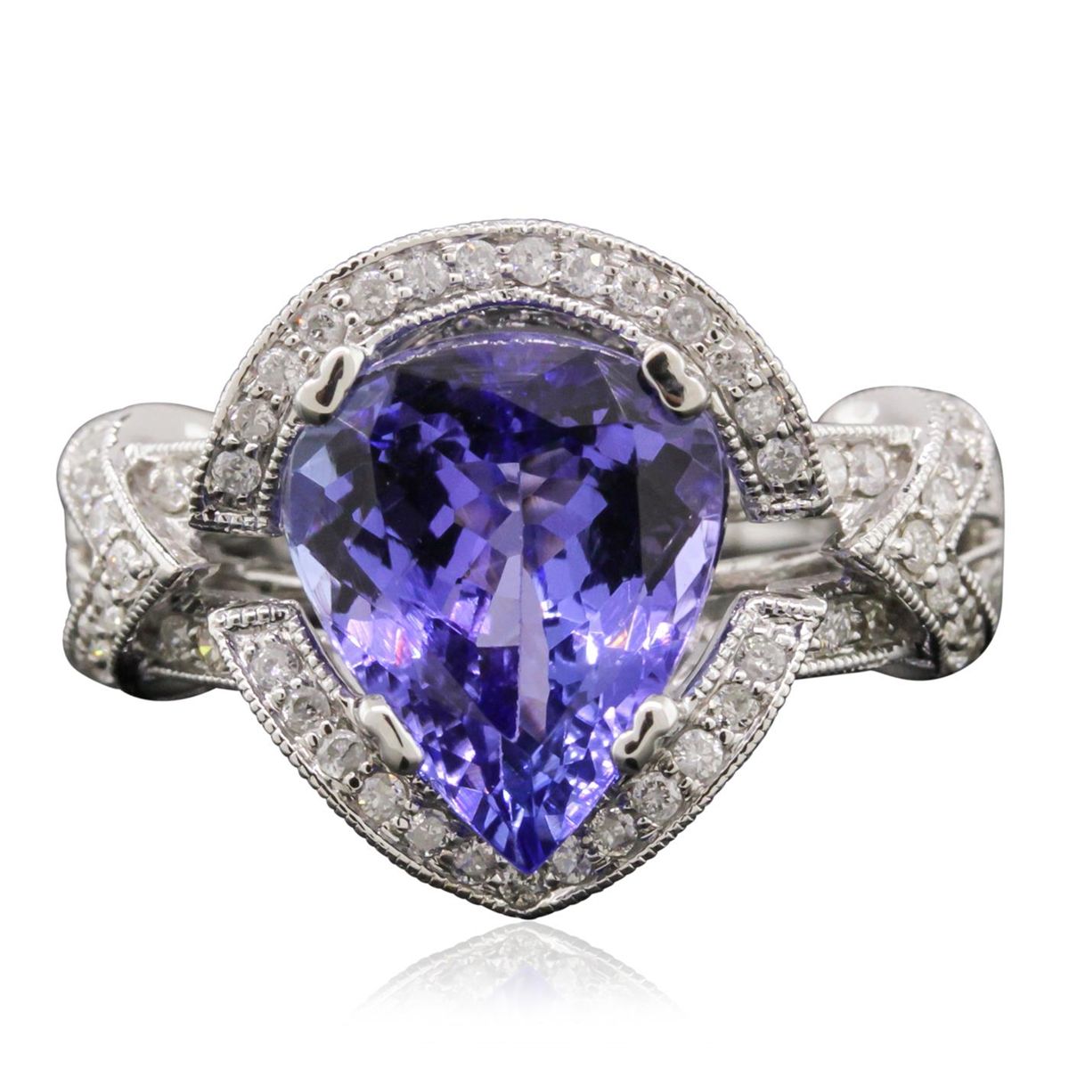 One electronically tested 14KT white gold ladies cast tanzanite and diamond ring. The featured tanzanite is set within a diamond bezel supported by elaborate diamond set shoulders, completed by a two and one-half millimeter wide band. Bright polish finish with milgrain detailing throughout. Trademark is PMI. Identified with markings of "14K". Condition is new, good workmanship. Containing: One prong set pear mixed cut natural tanzanite, measuring 12.30 x 10.10 x 6.20mm, 6%. bulge factor, approximate weight of 5.47ct., clarity is eye clean, type I, medium dark, moderately strong, bluish violet color, (GIA bV 6/4), cut is good. Transmitting light with no distortion, transparent. Colored Stone Grading Report attached. Graded in the setting. Tanzanite is a very rare gemstone that is only found in the country of Tanzania. Originally discovered in 1967. Tiffany & Company, named the stone Tanzanite. It is found in the Usumburu Mountains that border the Umba Valley of northern Tanzania. Tanzanite occurs in gray, brown, violet, blue, reddish-purple, & green. The gem is interesting because of its exceptional pleochroism. Rotated in different directions a tanzanite will exhibit multiple changes of color. Tanzanite has a low tolerance to ultrasonic cleaning, and should not be cleaned using this method. One Hundred Thirteen prong set round brilliant cut diamonds, measuring 1.30 - 1.20 x 0.75mm (depth est.) approximate total weight of 113 Stones = 0.90ct. Graded in the setting. Clarity: SI-1 to I-1 . Color: G - I. Total Weight of Colored Stones 5.47ct. Total Weight of Diamonds 0.90ct. Total Weight of Ring 7.80 grams. AIG Appraised at $18,330.00.
