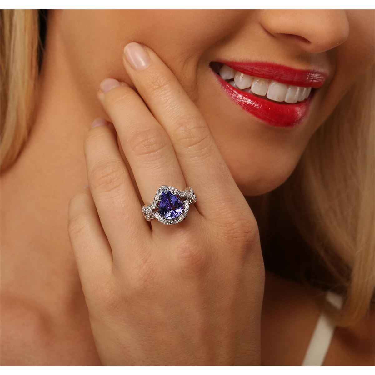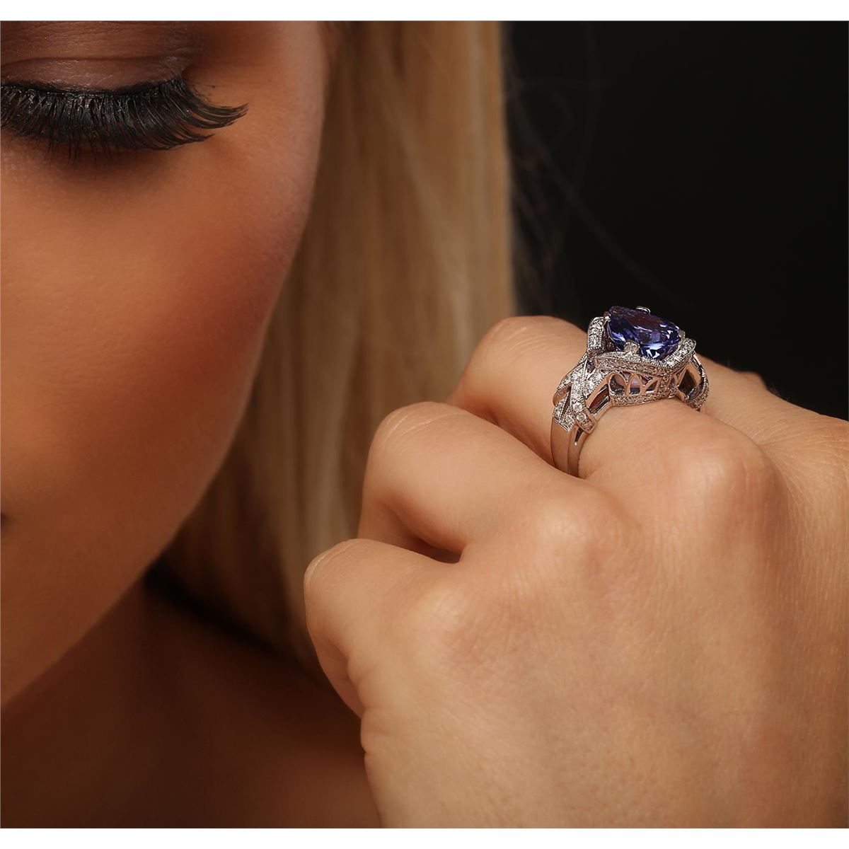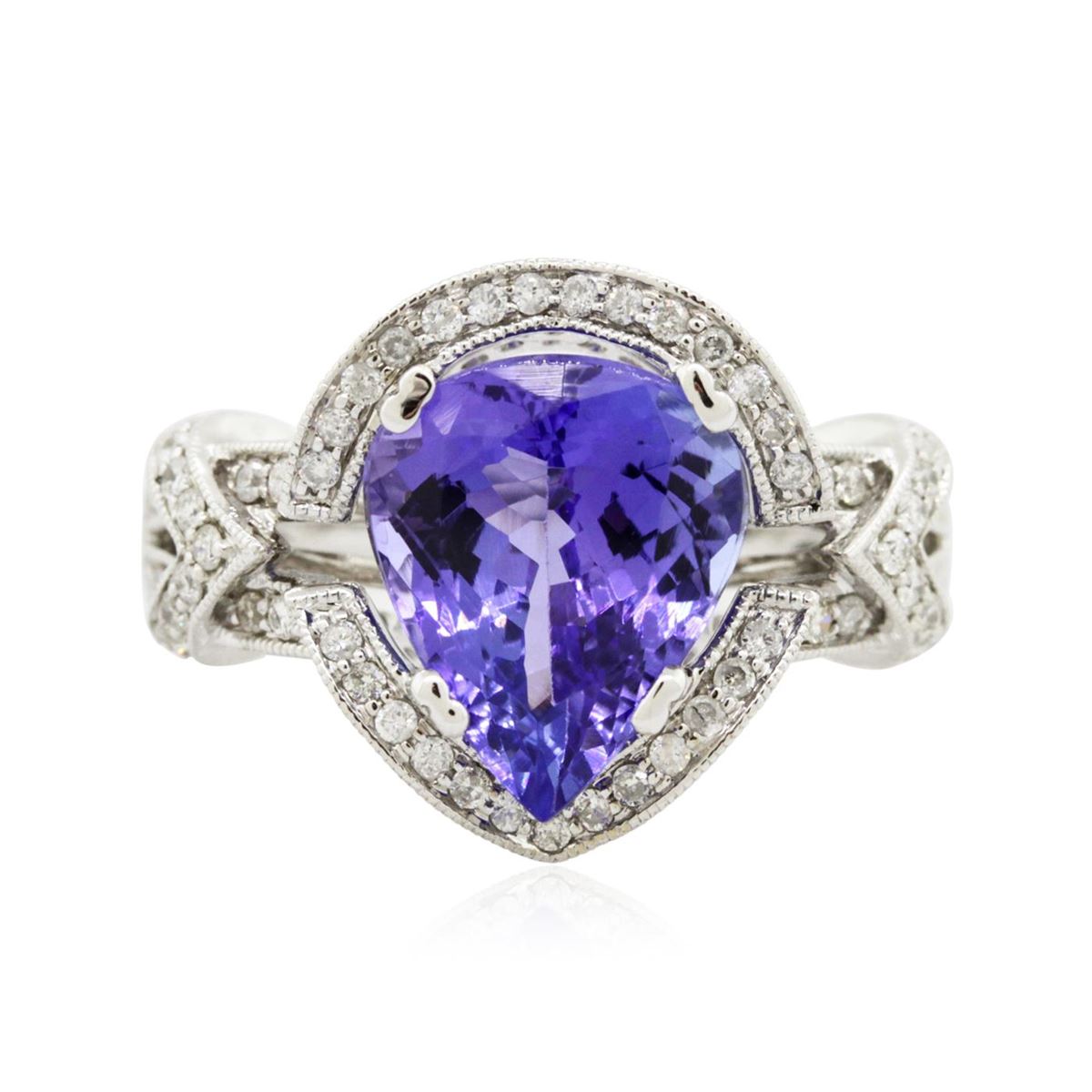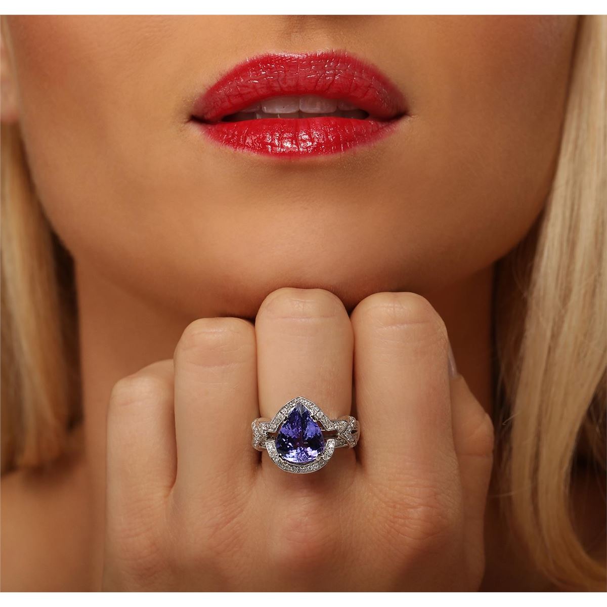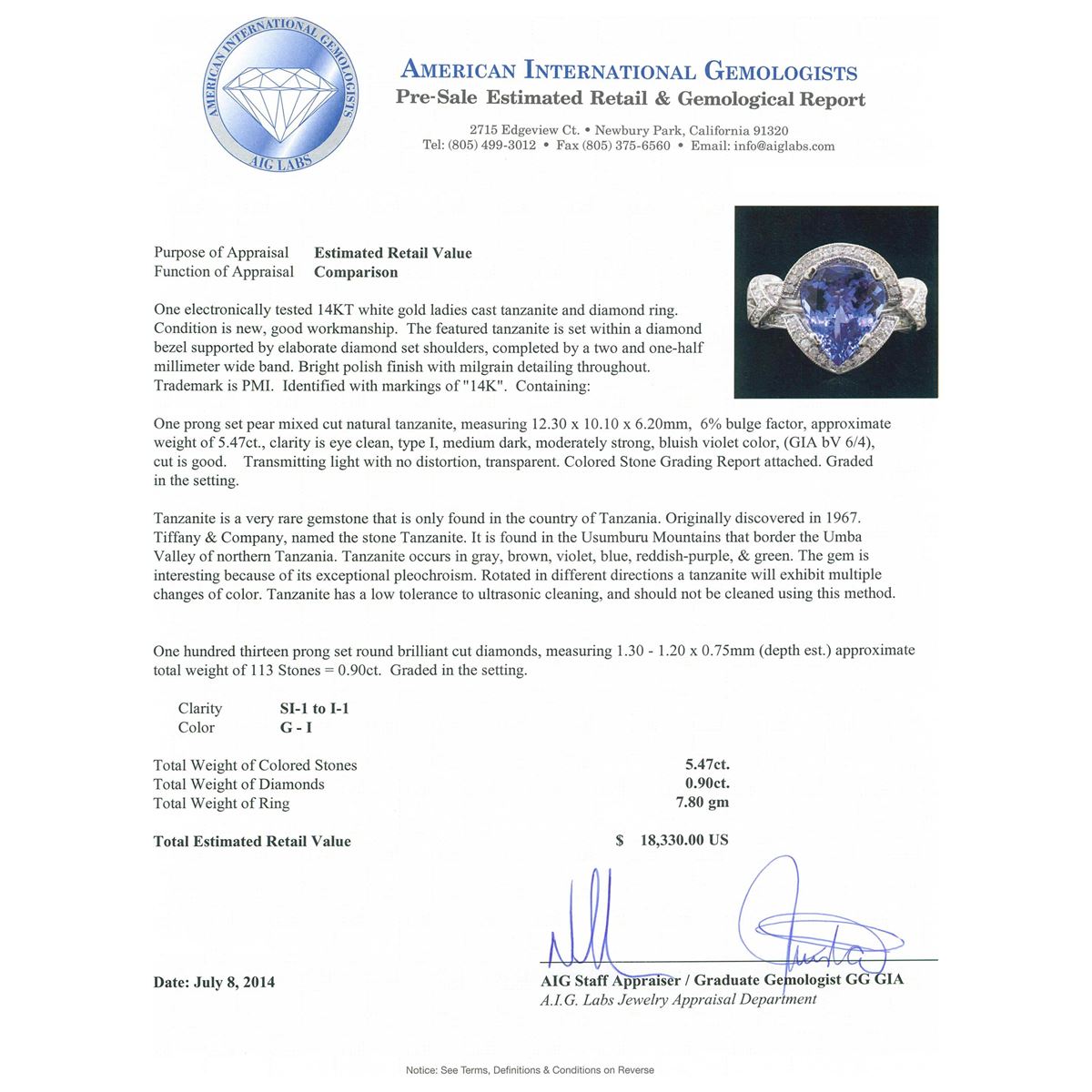 One electronically tested 14KT white gold ladies cast tanzanite and diamond ring. The featured tanzanite is set within a diamond bezel supported by elaborate diamond set shoulders, completed by a two and one-half millimeter wide band. Bright polish finish with milgrain detailing throughout. Trademark is PMI. Identified with markings of "14K". Condition is new, good workmanship. Containing: One prong set pear mixed cut natural tanzanite, measuring 12.30 x 10.10 x 6.20mm, 6%. bulge factor, approximate weight of 5.47ct., clarity is eye clean, type I, medium dark, moderately strong, bluish violet color, (GIA bV 6/4), cut is good. Transmitting light with no distortion, transparent. Colored Stone Grading Report attached. Graded in the setting. Tanzanite is a very rare gemstone that is only found in the country of Tanzania. Originally discovered in 1967. Tiffany & Company, named the stone Tanzanite. It is found in the Usumburu Mountains that border the Umba Valley of northern Tanzania. Tanzanite occurs in gray, brown, violet, blue, reddish-purple, & green. The gem is interesting because of its exceptional pleochroism. Rotated in different directions a tanzanite will exhibit multiple changes of color. Tanzanite has a low tolerance to ultrasonic cleaning, and should not be cleaned using this method. One Hundred Thirteen prong set round brilliant cut diamonds, measuring 1.30 - 1.20 x 0.75mm (depth est.) approximate total weight of 113 Stones = 0.90ct. Graded in the setting. Clarity: SI-1 to I-1 . Color: G - I. Total Weight of Colored Stones 5.47ct. Total Weight of Diamonds 0.90ct. Total Weight of Ring 7.80 grams. AIG Appraised at $18,330.00.