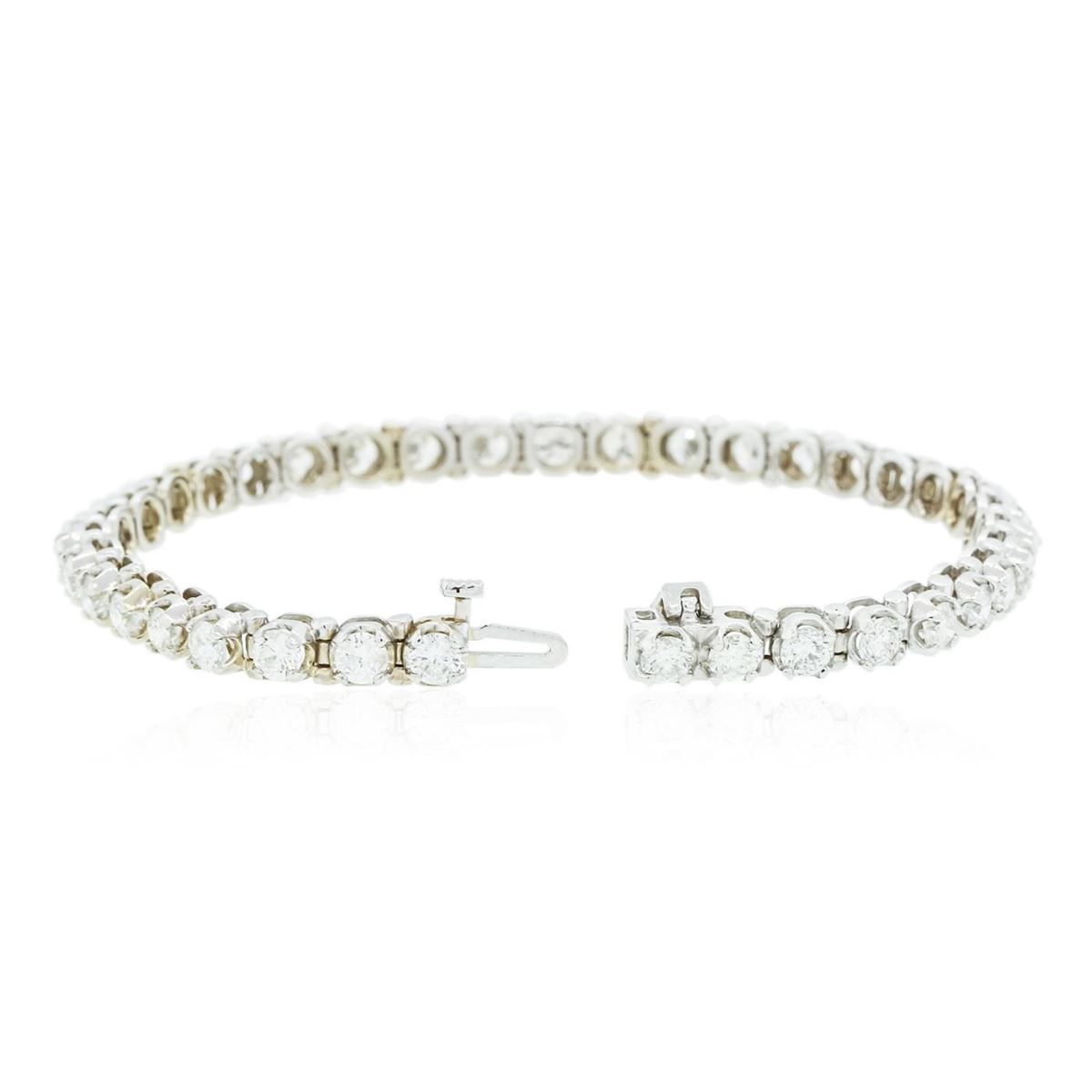 One electronically tested 14KT white gold ladies cast & assembled diamond tennis bracelet with a bright polish finish. Condition is new, good workmanship. Seven inch length bracelet composed of a flexible ribbon of diamonds, terminating in a concealed clasp with safety bar. Identified with markings of "14K". Tennis bracelets & necklaces got their unusual name from an incident involving the U.S. professional tennis player Chris Evert during a tennis match in the 1980's. Evert had been wearing an expensive diamond bracelet, an inline string of individually-set diamonds. Previously these bracelets were known as eternity bracelets. When the clasp snapped during play, she asked the officials to stop the tennis match until the bracelet could be found. Since that day, bracelets and necklaces featuring an inline string of diamonds have been called tennis bracelets and tennis necklaces. Containing: Thirty-Seven prong set round brilliant cut diamonds, measuring 3.40 - 3.40 x 2.04mm (depth est.) approximate total weight of 37 Stones = 5.48ct. Graded in the setting. Clarity: SI-2 to I-2. Color: G - I. Total Weight of Diamonds 5.48ct. Total Weight of Bracelet 13.80 grams. AIG Appraised at $16,000.00.