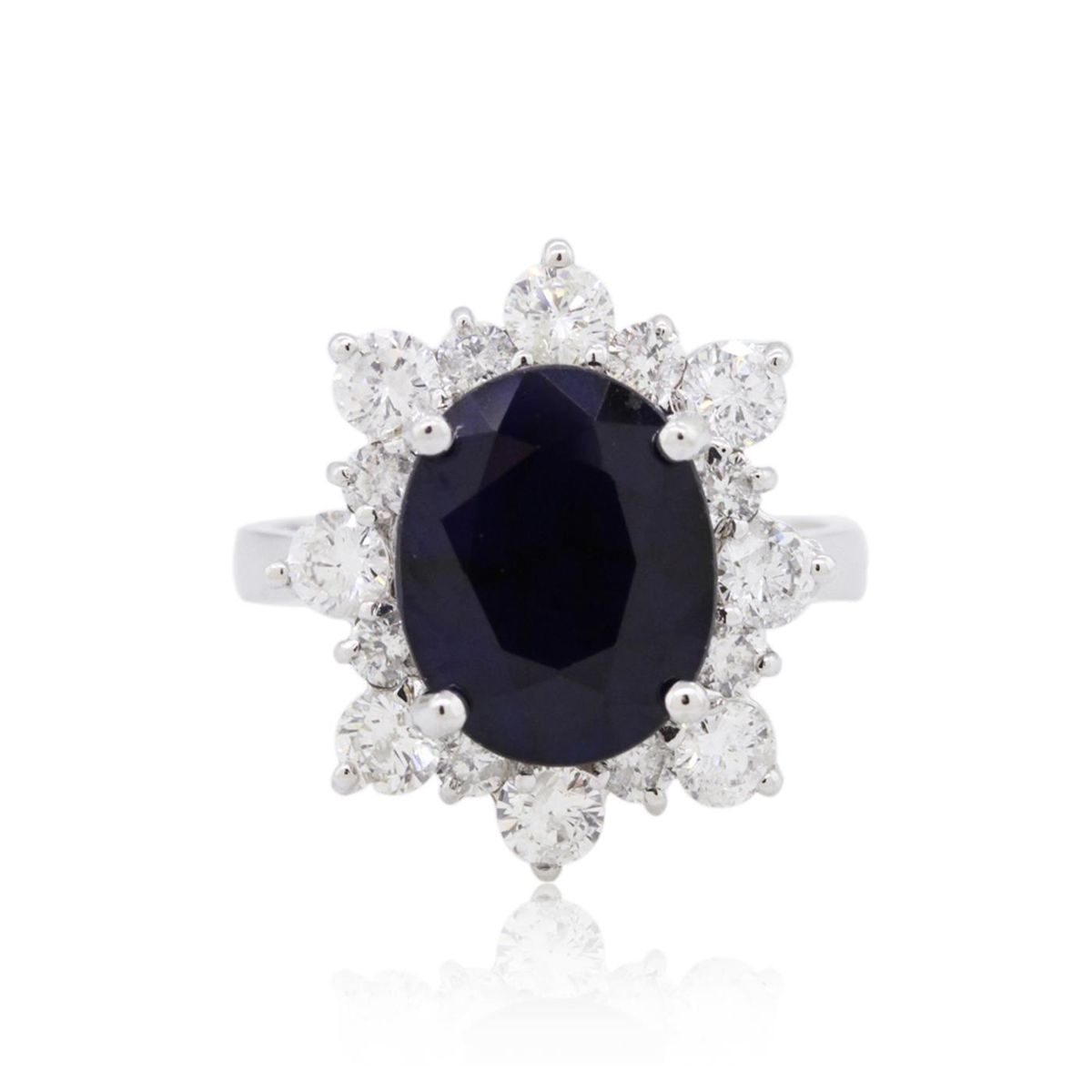 One polished, stamped, and electronically tested solid 14KT White Gold ring mounted with: 1 genuine sapphire center stone weighing 5.49 carats and 16 genuine round diamonds weighing 1.36 carats. This item weighs 5.8 grams, condition is new, excellent workmanship. AIGL Appraised at $7,480.00.