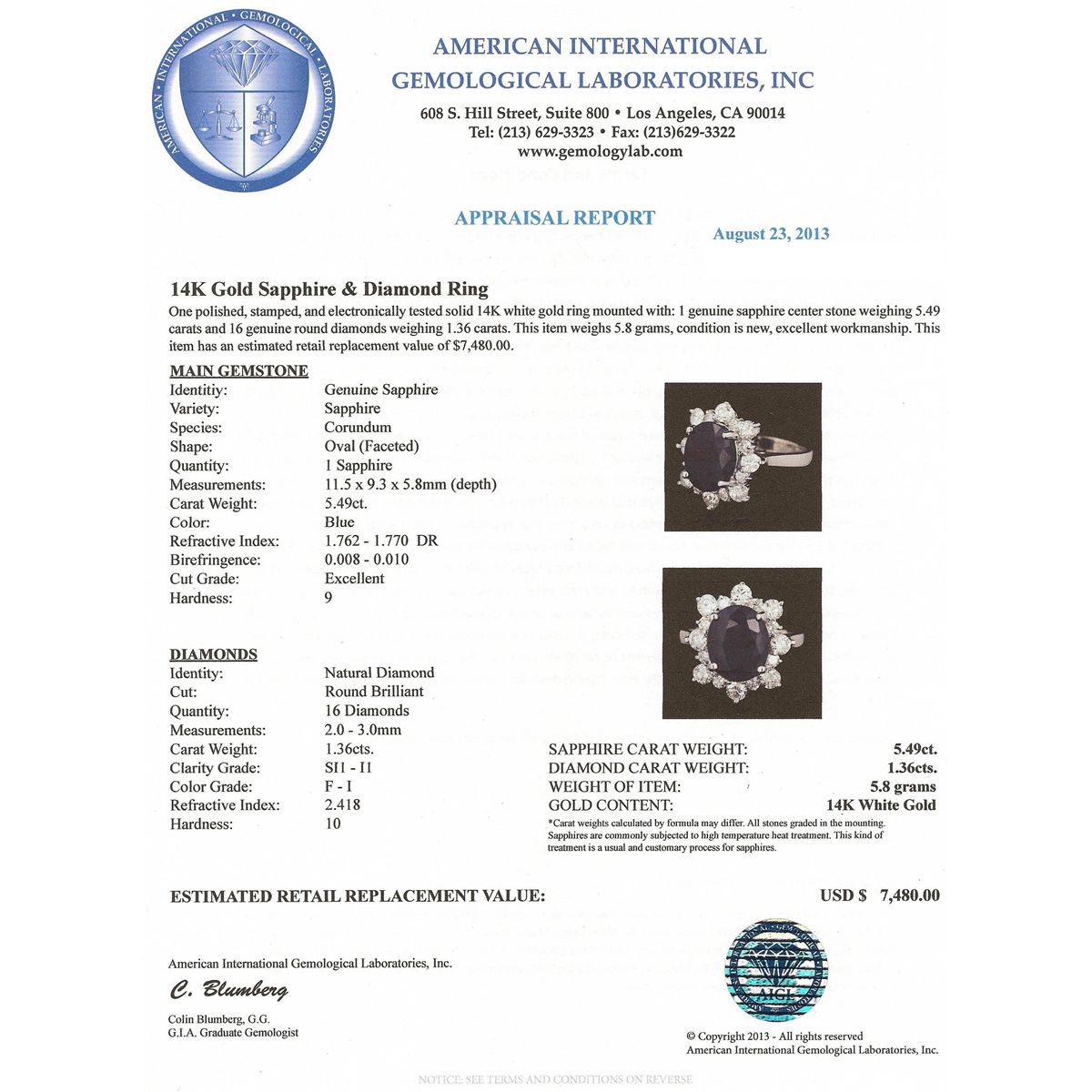 One polished, stamped, and electronically tested solid 14KT White Gold ring mounted with: 1 genuine sapphire center stone weighing 5.49 carats and 16 genuine round diamonds weighing 1.36 carats. This item weighs 5.8 grams, condition is new, excellent workmanship. AIGL Appraised at $7,480.00.