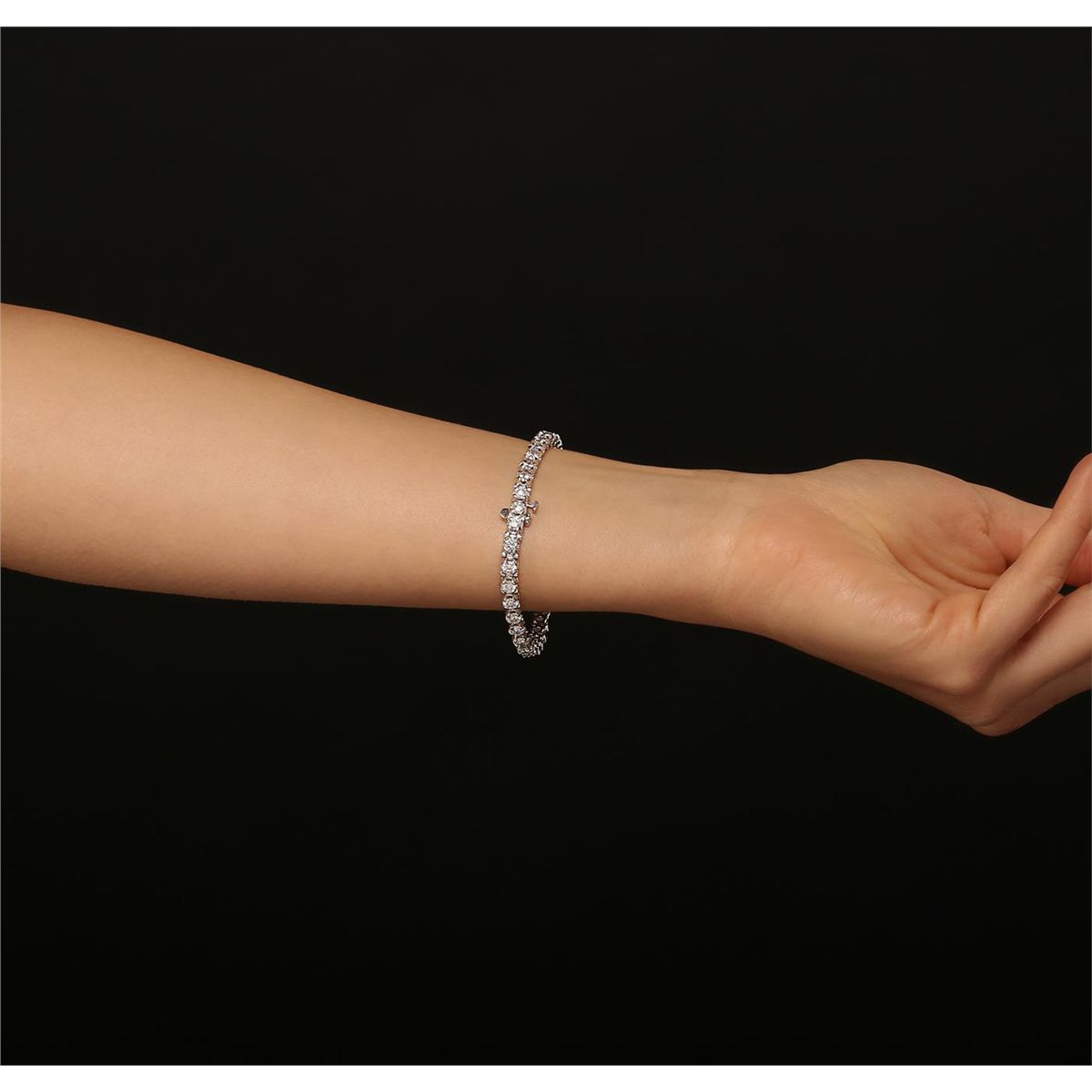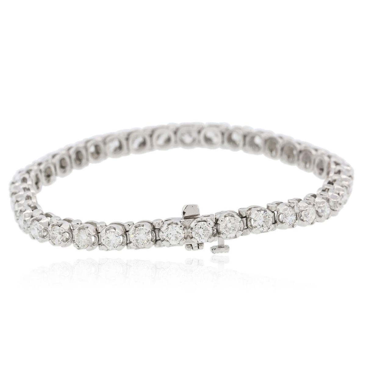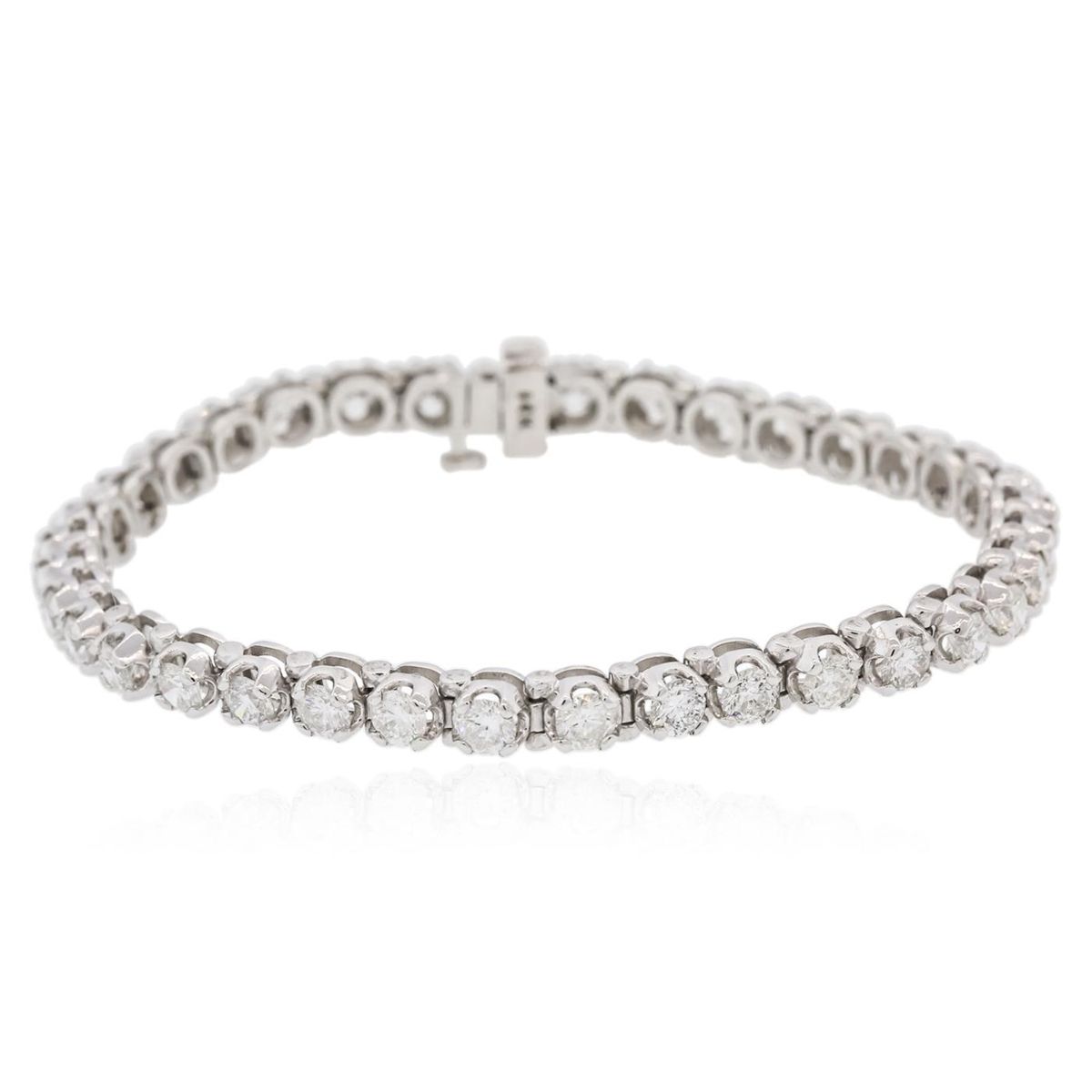 One electronically tested 14KT white gold Ladies combination cast & assembled tennis bracelet with a hidden box clasp with a bright polish finish. Condition is new. Measurements: 7" in length. Identified with markings of "14K". Containing: Thirty-Five prong set round brilliant cut diamonds, measuring 3.50 - 3.50 x 2.10mm (depth est.) approximate. Total Weight of 35 Stones = 5.49ct. Clarity: I-1 to I-2. Color: H - J, Cut is Good. All diamonds are graded in the mounting, unless otherwise stated. Total Weight of Diamonds 5.49ct. Total Weight of Bracelet 14.70 grams. GGL Appraised at $15,370.00.