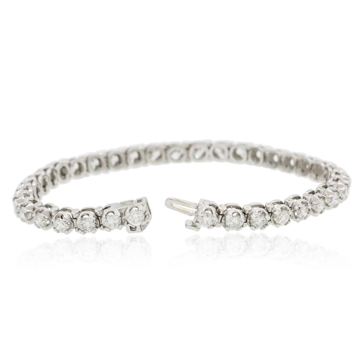 One electronically tested 14KT white gold Ladies combination cast & assembled tennis bracelet with a hidden box clasp with a bright polish finish. Condition is new. Measurements: 7" in length. Identified with markings of "14K". Containing: Thirty-Five prong set round brilliant cut diamonds, measuring 3.50 - 3.50 x 2.10mm (depth est.) approximate. Total Weight of 35 Stones = 5.49ct. Clarity: I-1 to I-2. Color: H - J, Cut is Good. All diamonds are graded in the mounting, unless otherwise stated. Total Weight of Diamonds 5.49ct. Total Weight of Bracelet 14.70 grams. GGL Appraised at $15,370.00.