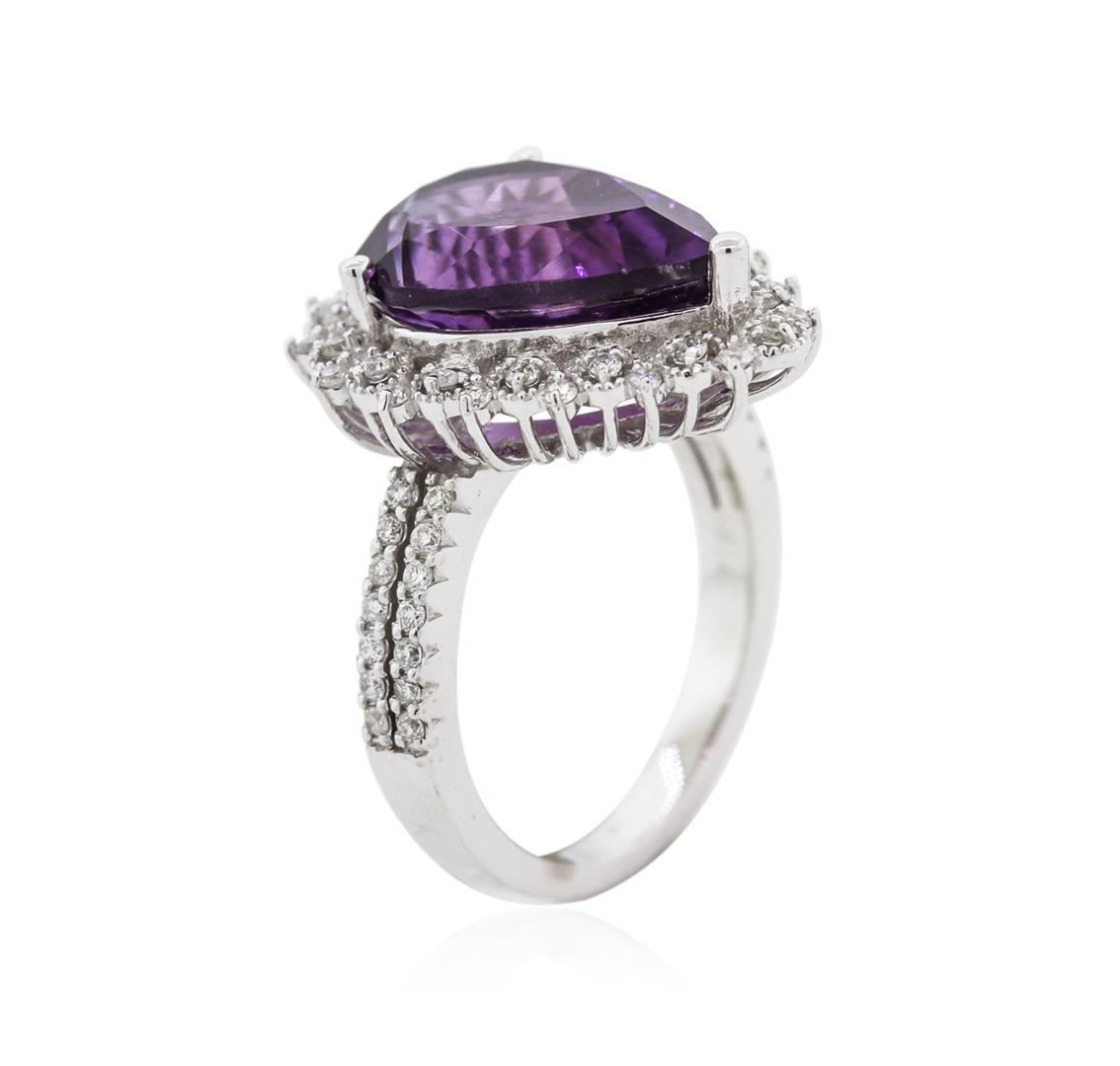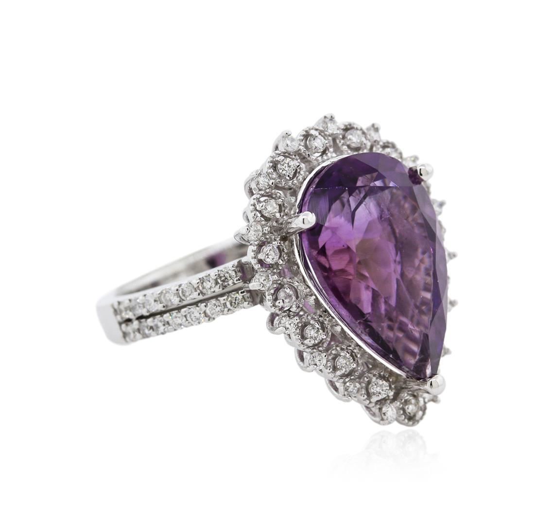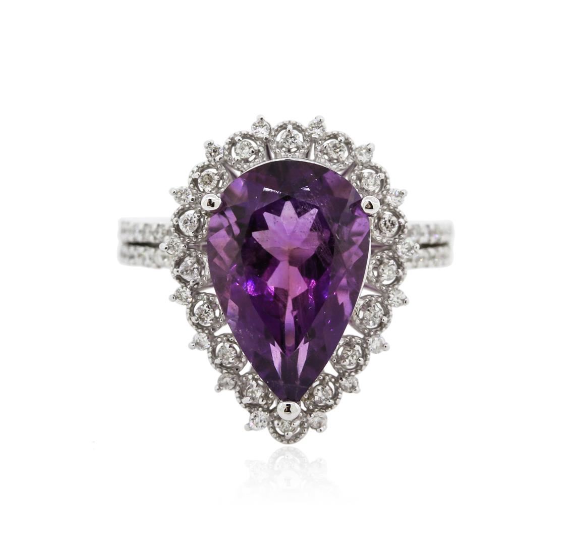 One electronically tested 14KT white gold ladies combination cast & assembled amethyst and diamond ring with a split shoulder shank with a bright polish finish. Identified with markings of "K14". Condition is new. Containing: One prong set pear modified brilliant cut natural amethyst, measuring 14.11 x 9.93 x 7.40mm, exact weight 5.50ct., clarity is eye clean, type II, medium light, moderately strong, purple color, (GIA P 4/4), cut is good. Sixty prong set round brilliant cut diamonds, measuring 1.10 - 1.10 x 0.66mm (depth est.) approximate total weight of 60 Stones = 0.41ct. Clarity: I-1 to I-2. Color: I - J, Cut is Good. All diamonds and colored gemstones are graded in the mounting, unless otherwise stated. Colored gemstones are presumed to have been subjected to commonly used enhancement processes.. Total Weight of Colored Stones 5.50ct. Total Weight of Diamonds 0.41ct. Total Weight of Ring 6.50 grams. GGL Appraised at $1,995.00.