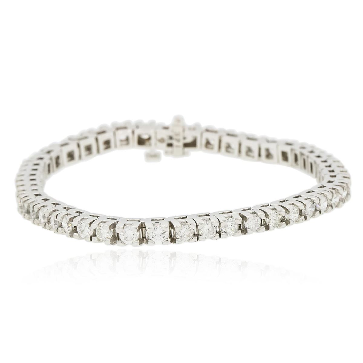 One electronically tested 14KT white gold ladies combination cast & assembled tennis bracelet with a hidden box clasp with a bright polish finish. Condition is new. Measurements: 6.75" in length. Identified with markings of "14K". Containing: Forty-Six prong set round brilliant cut diamonds, measuring 3.20 - 3.20 x 1.92mm (depth est.) approximate total weight of 46 Stones = 5.52ct. Clarity: SI-1 to I-1. Color: G - I, Cut is Good. All diamonds are graded in the mounting, unless otherwise stated. Total Weight of Diamonds 5.52ct. Total Weight of Bracelet 17.60 grams. GGL Appraised at $20,900.00.