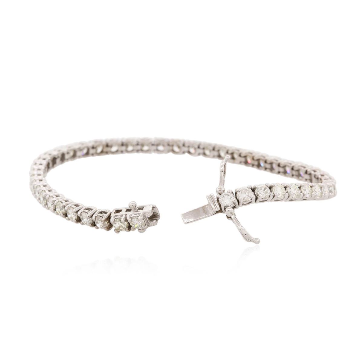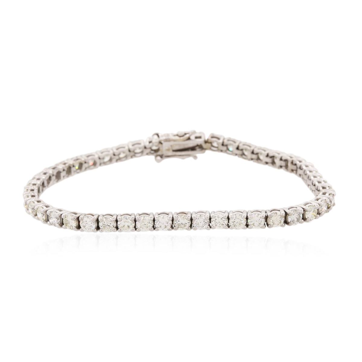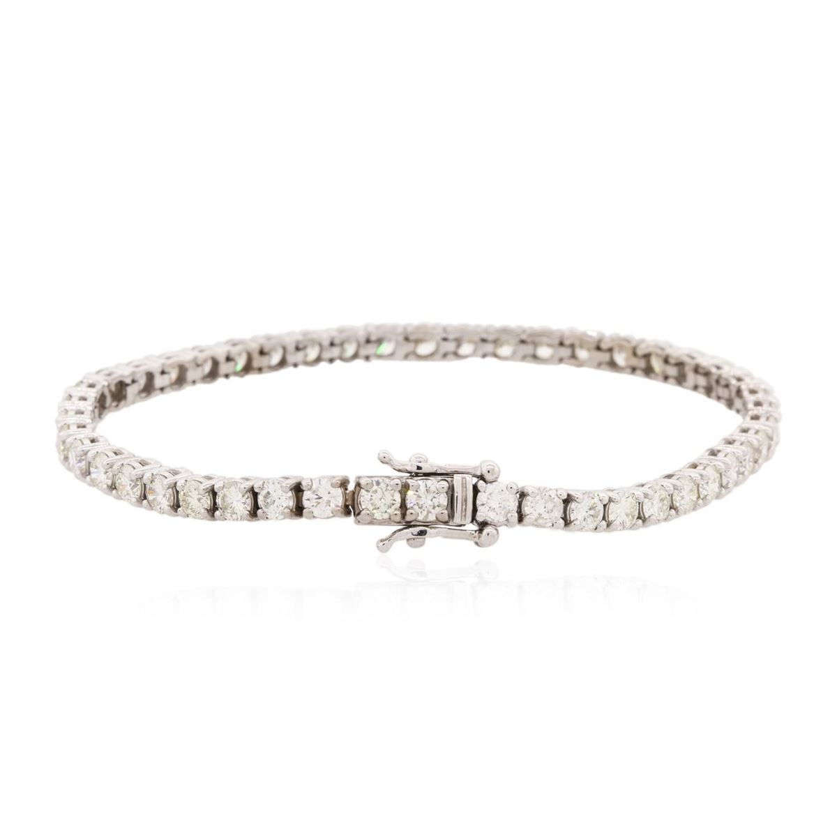 One electronically tested 14KT white gold ladies cast diamond tennis bracelet with a hidden box clasp with a bright and brushed finish. Measurements: 6.75" in length. Identified with markings of "14K". Condition is new. Containing: Forty-Six prong set round brilliant cut diamonds, measuring 3.20 - 3.20 x 1.92mm (depth est.) approximate total weight of 46 Stones = 5.52ct. Clarity: SI-2 to I-2. Color: J - K. All diamonds are graded in the mounting, unless otherwise stated. Total Weight of Diamonds 5.52ct. Total Weight of Tennis Bracelet 10.60 grams. GGL Appraised at $11,580.00.