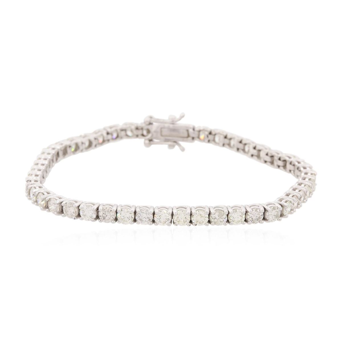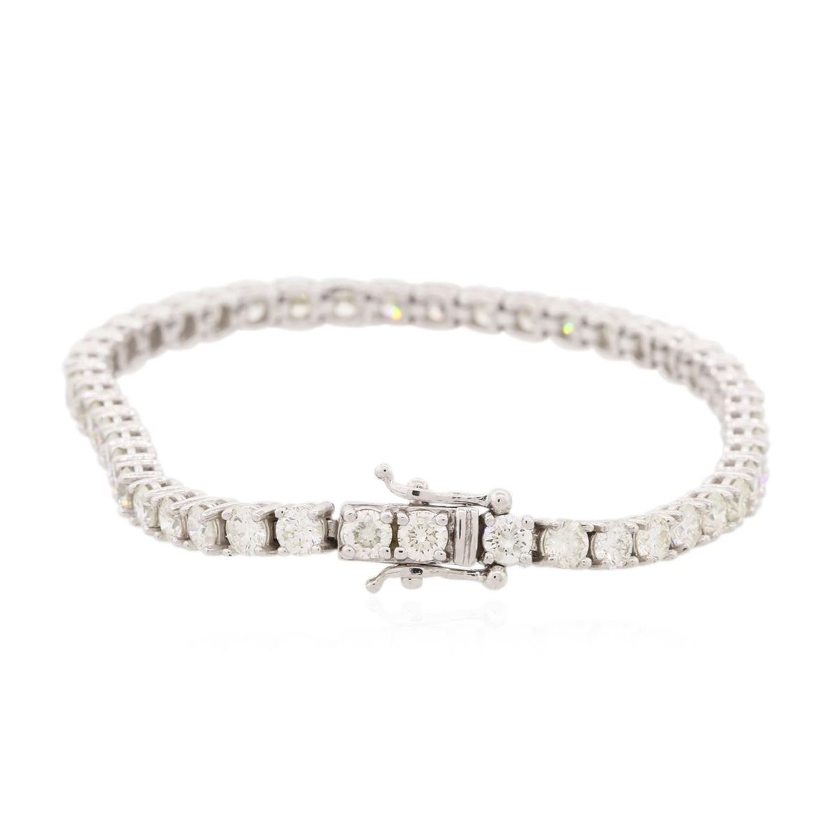 One electronically tested 14KT white gold ladies cast diamond tennis bracelet with a hidden box clasp with a bright and brushed finish. Measurements: 6.75" in length. Identified with markings of "14K". Condition is new. Containing: Forty-Six prong set round brilliant cut diamonds, measuring 3.20 - 3.20 x 1.92mm (depth est.) approximate total weight of 46 Stones = 5.52ct. Clarity: SI-2 to I-2. Color: K. All diamonds are graded in the mounting, unless otherwise stated. Total Weight of Diamonds 5.52ct. Total Weight of Tennis Bracelet 10.90 grams. GGL Appraised at $10,555.00.