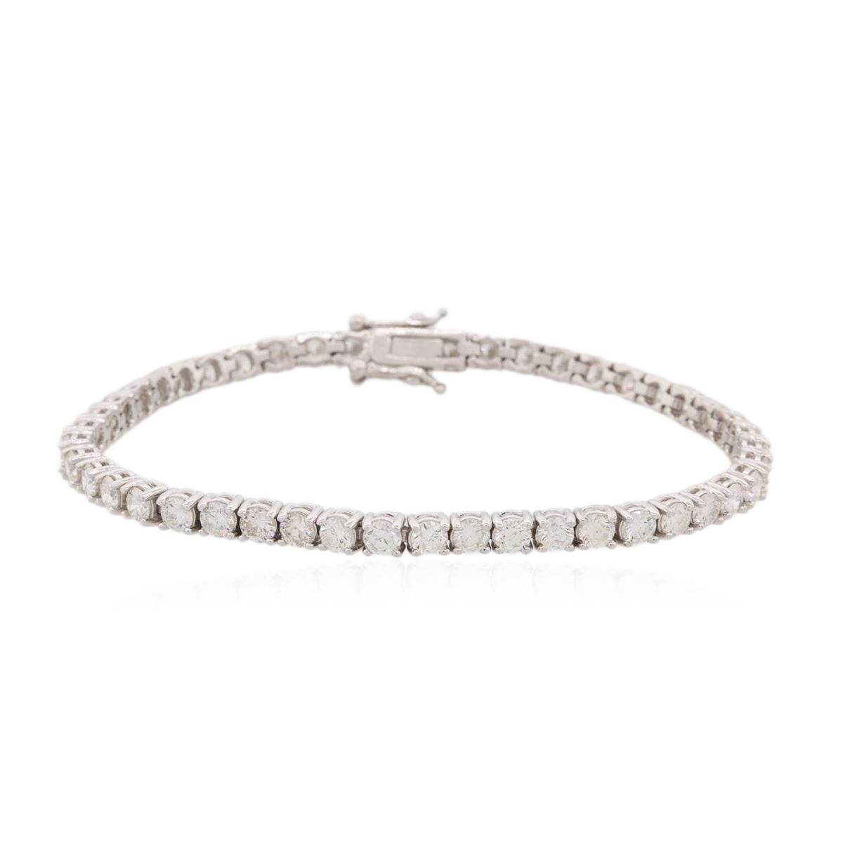 One electronically tested 14KT white gold ladies cast diamond tennis bracelet with a hidden box clasp with a bright and brushed finish. Measurements: 6.75." in length. Identified with markings of "14K". Condition is new. Containing: Forty-Six prong set round brilliant cut diamonds, measuring 3.20 - 3.20 x 1.92mm (depth est.) approximate total weight of 46 Stones = 5.52ct. Clarity: SI-2 to I-2. Color: I - K. All diamonds are graded in the mounting, unless otherwise stated. Total Weight of Diamonds 5.52ct. Total Weight of Tennis Bracelet 10.50 grams. GGL Appraised at $11,555.00.