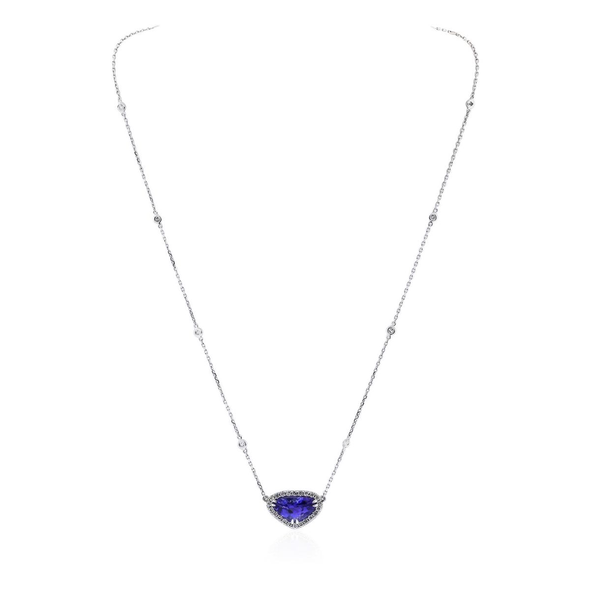 One electronically tested 14KT white gold ladies combination cast & assembled tanzanite and diamond necklace with a lobster claw clasp with a bright polish finish. Measurements: 18" in length Identified with markings of "K14". Condition is new. Containing: One prong set triangle modified brilliant cut natural tanzanite, measuring 13.86 x 8.60 x 7.68mm, approximate weight of 5.52ct., clarity is eye clean, type I, medium, moderately strong, violetish blue color, (GIA vB 5/4), cut is good. Twenty-Two bezel set round brilliant cut diamonds, measuring 1.60 - 1.60 x 0.96mm (depth est.) approximate total weight of 22 Stones = 0.33ct. Clarity: I-1 to I-2. Color: I - J, Cut is Good. Colored gemstones are presumed to have been subjected to commonly used enhancement processes. All diamonds and colored gemstones are graded in the mounting, unless otherwise stated. Total Weight of Colored Stones 5.52ct. Total Weight of Diamonds 0.33ct. Total Weight of Necklace 6.80 grams. GGL Appraised at $10,125.00.