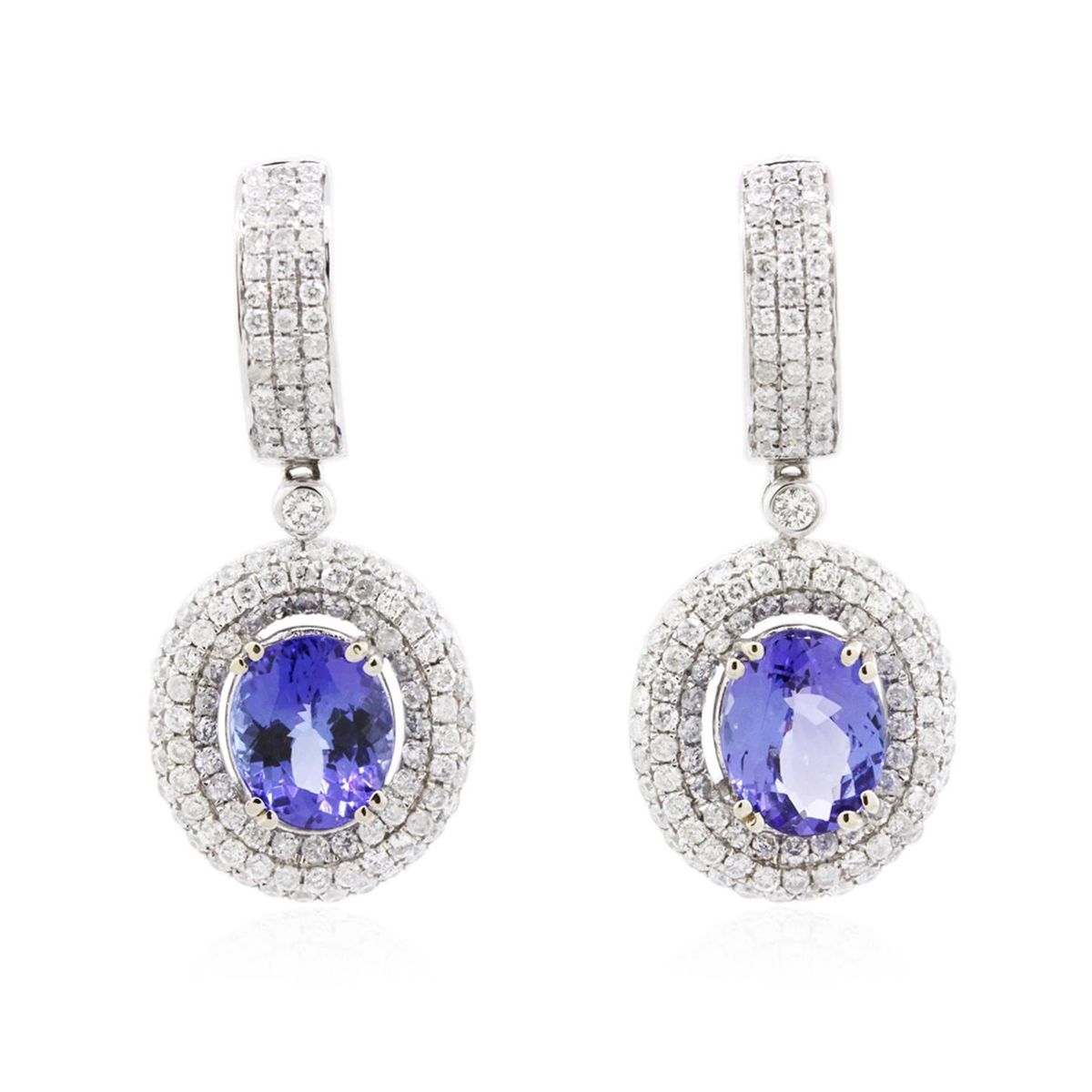 One pair electronically tested 14KT white gold ladies cast & assembled tanzanite & diamond earrings with hinged, snap locking posts. Each earring features a tanzanite set within a gallery of diamonds, supported by diamond set ribbons. Condition is good. Containing: Two prong set oval mixed cut natural tanzanites, measuring 9.50 x 7.70 x 5.30mm, 5% bulge factor, approximate total weight of 5.52ct., clarity is eye clean, type I, medium dark, very slightly grayish, bluish violet color, (GIA bV 6/3), cut is good. Measurements are an average for the pair. Transmitting light with no distortion, transparent. Graded in the setting. Tanzanite is a very rare gemstone that is only found in the country of Tanzania. Originally discovered in 1967. Tiffany & Company, named the stone Tanzanite. It is found in the Usumburu Mountains that border the Umba Valley of northern Tanzania. Tanzanite occurs in gray, brown, violet, blue, reddish-purple, & green. The gem is interesting because of its exceptional pleochroism. Rotated in different directions a tanzanite will exhibit multiple changes of color. Tanzanite has a low tolerance to ultrasonic cleaning, and should not be cleaned using this method. Two Hundred Fifty-Four prong set round brilliant cut diamonds, measuring 2.30 - 1.10 x 1.02mm (depth est.) approximate total weight of 254 Stones = 2.00ct. Graded in the setting. Clarity: I-1 to I-2. Color: G - H. Total Weight of Colored Stones 5.52ct. Total Weight of Diamonds 2.00ct. Total Weight of Earrings 11.70gm. AIG Appraised at $19,800.00.