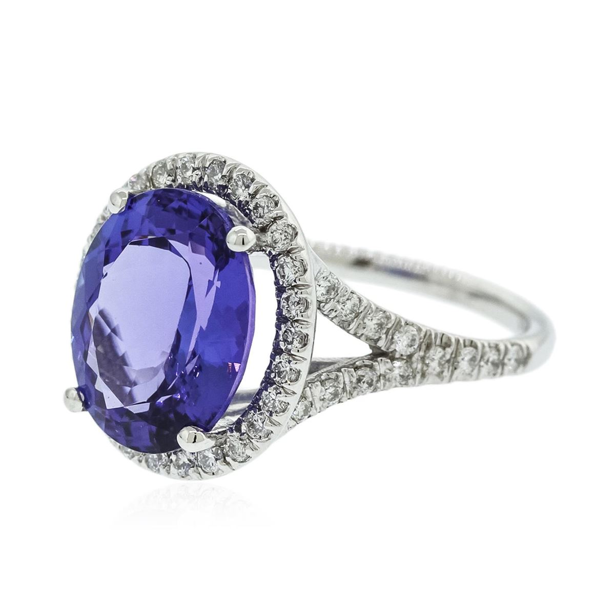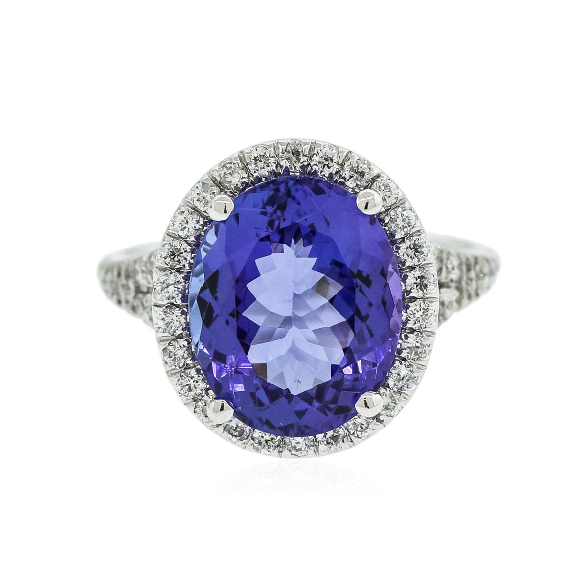 One electronically tested 14KT white gold Ladies combination cast & assembled fashion ring with a bright polish finish. Condition is new. Identified with markings of "14K". Containing: One prong set oval modified brilliant cut natural tanzanite, measuring 12.30 x 10.00 x 6.00mm, approximate weight of 5.53ct., clarity is eye clean, type I, medium, moderately strong, violetish blue color, (GIA vB 5/4), cut is very good. Colored gemstones are presumed to have been subjected to commonly used and possible undetectable color/clarity enhancement processes. Forty-Eight bead set round brilliant cut diamonds, measuring 1.50 - 1.50 x 0.90mm (depth est.) approximate total weight of 48 Stones = 0.57ct. Clarity of SI-2 to I-1, Color of I - J, Cut is Very Good. Total Weight of Colored Stones 5.53ct. Total Weight of Diamonds 0.57ct. Total Weight of Ring 4.80gm. GGL Appraised at $10,525.00.