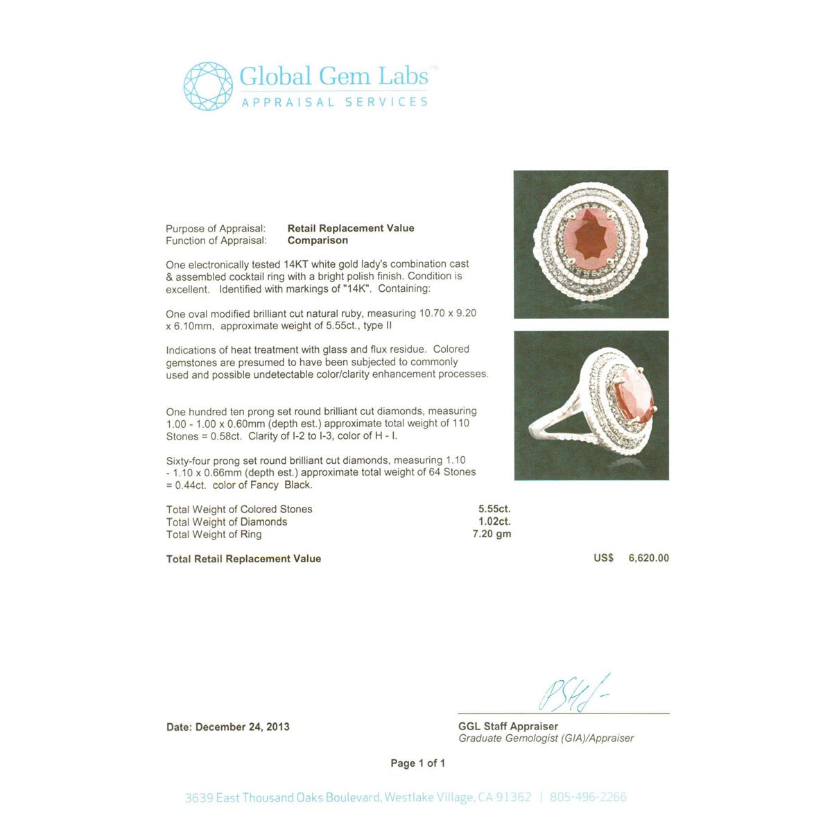 One electronically tested 14KT white gold Ladies combination cast & assembled cocktail ring with a bright polish finish. Identified with markings of "14K". Condition is excellent. Containing: One oval modified brilliant cut natural ruby, measuring 10.70 x 9.20 x 6.10mm, approximate weight of 5.55ct., type II Indications of heat treatment with glass and flux residue. Colored gemstones are presumed to have been subjected to commonly used and possible undetectable color/clarity enhancement processes. One Hundred Ten prong set round brilliant cut diamonds, measuring 1.00 - 1.00 x 0.60mm (depth est.) approximate total weight of 110 Stones = 0.58ct. Clarity of I-2 to I-3, Color of H - I. Sixty-Four prong set round brilliant cut diamonds, measuring 1.10 - 1.10 x 0.66mm (depth est.) approximate total weight of 64 Stones = 0.44ct. Total Weight of Colored Stones 5.55ct. Total Weight of Diamonds 1.02ct. Total Weight of Ring 7.20gm. GGL Appraised at $6,620.00.