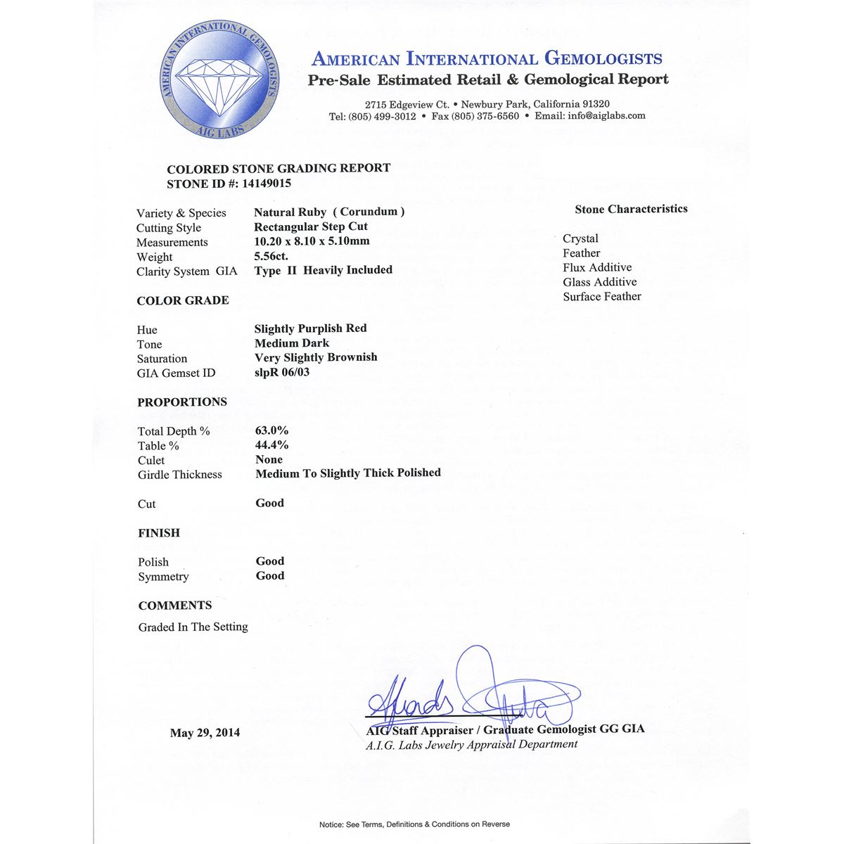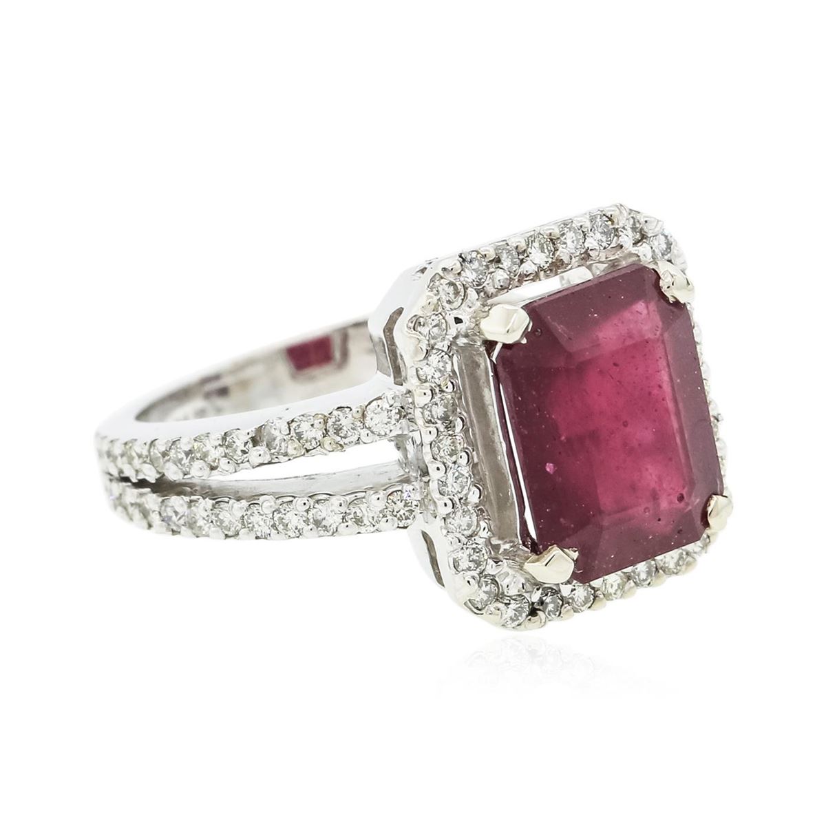 One electronically tested 14KT white gold ladies cast ruby and diamond ring with a bright polish finish. Condition is new, good workmanship. The featured ruby is set within a diamond bezel supported by diamond set split shoulders, completed by a two and one-half millimeter wide band. Identified with markings of "14K". Containing: One prong set rectangular step cut natural ruby, measuring 10.20 x 8.10 x 5.10mm, 10%. bulge factor, approximate weight of 5.56ct., clarity is heavily included, type II, medium dark, very slightly brownish, slightly purplish red color, (GIA slpR 6/3), cut is good. Transmitting light somewhat diffusely, transparent to translucent. Naturally occurring internal & external characteristics are present. Indications of laboratory high temperature heat treatment, with glass & flux additives. Colored Stone Grading Report attached. Graded in the setting. Ruby has a low tolerance to rhodium plating, repolishing the surface, & ultrasonic cleaning. Seventy-Eight prong set round brilliant cut diamonds, measuring 1.40 - 1.30 x 0.81mm (depth est.) approximate. Total Weight of 78 Stones = 0.80ct. Graded in the setting. Clarity: SI-1 to I-1 . Color: H - J. Total Weight of Colored Stones 5.56ct.. Total Weight of Diamonds 0.80ct.. Total Weight of Ring 7.56gm. AIG Appraised at $5,415.00.
