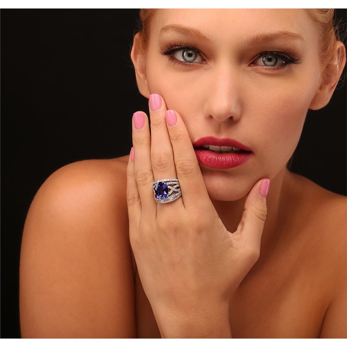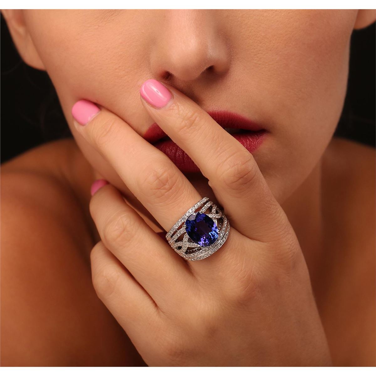 One electronically tested 14KT white gold Ladies combination cast & assembled ring with a bright polish finish. Condition is new. Identified with markings of "14K". Containing: One prong set oval modified brilliant cut natural tanzanite, measuring 13.42 x 10.63 x 5.74mm, approximate weight of 5.56ct., clarity is eye clean, type I, medium dark, moderately strong, bluish violet color, (GIA bV 6/4), cut is very good. Colored gemstones are presumed to have been subjected to commonly used color/clarity enhancement processes. One Hundred Twenty-Six prong set round brilliant cut diamonds, measuring 1.50 - 1.50 x 0.90mm (depth est.) approximate. Total Weight of 126 Stones = 1.55ct. Clarity: SI-2 to I-1. Color: H - I, Cut is Good. Total Weight of Colored Stones 5.56ct. Total Weight of Diamonds 1.55ct. Total Weight of Ring 11.00 grams. GGL Appraised at $14,725.00.