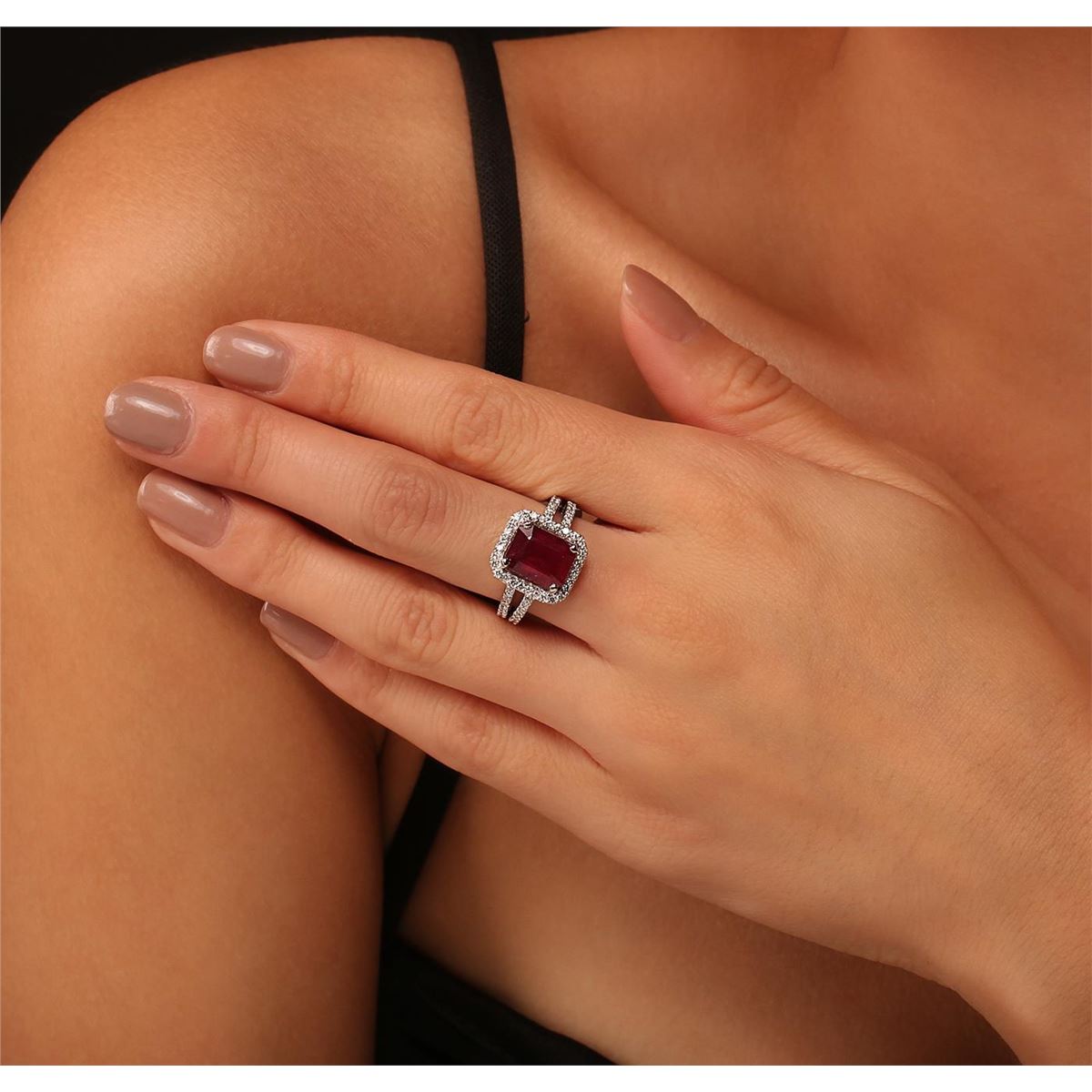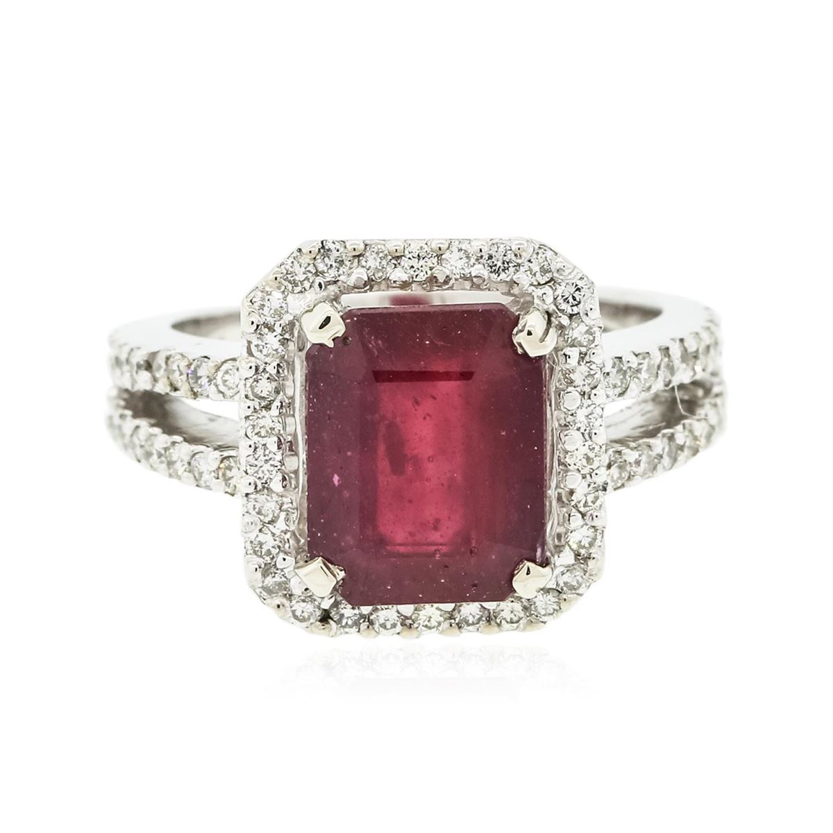 One electronically tested 14KT white gold ladies cast ruby and diamond ring with a bright polish finish. Condition is new, good workmanship. The featured ruby is set within a diamond bezel supported by diamond set split shoulders, completed by a two and one-half millimeter wide band. Identified with markings of "14K". Containing: One prong set rectangular step cut natural ruby, measuring 10.20 x 8.10 x 5.10mm, 10%. bulge factor, approximate weight of 5.56ct., clarity is heavily included, type II, medium dark, very slightly brownish, slightly purplish red color, (GIA slpR 6/3), cut is good. Transmitting light somewhat diffusely, transparent to translucent. Naturally occurring internal & external characteristics are present. Indications of laboratory high temperature heat treatment, with glass & flux additives. Colored Stone Grading Report attached. Graded in the setting. Ruby has a low tolerance to rhodium plating, repolishing the surface, & ultrasonic cleaning. Seventy-Eight prong set round brilliant cut diamonds, measuring 1.40 - 1.30 x 0.81mm (depth est.) approximate. Total Weight of 78 Stones = 0.80ct. Graded in the setting. Clarity: SI-1 to I-1 . Color: H - J. Total Weight of Colored Stones 5.56ct.. Total Weight of Diamonds 0.80ct.. Total Weight of Ring 7.56gm. AIG Appraised at $5,415.00.