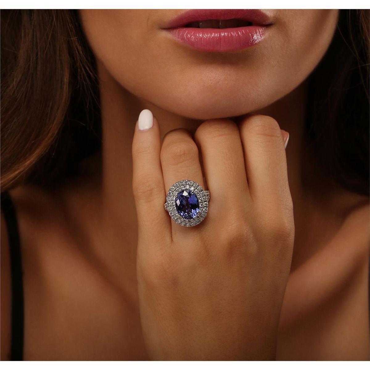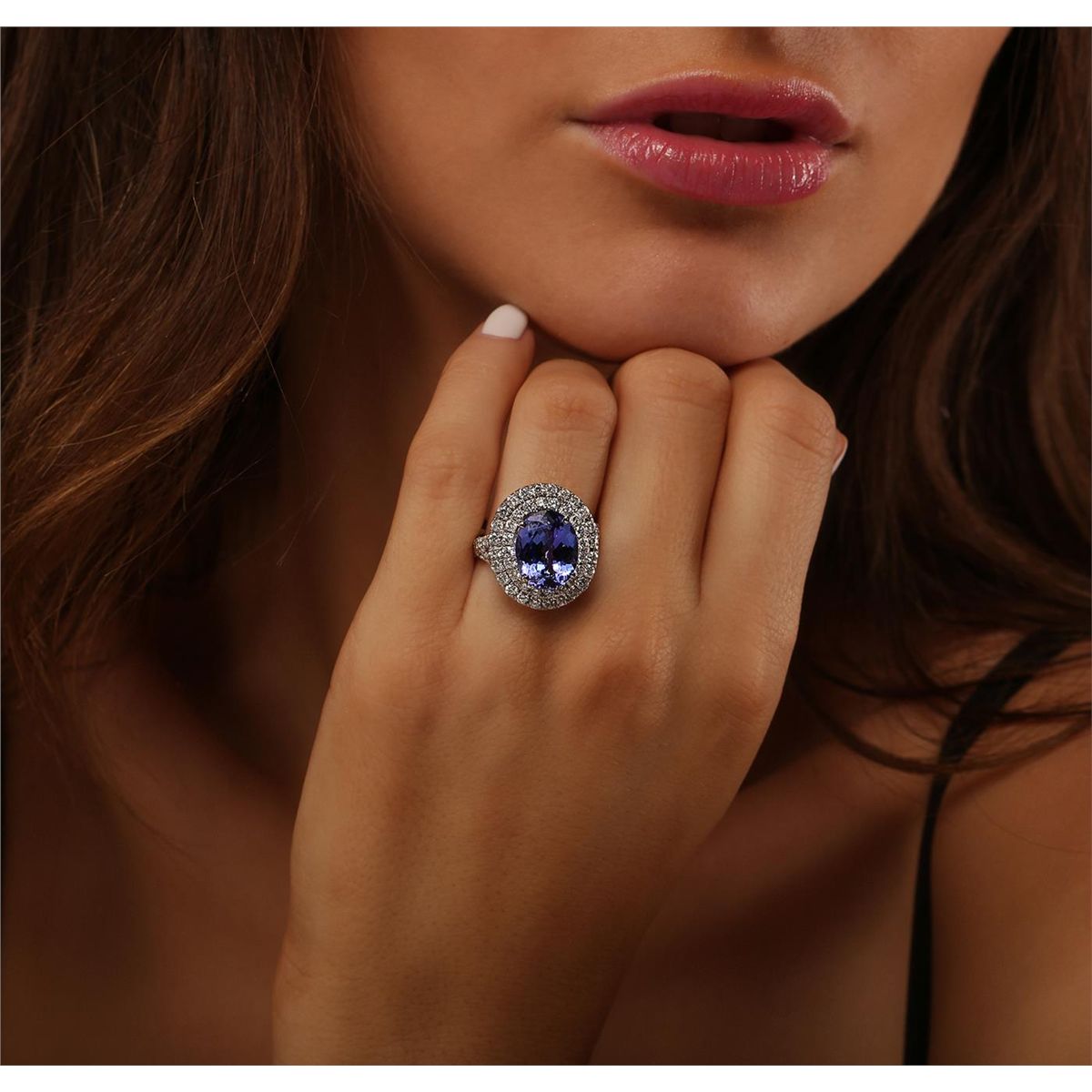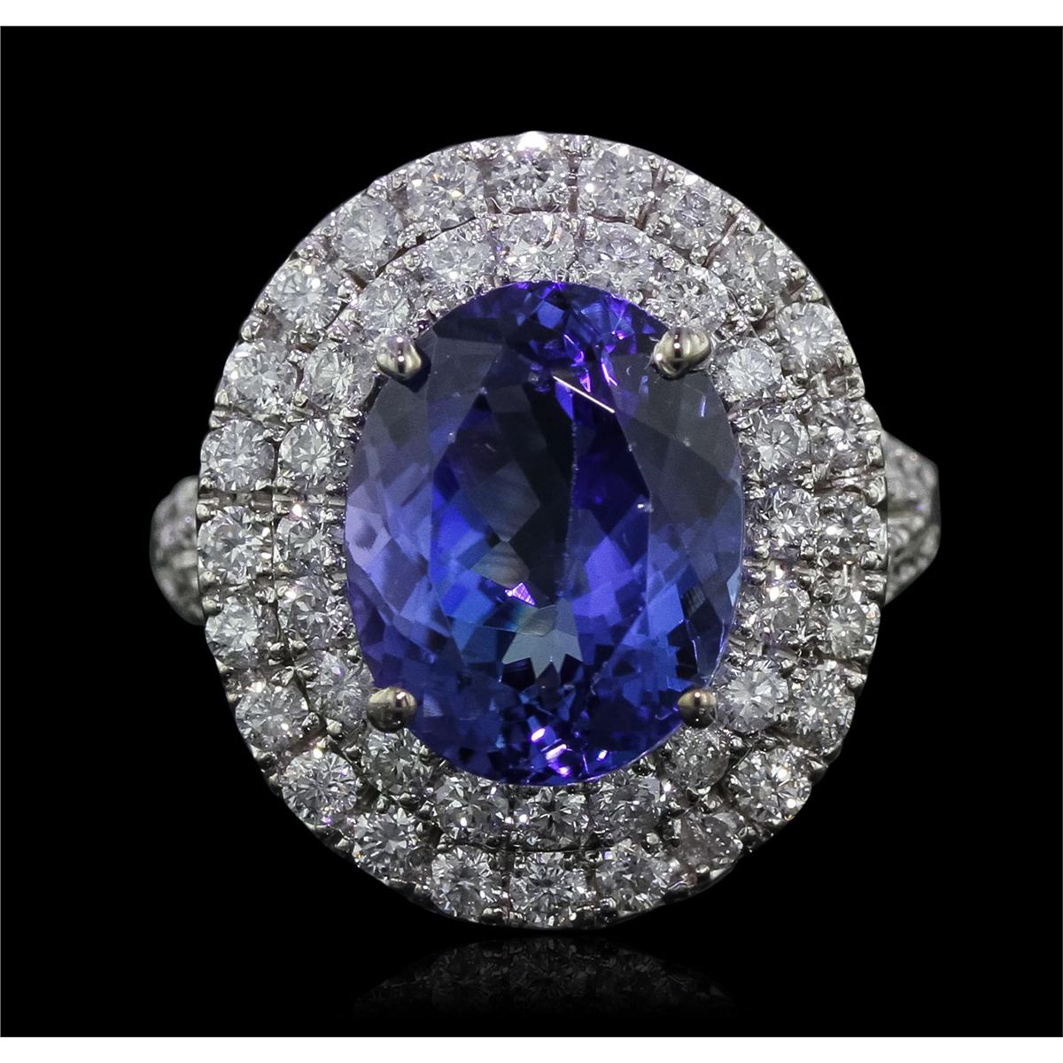 One electronically tested 14KT white gold Ladies combination cast & assembled ring with a bright polish finish. Condition is new. Identified with markings of "14K". Containing: One prong set oval modified brilliant cut natural tanzanite, measuring 12.60 x 10.00 x 6.50mm, approximate weight of 5.56ct., clarity is eye clean, type I, medium, moderately strong, bluish violet color, (GIA bV 5/4), cut is good. Colored gemstones are presumed to have been subjected to commonly used color/clarity enhancement processes. Sixty-Eight prong set round brilliant cut diamonds, measuring 1.70 - 1.70 x 1.02mm (depth est.) approximate. Total Weight of 68 Stones = 1.22ct. Clarity: I-1 to I-2. Color: I - J, Cut is Good. Total Weight of Colored Stones 5.56ct. Total Weight of Diamonds 1.22ct. Total Weight of Ring 8.00 grams. GGL Appraised at $11,815.00.