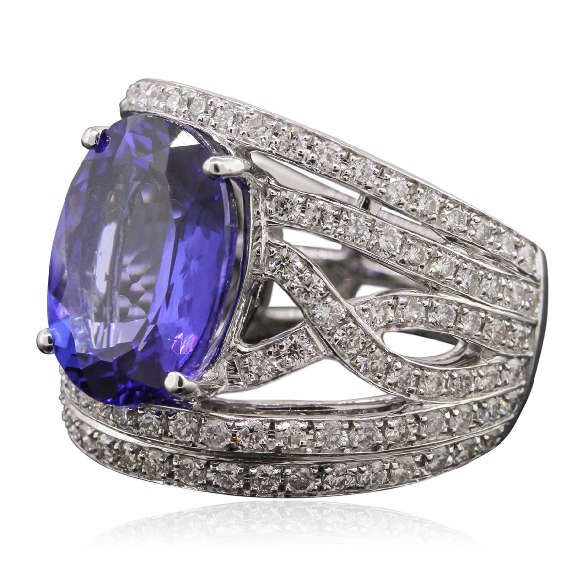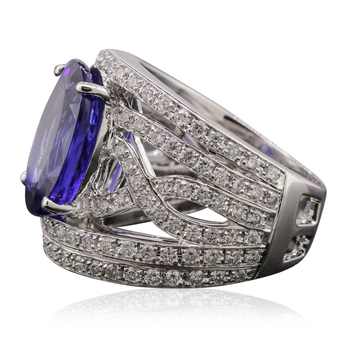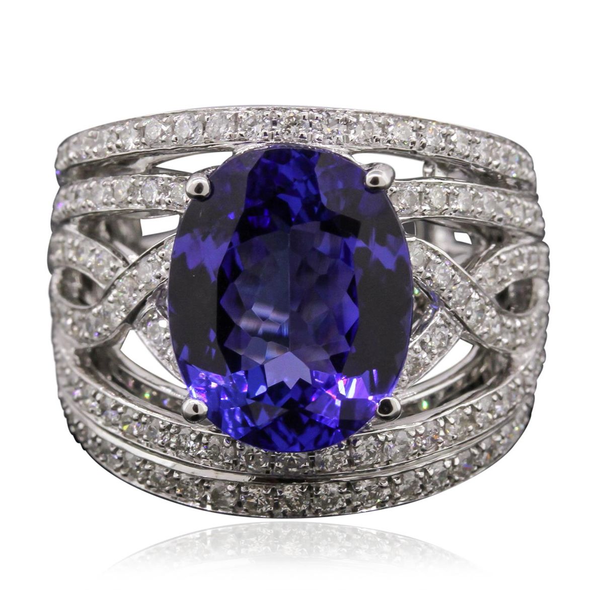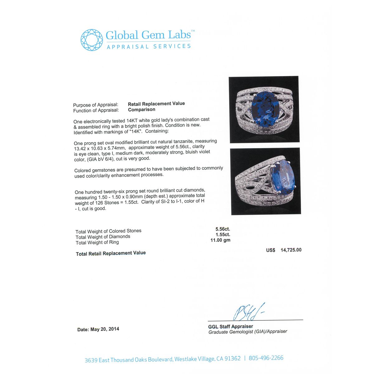 One electronically tested 14KT white gold Ladies combination cast & assembled ring with a bright polish finish. Condition is new. Identified with markings of "14K". Containing: One prong set oval modified brilliant cut natural tanzanite, measuring 13.42 x 10.63 x 5.74mm, approximate weight of 5.56ct., clarity is eye clean, type I, medium dark, moderately strong, bluish violet color, (GIA bV 6/4), cut is very good. Colored gemstones are presumed to have been subjected to commonly used color/clarity enhancement processes. One Hundred Twenty-Six prong set round brilliant cut diamonds, measuring 1.50 - 1.50 x 0.90mm (depth est.) approximate. Total Weight of 126 Stones = 1.55ct. Clarity: SI-2 to I-1. Color: H - I, Cut is Good. Total Weight of Colored Stones 5.56ct. Total Weight of Diamonds 1.55ct. Total Weight of Ring 11.00 grams. GGL Appraised at $14,725.00.
