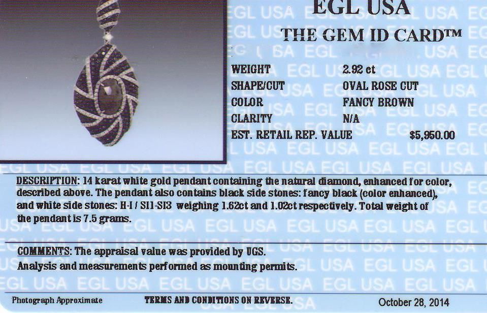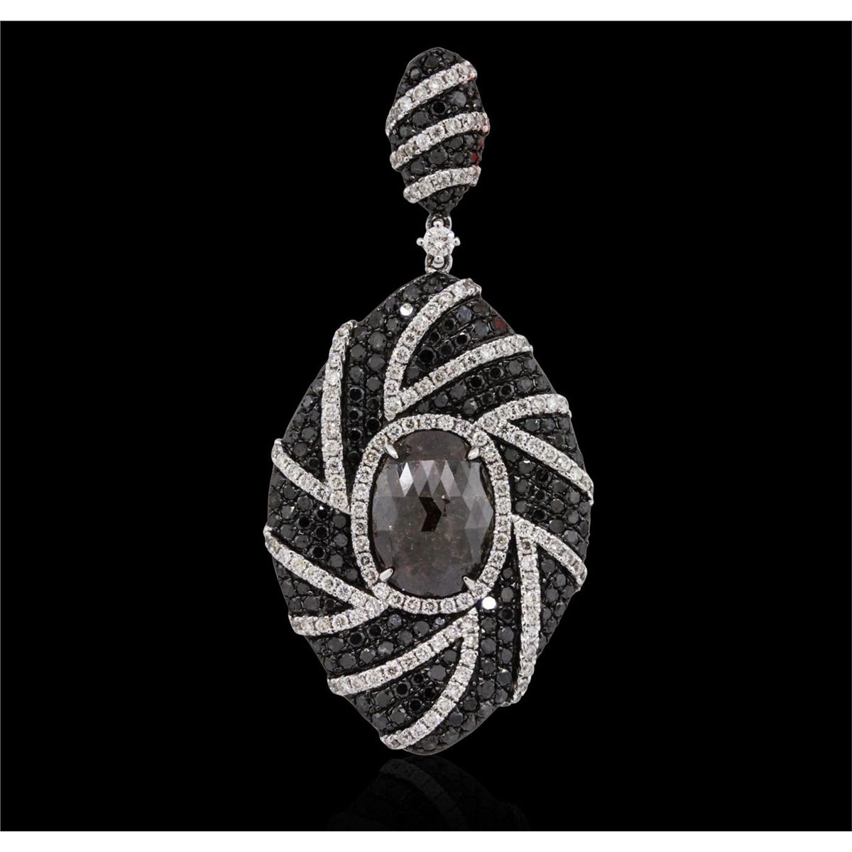 One 14KT white gold pendant containing one natural oval rose cut fancy black diamond, enhanced for color, with a total weight of 2.92ct. The pendant also contains black side stones: fancy black (color enhanced), and white side stones: H-I / SI1-SI3 weighing 1.62ct and 1.02ct respectively. Total weight of the pendant is 7.50 grams. EGL Appraised at $5,950.00.