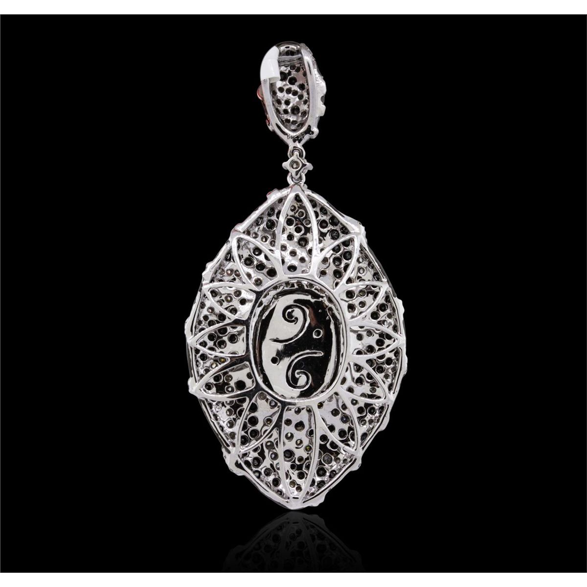 One 14KT white gold pendant containing one natural oval rose cut fancy black diamond, enhanced for color, with a total weight of 2.92ct. The pendant also contains black side stones: fancy black (color enhanced), and white side stones: H-I / SI1-SI3 weighing 1.62ct and 1.02ct respectively. Total weight of the pendant is 7.50 grams. EGL USA Appraised.