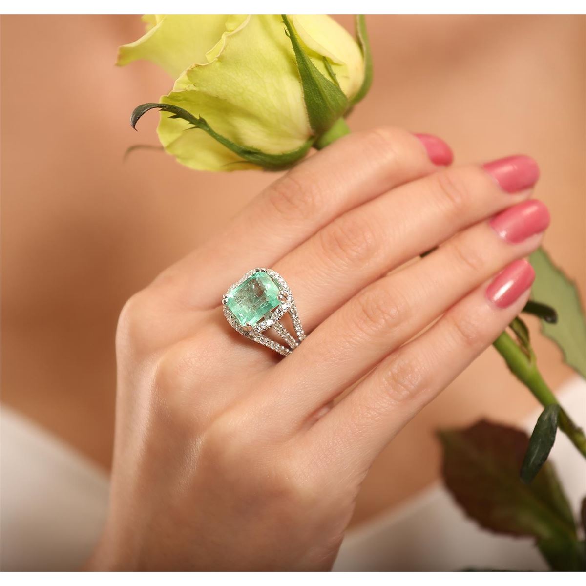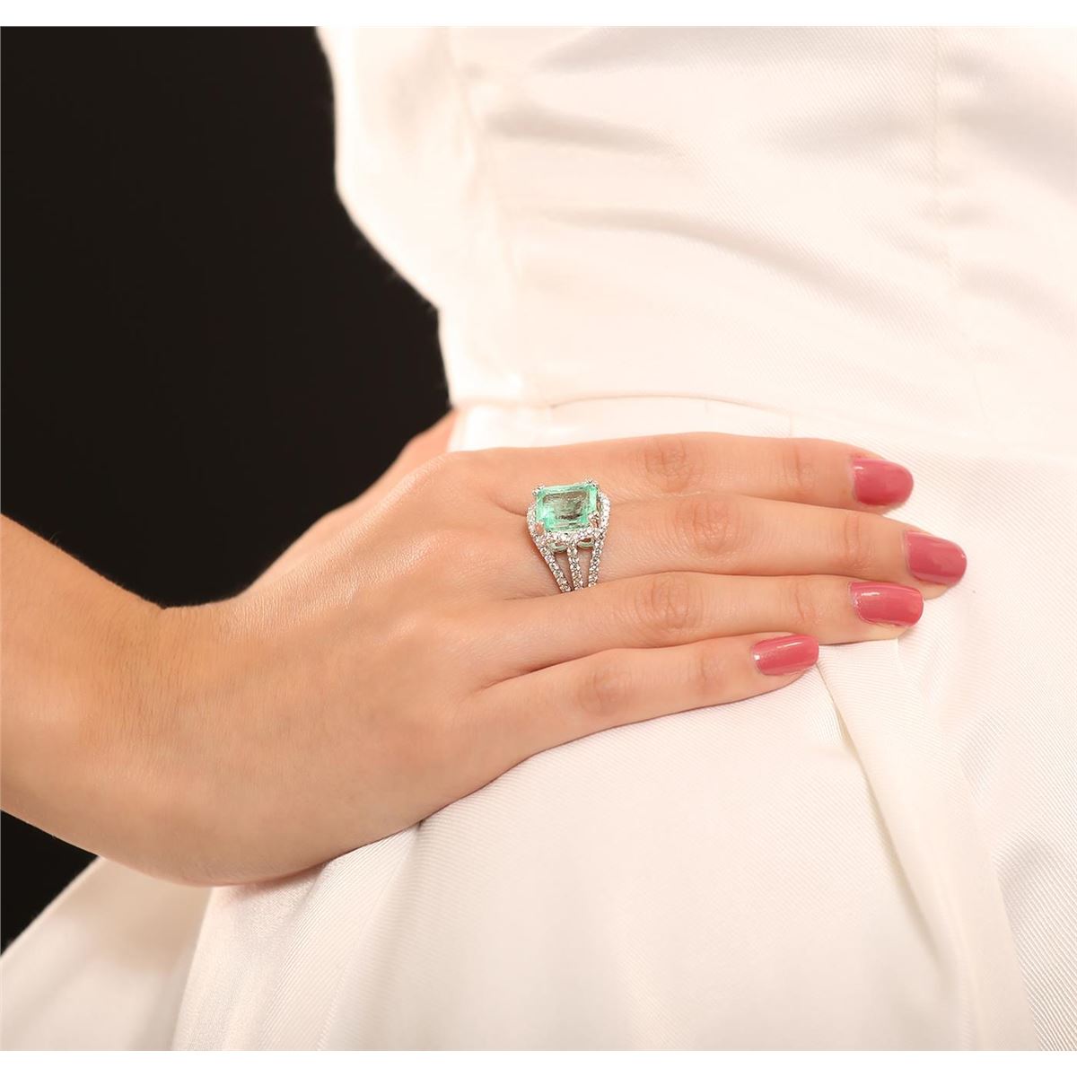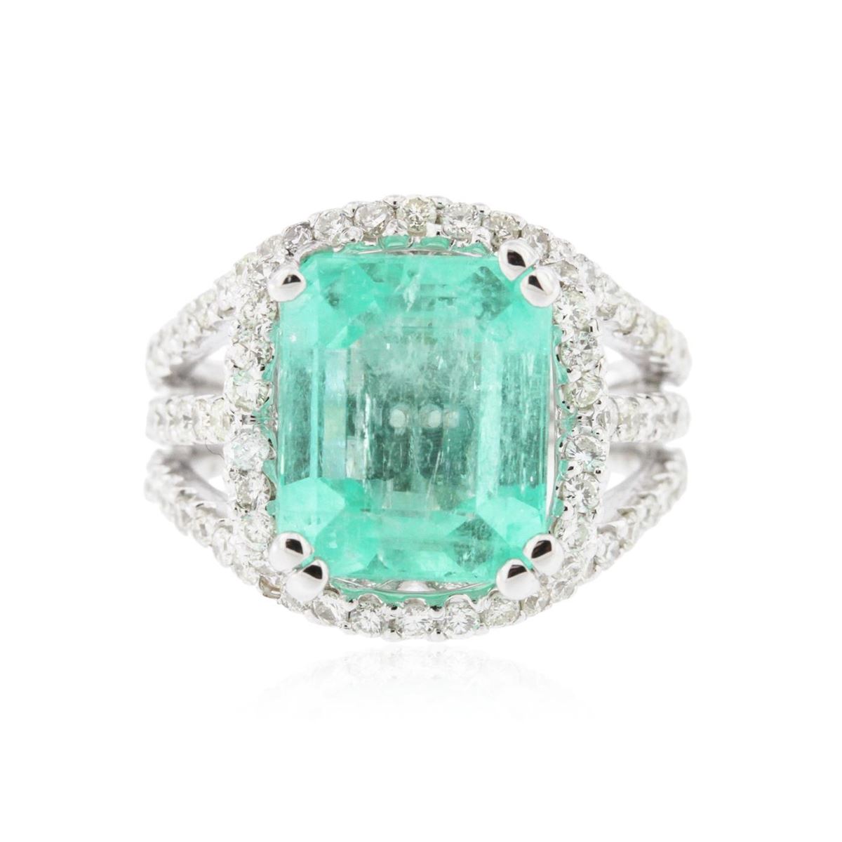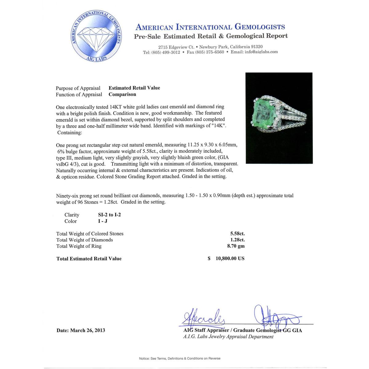 One electronically tested 14KT white gold ladies cast emerald and diamond ring with a bright polish finish. Condition is new, good workmanship. The featured emerald I set within diamond bezel, supported by split shoulders and completed by a three and one-half millimeter wide band. Identified with markings of "K14". Containing: One prong set rectangular step cut natural emerald, measuring 11.25 x 9.30 x 6.05mm, 65 bulge factor, approximate weight of 5.58ct., clarity is moderately included, type III, medium light, very slightly grayish, very slightly bluish green color, (GIA vslbG 4/3), cut is good. Transmitting light with a minimum of distortion, transparent. Naturally occurring internal & external characteristics are present. Indications of oil, & opticon residue. Colored stone grading report attached. Graded in the setting. Ninety-six prong set round brilliant cut diamonds, measuring 1.50 - 1.50 x 0.90mm (depth est.) approximate total weight of 96 stones = 1.28ct. Graded in the setting. Clarity SI-2 to I-2. Color I-J. Total weight of emerald 5.58ct. Total weight of diamonds 1.28ct. Total weight of Ring 8.70gm. AIG Appraised at $10,800.00.
