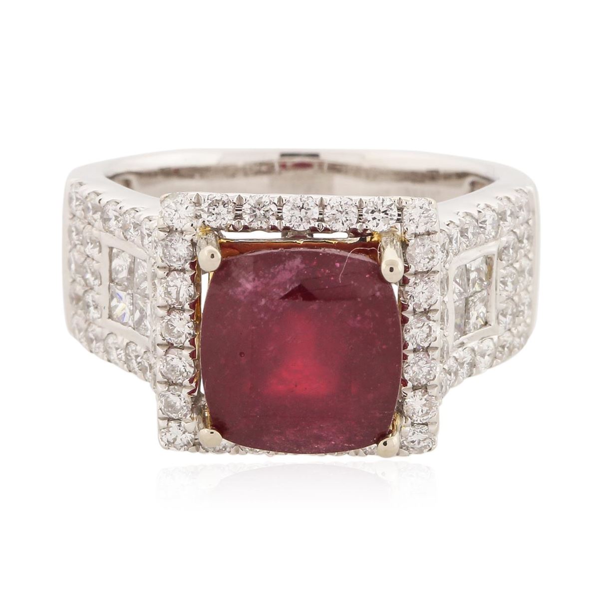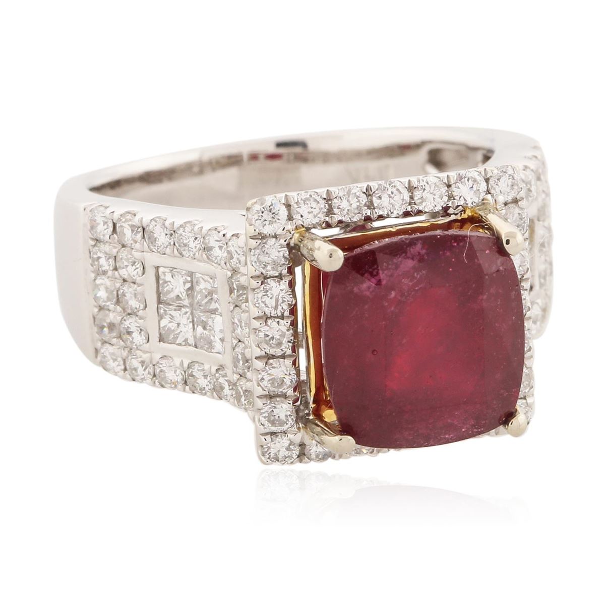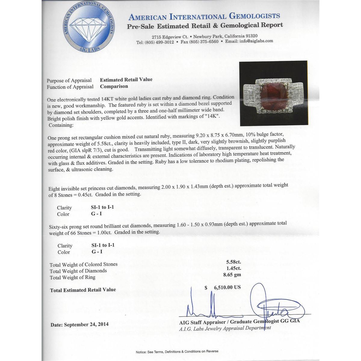 One electronically tested 14KT white ladies cast ruby and diamond ring. Condition is new, good workmanship. The featured ruby us set within a diamond bezel supported by diamond set shoulders, completed by a three and one-half millimeter wide band. Bright polish finish with yellow gold accents. Identified with markings of "14KT". Containing: One prong set rectangular cushion mixed cut natural ruby, measuring 9.20 x 8.75 x 6.70mm, 10% bulge factor, approximate weight of 5.58ct, clarity is heavily included, type II, dark, very slightly brownish, slightly purplish red color, (GIA slpR 7/3), cut is good. Transmitting light somewhat diffusely, transparent to translucent. Naturally occurring internal & external characteristics are present. Indications of laboratory high temperature heat treatment, with glass & flux additives. Graded in the setting. Ruby has a low tolerance to rhodium plating, repolishing the surface, & ultrasonic cleaning. Eight invisible set princess cut diamonds, measuring 2.00 x 1.90 x 1.43mm (depth est.) approximate total weight of 8 stones = 0.45ct. Graded in the setting. Sixty-six prong set round brilliant cut diamonds, measuring 1.60 - 1.50 x 0.93mm (depth est.) approximate total weight of 66 Stones = 1.00ct. Graded in the setting. Clarity SI-1 to I-1. Color G-1. Total Weight of Colored Stones 5.58ct. Total Weight of Diamonds 1.45ct. Total Weight of Ring 8.65 grams. AIG Appraised at $6,510.00.