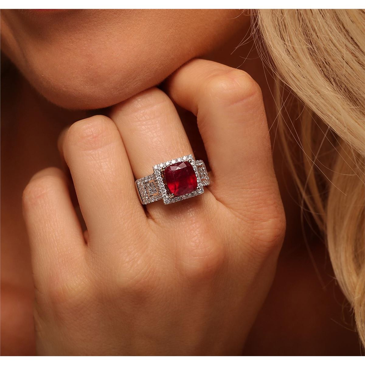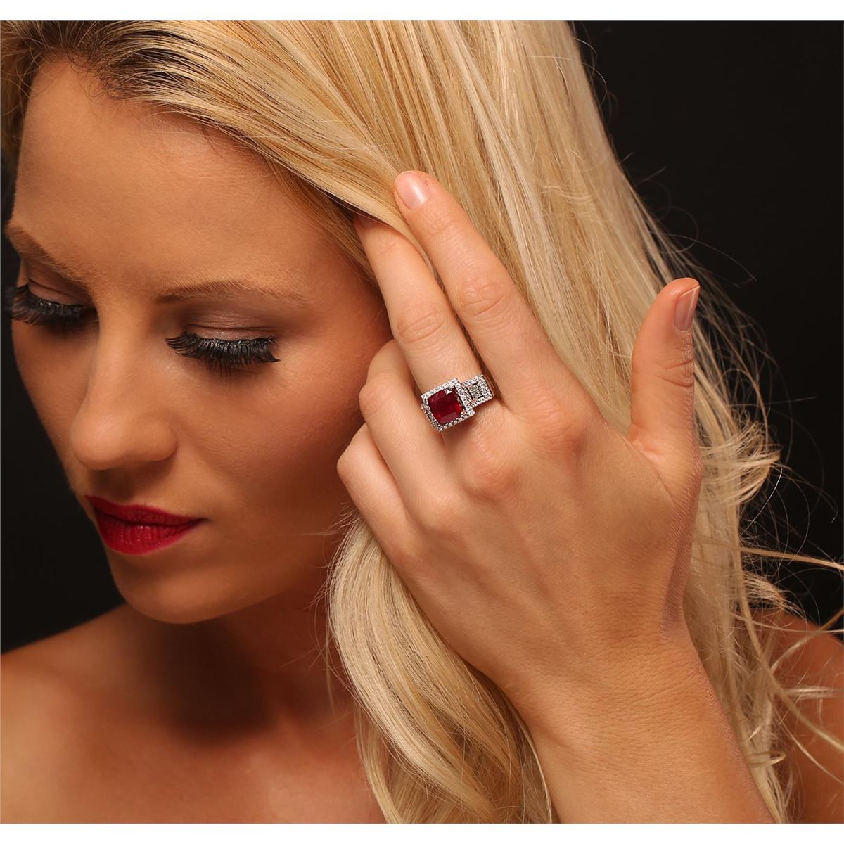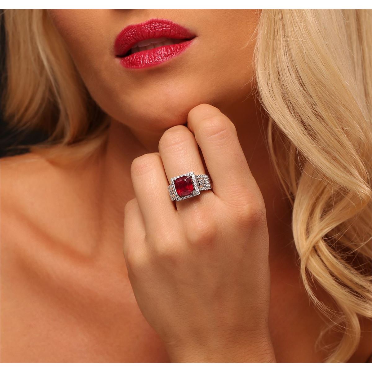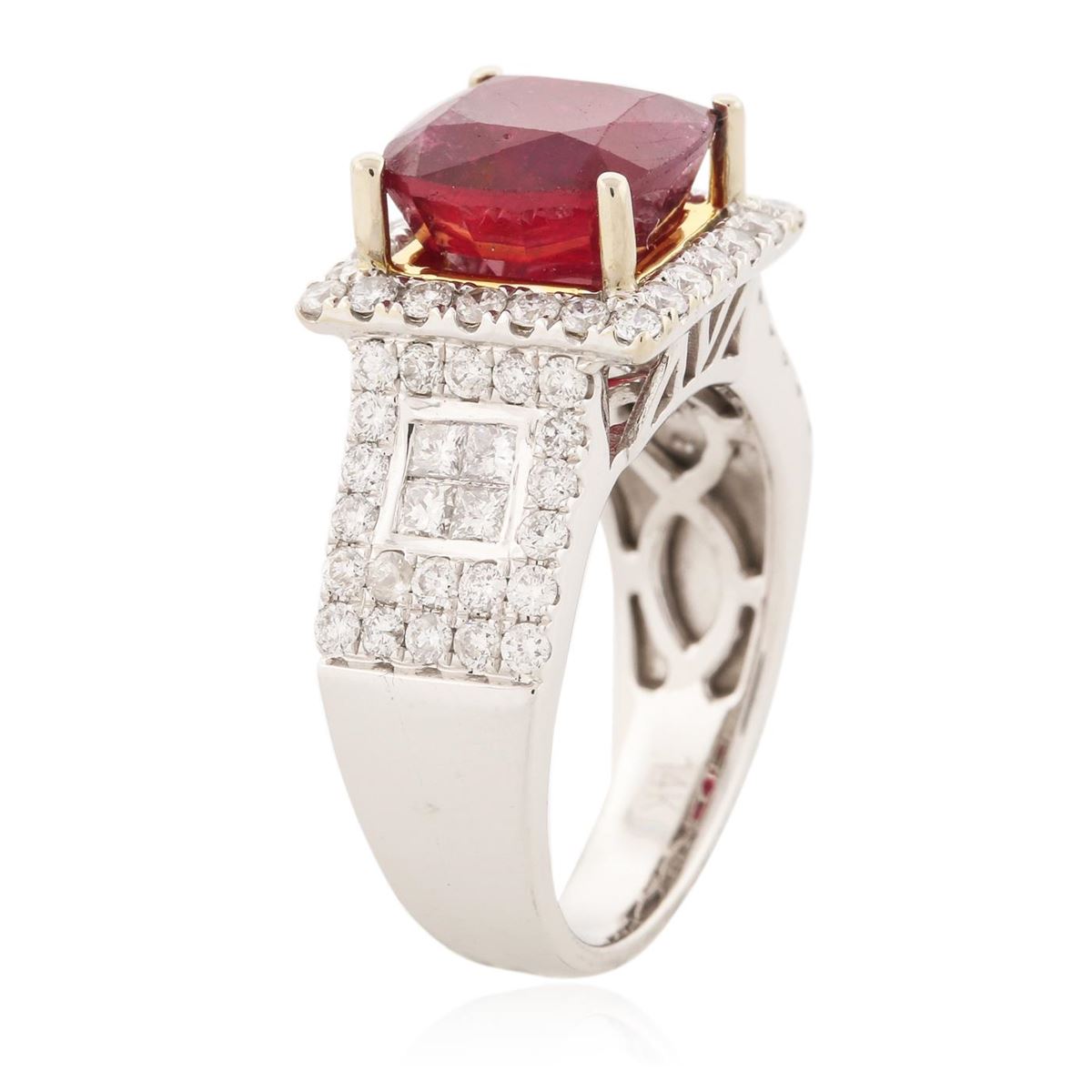 One electronically tested 14KT white ladies cast ruby and diamond ring. Condition is new, good workmanship. The featured ruby us set within a diamond bezel supported by diamond set shoulders, completed by a three and one-half millimeter wide band. Bright polish finish with yellow gold accents. Identified with markings of "14KT". Containing: One prong set rectangular cushion mixed cut natural ruby, measuring 9.20 x 8.75 x 6.70mm, 10% bulge factor, approximate weight of 5.58ct, clarity is heavily included, type II, dark, very slightly brownish, slightly purplish red color, (GIA slpR 7/3), cut is good. Transmitting light somewhat diffusely, transparent to translucent. Naturally occurring internal & external characteristics are present. Indications of laboratory high temperature heat treatment, with glass & flux additives. Graded in the setting. Ruby has a low tolerance to rhodium plating, repolishing the surface, & ultrasonic cleaning. Eight invisible set princess cut diamonds, measuring 2.00 x 1.90 x 1.43mm (depth est.) approximate total weight of 8 stones = 0.45ct. Graded in the setting. Sixty-six prong set round brilliant cut diamonds, measuring 1.60 - 1.50 x 0.93mm (depth est.) approximate total weight of 66 Stones = 1.00ct. Graded in the setting. Clarity SI-1 to I-1. Color G-1. Total Weight of Colored Stones 5.58ct. Total Weight of Diamonds 1.45ct. Total Weight of Ring 8.65 grams. AIG Appraised at $6,510.00.