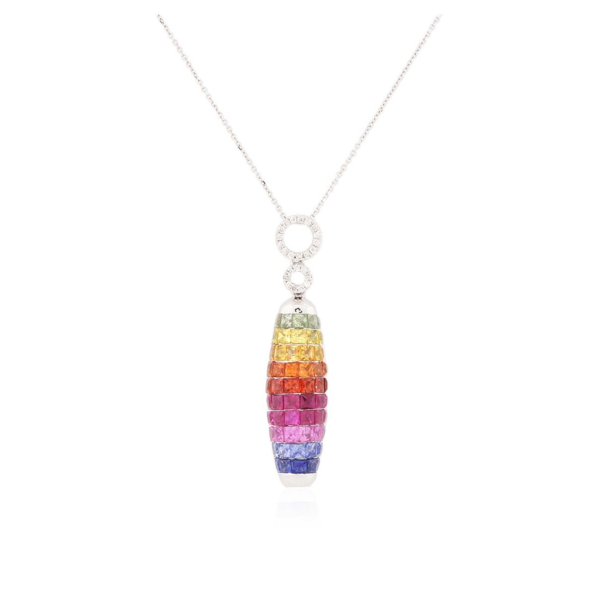 One pendant with chain featuring: 14KT white gold weighing 4.10 grams containing multicolor sapphires with a total weight of 5.58ct and diamonds with a total weight of 0.10ct.