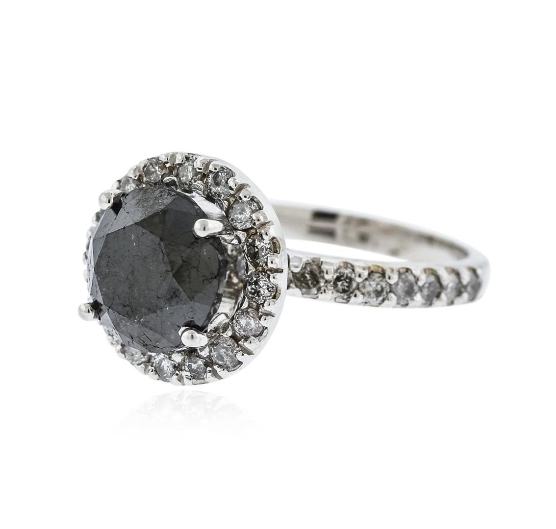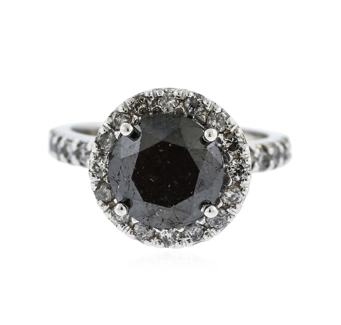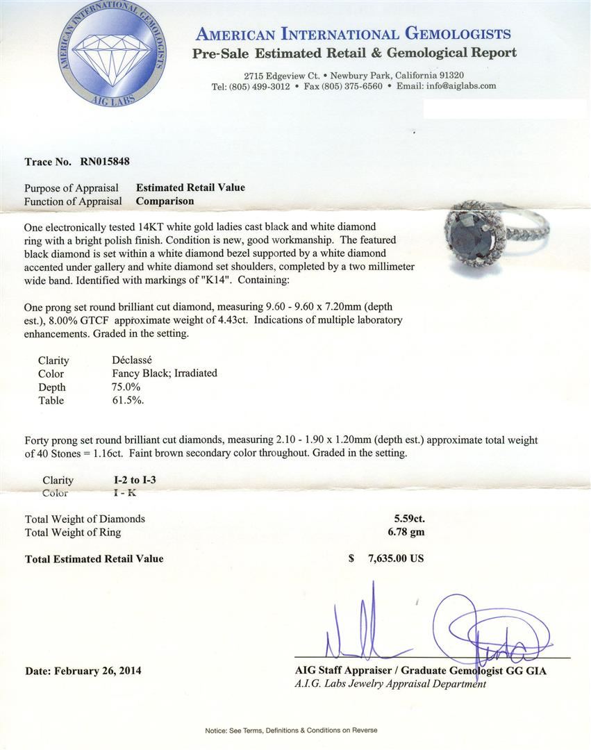 One electronically tested 14KT white gold ladies cast black and white diamond ring with a bright polish finish. The featured black diamond is set within a white diamond bezel supported by a white diamond accented under gallery and white diamond set shoulders, completed by a two millimeter wide band. Identified with markings of "K14". Condition is new, good workmanship. Containing: One prong set round brilliant cut diamond, measuring 9.60 - 9.60 x 7.20mm (depth est.), 8.00.%. GTCF approximate weight of 4.43ct. Indications of multiple laboratory enhancements. Graded in the setting. Clarity Declase‚. Color: Fancy Black; Irradiated. Depth: 75.0%. Table: 61.5%. Forty prong set round brilliant cut diamonds, measuring 2.10 - 1.90 x 1.20mm (depth est.) approximate total weight of 40 Stones = 1.16ct. Faint brown secondary color throughout. Graded in the setting. Clarity: I-2 to I-3. Color: I - K. Total Weight of Diamonds 5.59ct. Total Weight of Ring 6.78gm. AIG Appraised at $7,635.00.