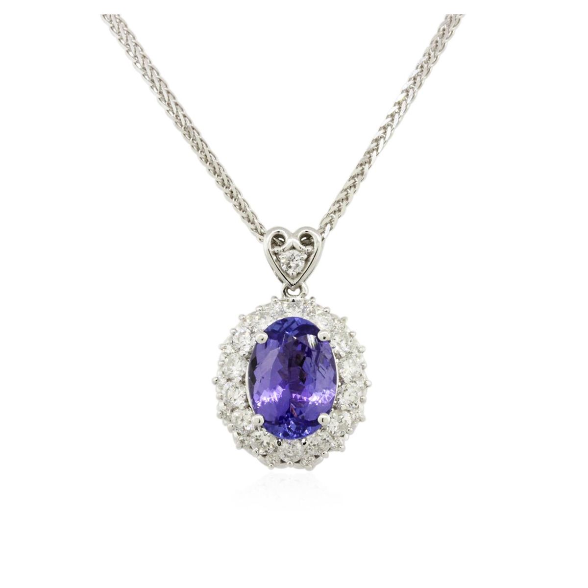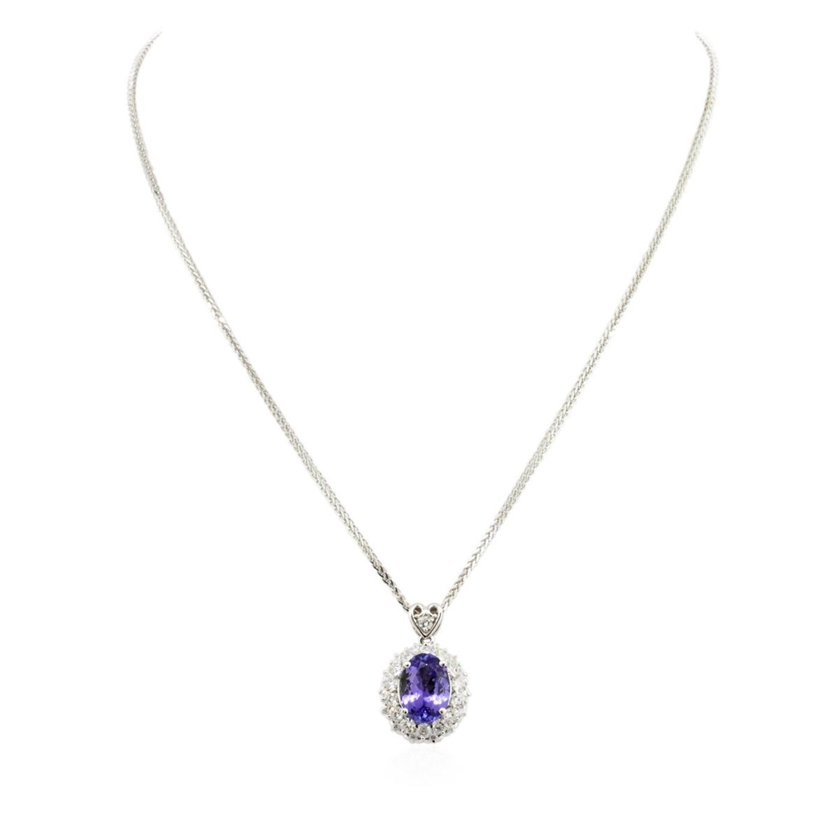 One electronically tested 14KT white gold Ladies combination cast & assembled pendant & chain 16.0" long, medium fancy link with a lobster claw clasp with a bright polish finish. Condition is new. Identified with markings of "585". Containing: One prong set oval modified brilliant cut natural tanzanite, measuring 13.00 x 9.50 x 6.20mm, approximate weight of 5.59ct., clarity is eye clean, medium light, very slightly grayish, violetish blue color, (GIA vB 4/3), cut is good. Colored gemstones are presumed to have been subjected to commonly used color/clarity enhancement processes. Fourteen prong set round brilliant cut diamonds, measuring 2.70 - 2.70 x 1.62mm (depth est.) approximate. Total Weight of 14 Stones = 1.01ct. Clarity: I-1 to I-2. Color: H - I, Cut is Good. All grading of diamonds and colored gemstones in this piece of jewelry are graded in the mounting, unless otherwise stated. Total Weight of Colored Stones 5.59ct. Total Weight of Diamonds 1.01ct. Total Weight of Pendant & Chain 9.80 grams. GGL Appraised at $12,495.00.