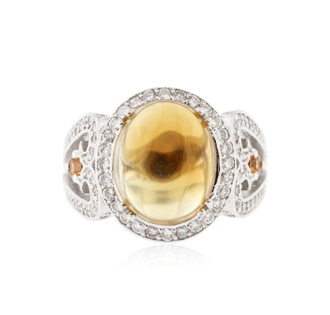 One electronically tested 14KT white gold ladies cast citrine and diamond ring with a bright polish finish. Identified with markings of "14K". Condition is new. Containing: One prong set oval cabochon cut natural citrine quartz, measuring 12.00 x 10.00 x 6.50mm, approximate weight of 5.60ct., clarity is slightly included, type I, medium light, moderately strong, orangy yellow color, (GIA oY 4/4), cut is good. Four prong set round modified brilliant cut natural orange sapphires, measuring 2.80 - 2.80 x 1.82 mm, approximate total weight of 0.48ct., clarity is slightly included, type II, medium light, moderately strong, orange color, (GIA O 4/4), cut is good. Eighty prong set round brilliant cut diamonds, measuring 1.20 - 1.20 x 0.72mm (depth est.) approximate total weight of 80 Stones = 0.50ct. Clarity: SI-1 to SI-2. Color: I - J, Cut is Good. Colored gemstones are presumed to have been subjected to commonly used enhancement processes. All diamonds and colored gemstones are graded in the mounting, unless otherwise stated. Total Weight of Colored Stones 6.08ct. Total Weight of Diamonds 0.50ct. Total Weight of Ring 10.10 grams. GGL Appraised at $4,775.00.