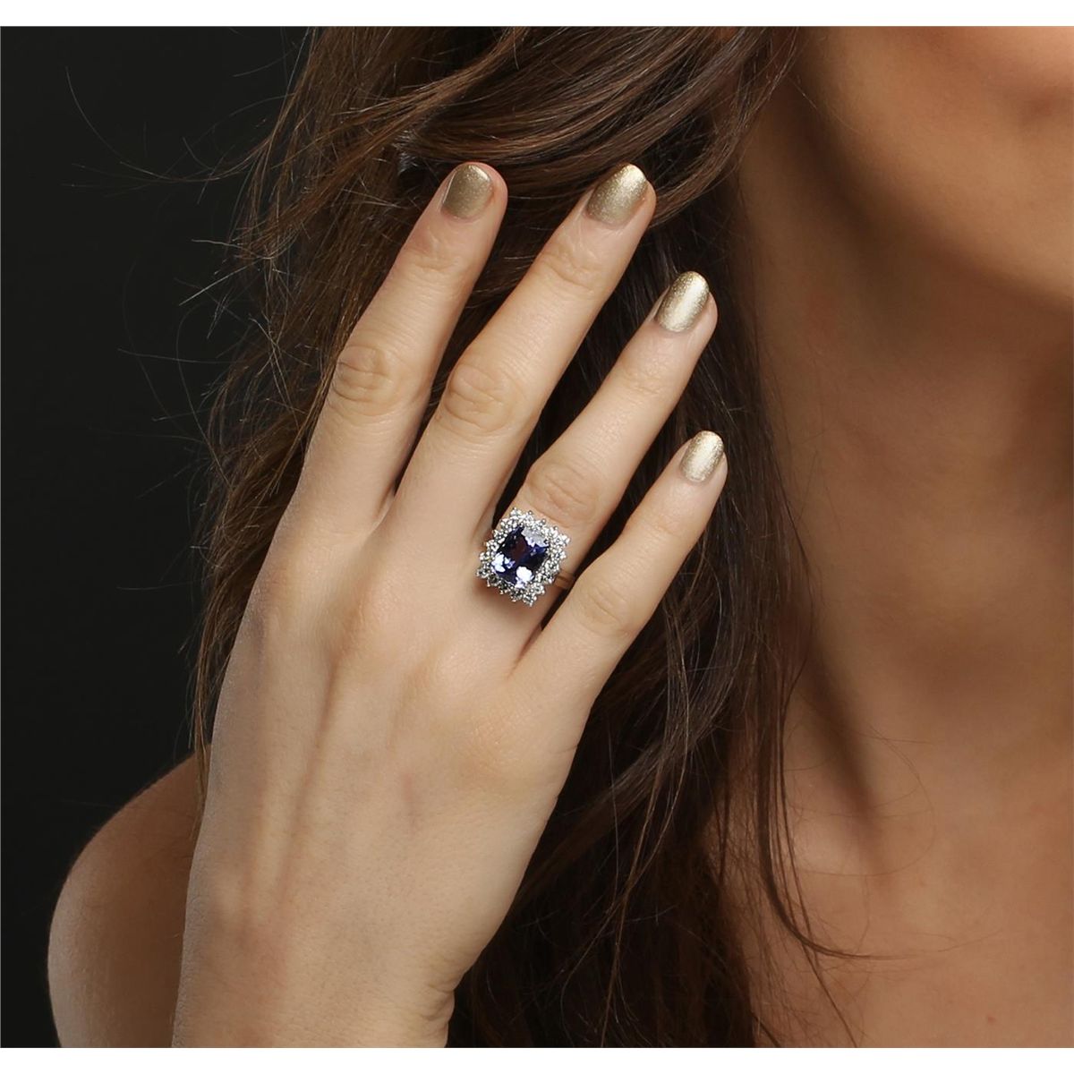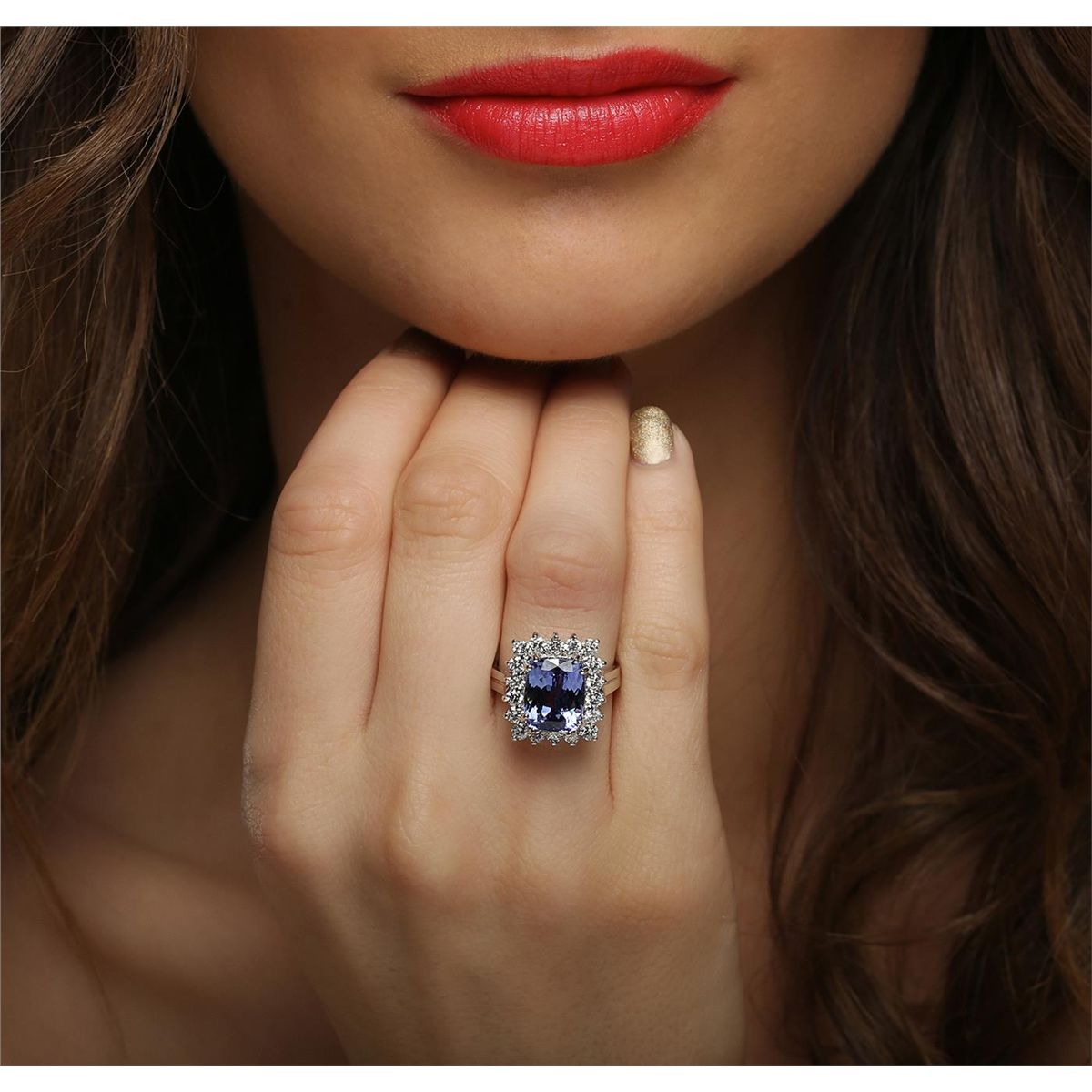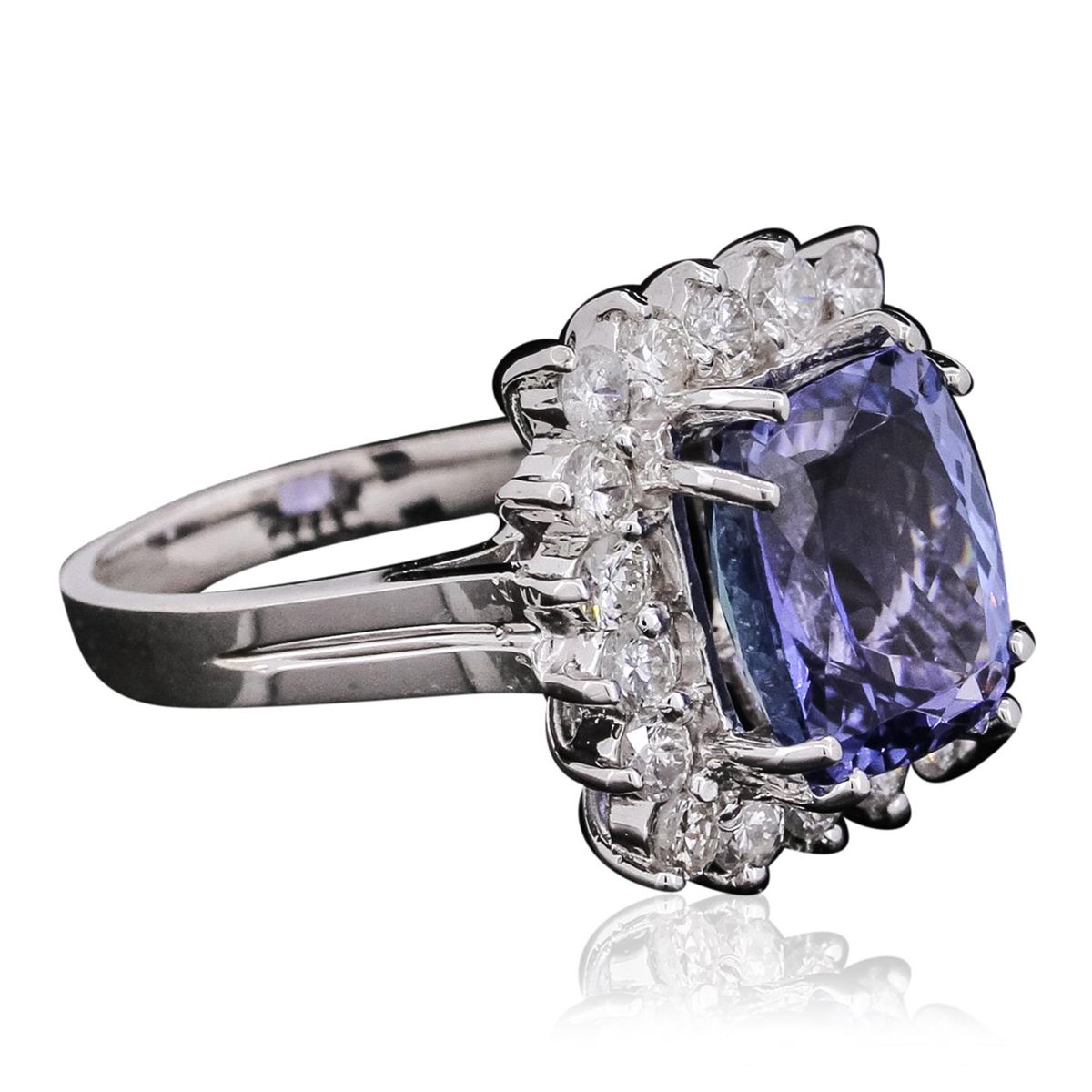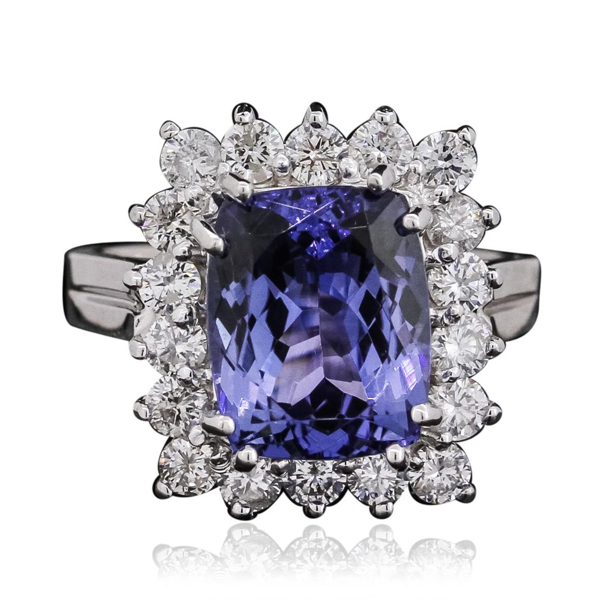 One electronically tested 14KT white gold ladies cast tanzanite & diamond ring with a bright finish. The featured tanzanite is set within a diamond bezel, supported by a ribbed under gallery, completed by a two and one half millimeter wide band. Identified with markings of "K14". Condition is new, good workmanship. Containing: One prong set rectangular cushion mixed cut natural tanzanite, measuring 11.00 x 9.00 x 6.30mm, 14% bulge factor, approximate weight of 5.60ct., clarity is eye clean, type I, medium dark, slightly grayish, violetish blue color, (GIA vB 6/2), cut is good. Transmitting light with no distortion, transparent. Colored Stone Grading Report attached. Graded in the setting. Tanzanite is a very rare gemstone that is only found in the country of Tanzania. Originally discovered in 1967. Tiffany & Company, named the stone Tanzanite. It is found in the Usumburu Mountains that border the Umba Valley of northern Tanzania. Tanzanite occurs in gray, brown, violet, blue, reddish-purple, & green. The gem is interesting because of its exceptional pleochroism. Rotated in different directions a tanzanite will exhibit multiple changes of color. Tanzanite has a low tolerance to ultrasonic cleaning, and should not be cleaned using this method. Eighteen prong set round brilliant cut diamonds, measuring 2.60 - 2.40 x 1.50mm (depth est.) approximate total weight of 18 Stones = 1.02ct. Graded in the setting. Clarity: SI-1 to I-1. Color: H - I. Total Weight of Colored Stones 5.60ct. Total Weight of Diamonds 1.02ct. Total Weight of Ring 7.08 grams. AIG Appraised at $14,990.00.