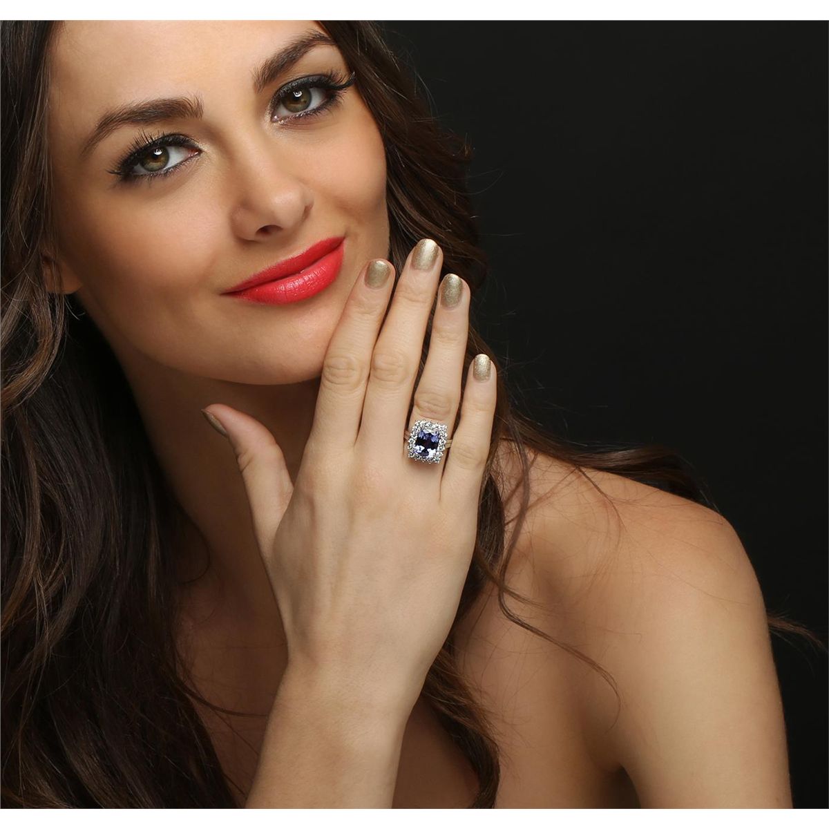 One electronically tested 14KT white gold ladies cast tanzanite & diamond ring with a bright finish. The featured tanzanite is set within a diamond bezel, supported by a ribbed under gallery, completed by a two and one half millimeter wide band. Identified with markings of "K14". Condition is new, good workmanship. Containing: One prong set rectangular cushion mixed cut natural tanzanite, measuring 11.00 x 9.00 x 6.30mm, 14% bulge factor, approximate weight of 5.60ct., clarity is eye clean, type I, medium dark, slightly grayish, violetish blue color, (GIA vB 6/2), cut is good. Transmitting light with no distortion, transparent. Colored Stone Grading Report attached. Graded in the setting. Tanzanite is a very rare gemstone that is only found in the country of Tanzania. Originally discovered in 1967. Tiffany & Company, named the stone Tanzanite. It is found in the Usumburu Mountains that border the Umba Valley of northern Tanzania. Tanzanite occurs in gray, brown, violet, blue, reddish-purple, & green. The gem is interesting because of its exceptional pleochroism. Rotated in different directions a tanzanite will exhibit multiple changes of color. Tanzanite has a low tolerance to ultrasonic cleaning, and should not be cleaned using this method. Eighteen prong set round brilliant cut diamonds, measuring 2.60 - 2.40 x 1.50mm (depth est.) approximate total weight of 18 Stones = 1.02ct. Graded in the setting. Clarity: SI-1 to I-1. Color: H - I. Total Weight of Colored Stones 5.60ct. Total Weight of Diamonds 1.02ct. Total Weight of Ring 7.08 grams. AIG Appraised at $14,990.00.