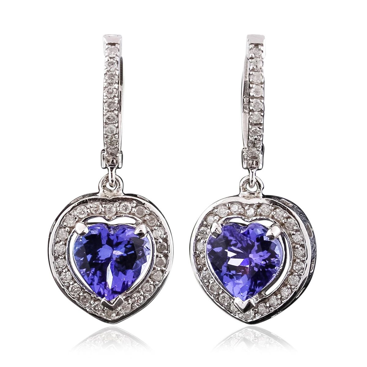 One pair electronically tested 14KT white gold ladies combination cast & assembled dangle earrings with hinged clip backs with a bright polish finish. Identified with markings of "14K". Condition is new. Containing: Two prong set heart modified brilliant cut natural tanzanites, measuring 8.70 x 8.70 x 5.66mm, approximate total weight of 5.60ct., clarity is eye clean, type I, medium, moderately strong, bluish violet color, (GIA bV 5/4), cut is good. Sixty-Eight prong set round brilliant cut diamonds, measuring 1.30 - 1.30 x 0.78mm (depth est.) approximate total weight of 68 Stones = 0.54ct. Clarity: I-1 to I-2. Color: I - J, Cut is Good. Colored gemstones are presumed to have been subjected to commonly used enhancement processes. All diamonds and colored gemstones are graded in the mounting, unless otherwise stated. Total Weight of Colored Stones 5.60ct. Total Weight of Diamonds 0.54ct. Total Weight of Earrings 6.20 grams. GGL Appraised at $10,750.00.