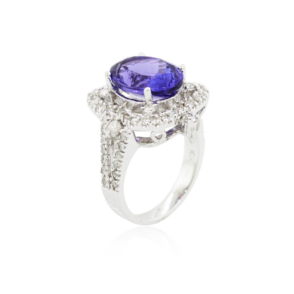 One electronically tested 14KT white gold Ladies combination cast & assembled ring with a bright polish finish. Condition is new. Identified with markings of "K14". Containing: One prong set oval modified brilliant cut natural tanzanite, measuring 13.10 x 10.70 x 5.91mm, approximate weight of 5.61ct., clarity is eye clean, type I, medium, moderately strong, bluish violet color, (GIA bV 5/4), cut is good. Colored gemstones are presumed to have been subjected to commonly used color/clarity enhancement processes. Sixty prong set round brilliant cut diamonds, measuring 2.50 - 1.50 x 1.20mm (depth est.) approximate. Total Weight of 60 Stones = 1.20ct. Clarity: I-1 to I-2. Color: I - J, Cut is Good. Total Weight of Colored Stones 5.61ct. Total Weight of Diamonds 1.20ct. Total Weight of Ring 8.50 grams. GGL Appraised at $12,030.00.