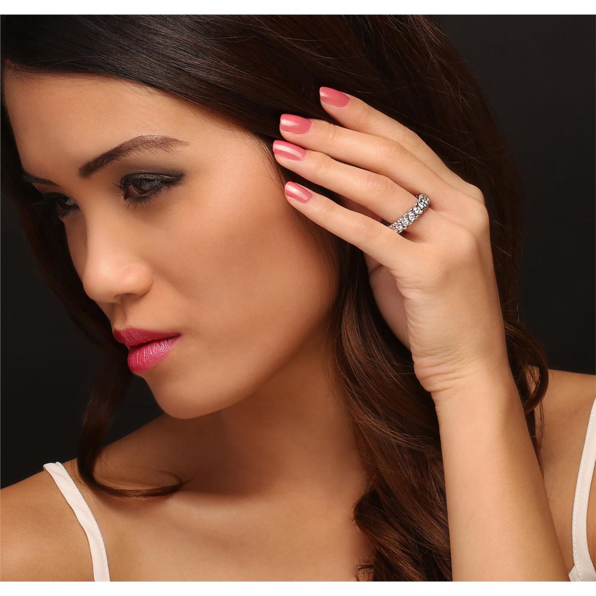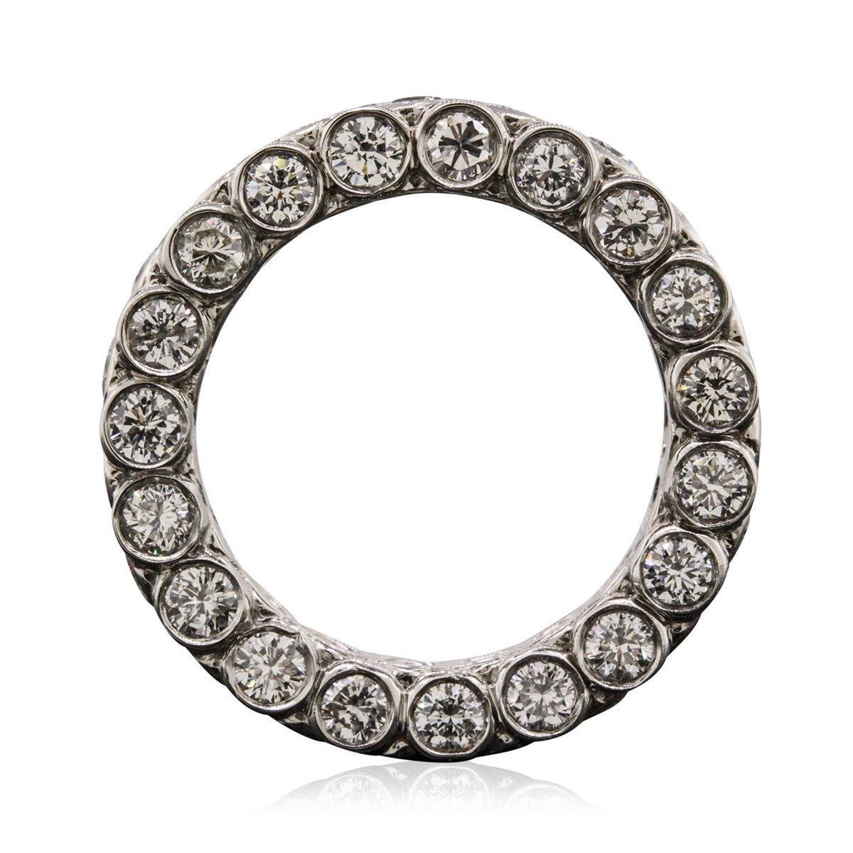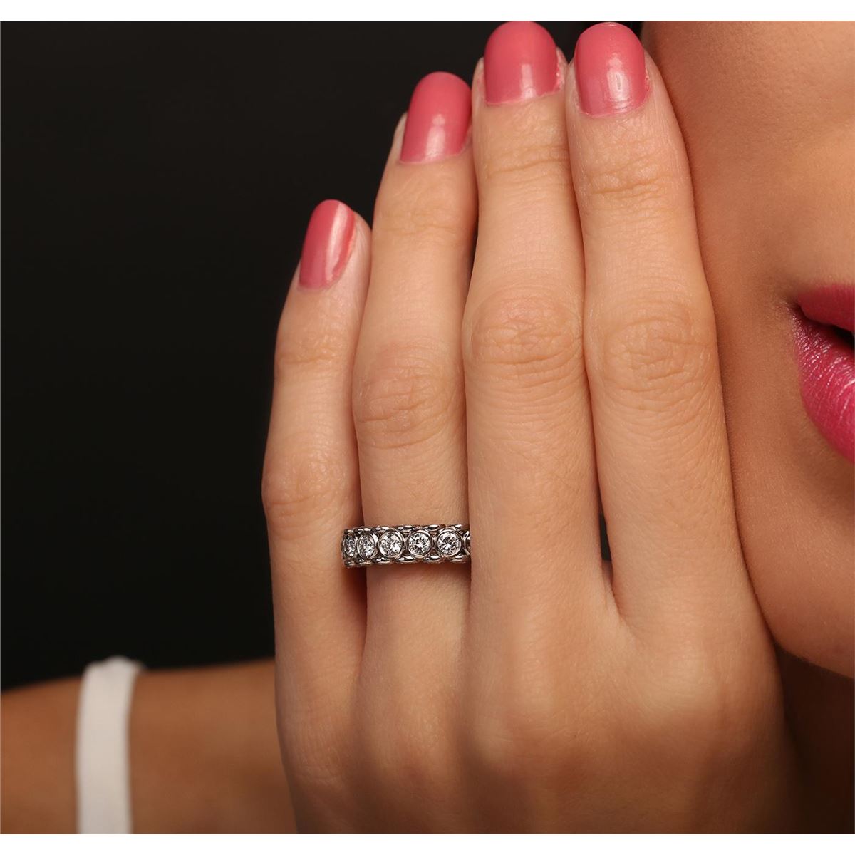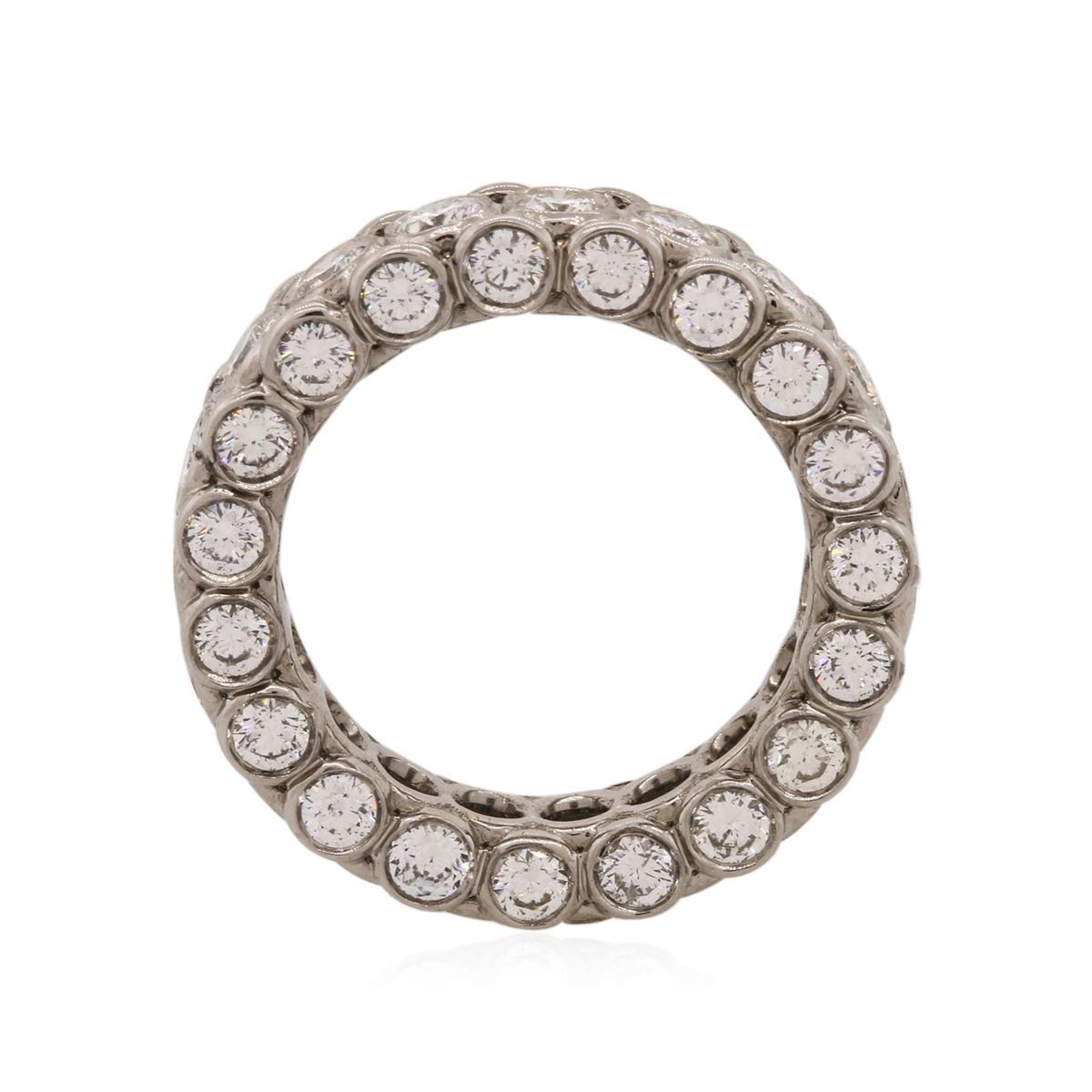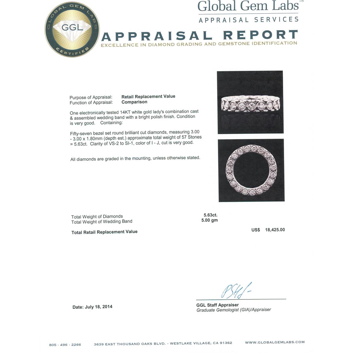One electronically tested 14KT white gold Ladies combination cast & assembled wedding band with a bright polish finish. Condition is very good. Containing: Fifty-Seven bezel set round brilliant cut diamonds, measuring 3.00 - 3.00 x 1.80mm (depth est.) approximate. Total Weight of 57 Stones = 5.63ct. Clarity: VS-2 to SI-1. Color: I - J, Cut is Very Good. All diamonds are graded in the mounting, unless otherwise stated. Total Weight of Diamonds 5.63ct. Total Weight of Wedding Band 5.00 grams.. GGL Appraised at $18,425.00.