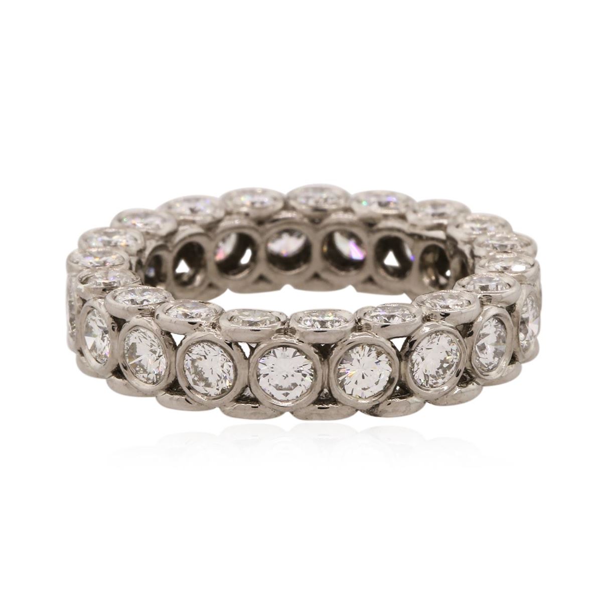 One electronically tested 14KT white gold Ladies combination cast & assembled wedding band with a bright polish finish. Condition is very good. Containing: Fifty-Seven bezel set round brilliant cut diamonds, measuring 3.00 - 3.00 x 1.80mm (depth est.) approximate. Total Weight of 57 Stones = 5.63ct. Clarity: VS-2 to SI-1. Color: I - J, Cut is Very Good. All diamonds are graded in the mounting, unless otherwise stated. Total Weight of Diamonds 5.63ct. Total Weight of Wedding Band 5.00 grams.. GGL Appraised at $18,425.00.