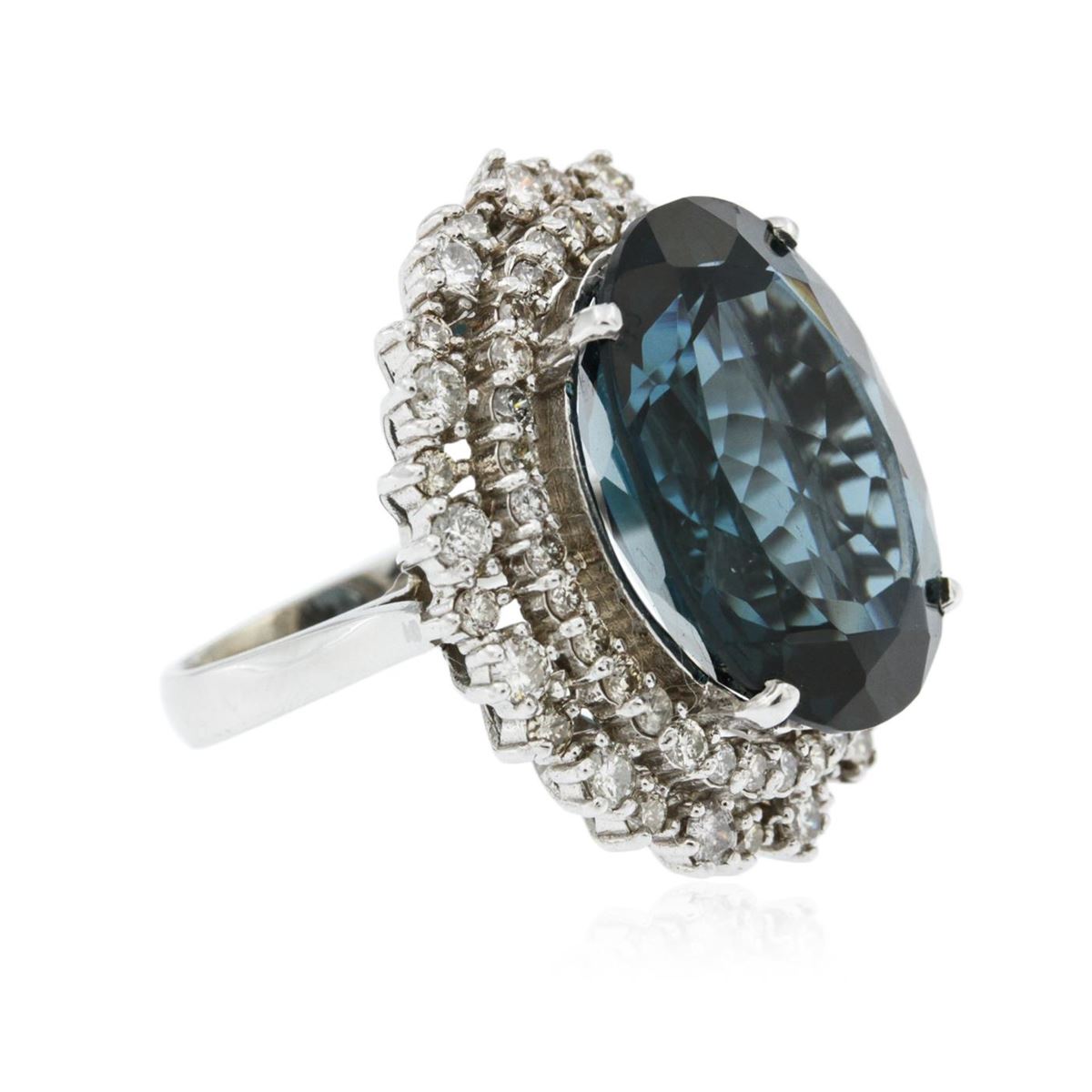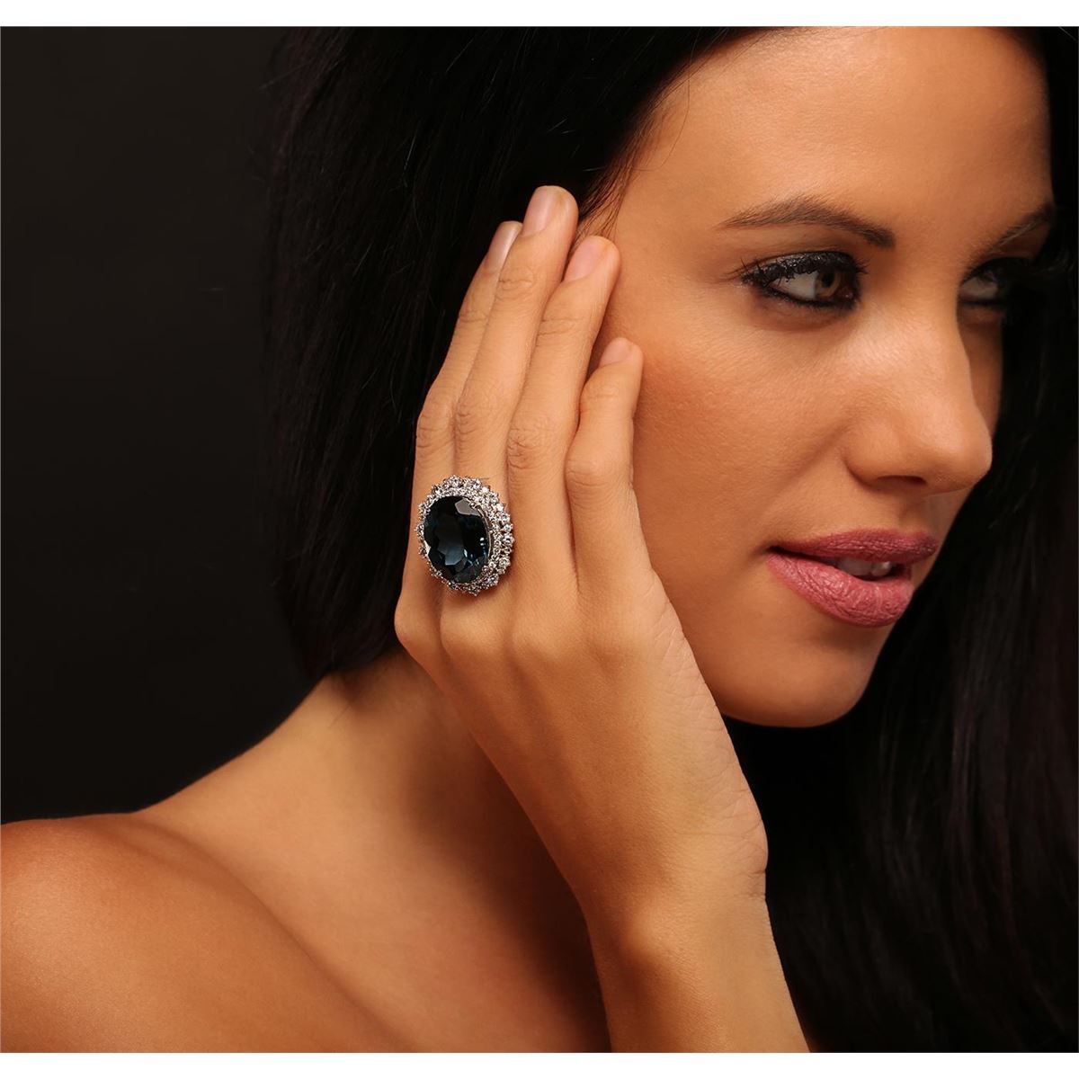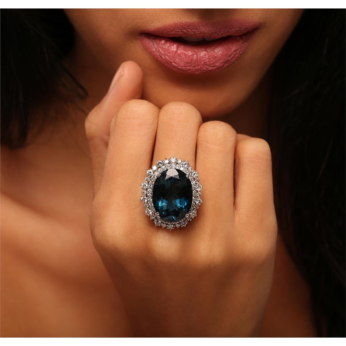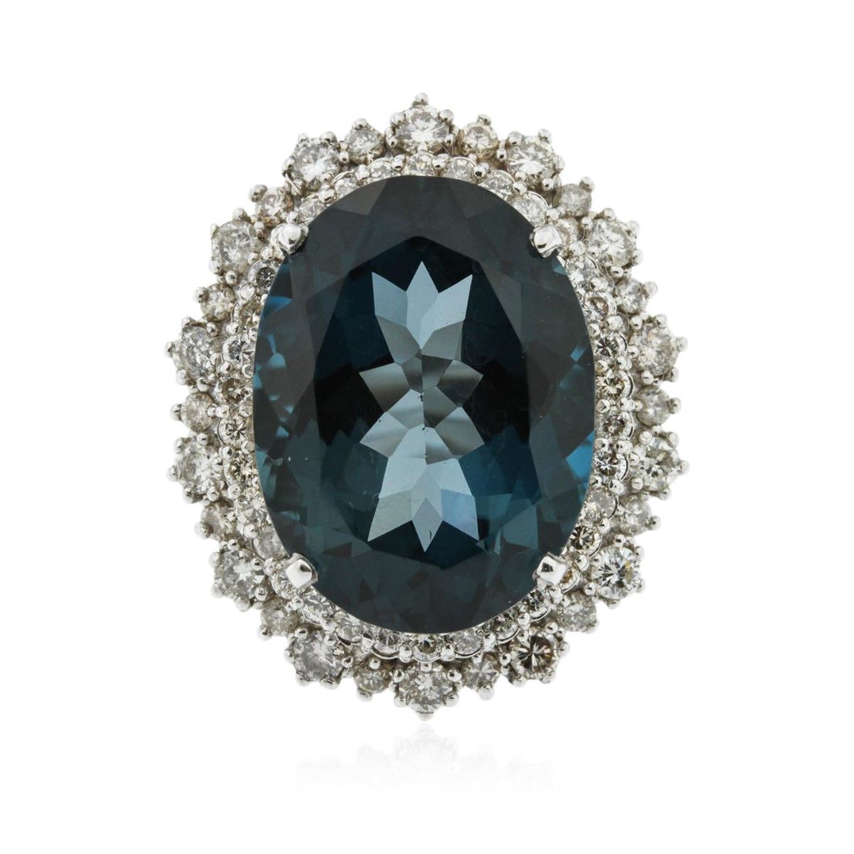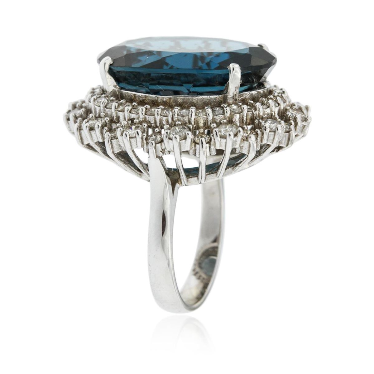 One electronically tested 14KT white gold Ladies combination cast & assembled ring with a bright polish finish. Condition is new. Identified with markings of "K14". Containing: Fourteen prong set round brilliant cut diamonds, measuring 2.40 - 2.40 x 1.44mm (depth est.) approximate total weight of 14 Stones = 0.71ct. Clarity of I-1 to I-2, Color of J - K, Cut is Good. Forty-Nine prong set round brilliant cut diamonds, measuring 1.50 - 1.50 x 0.90mm (depth est.) approximate total weight of 49 Stones = 0.60ct. Clarity of I-1 to I-2, Color of J - K, Cut is Good. One prong set oval modified brilliant cut natural topaz, measuring 19.90 x 14.71 x 9.40mm, approximate weight of 5.63ct., clarity is eye clean, medium dark, moderately strong, greenish blue color, (GIA gB 6/4), cut is very good. Colored gemstones are presumed to have been subjected to commonly used color/clarity enhancement processes. Total Weight of Colored Stones 5.63ct. Total Weight of Diamonds 1.31ct. Total Weight of Ring 13.90 grams. GGL Appraised at $4,725.00.