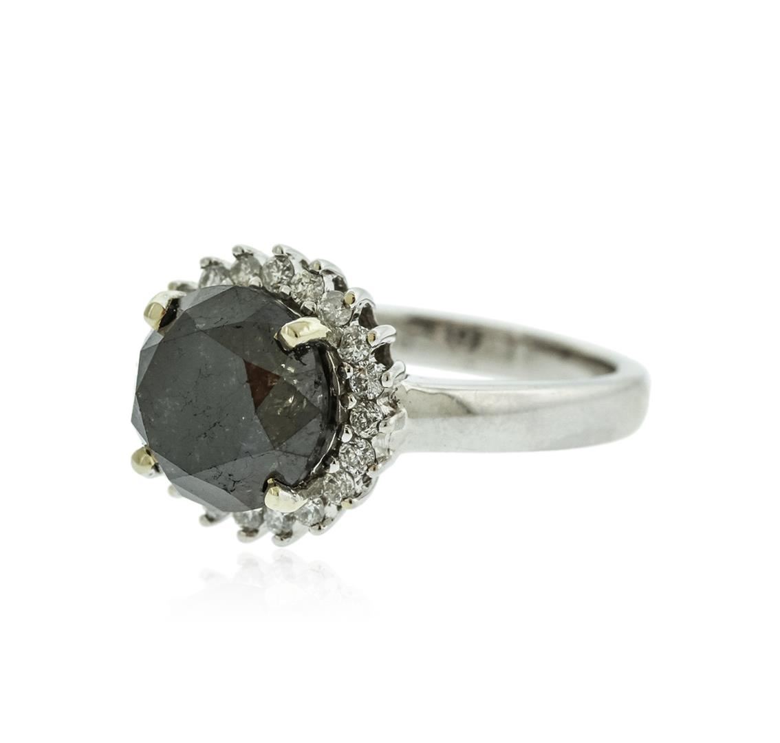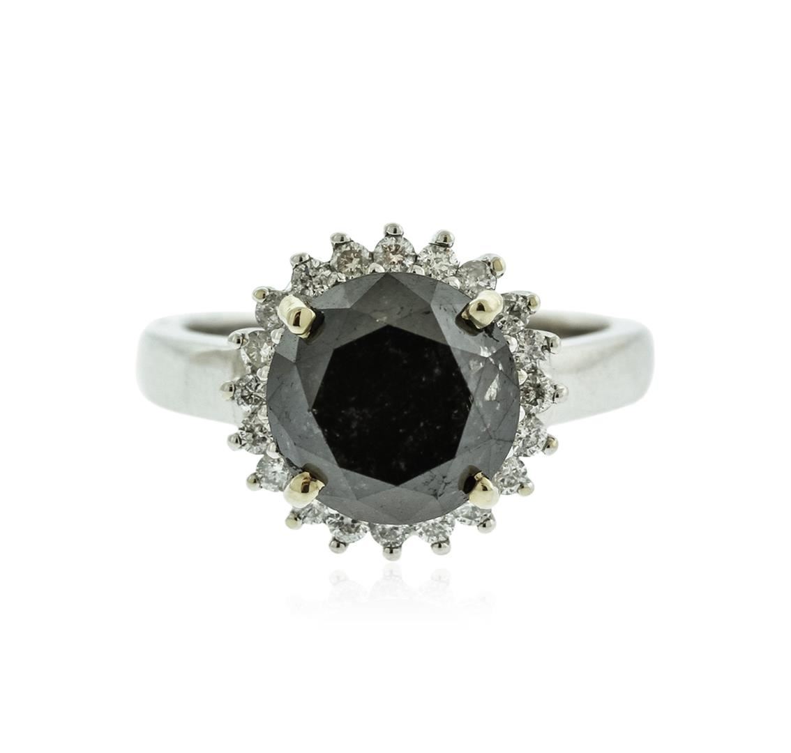 One electronically tested 14KT white gold ladies cast black and white diamond ring with a bright polish finish. The featured black diamond is set within a white diamond bezel, completed by a two and one-half millimeter wide band. Identified with markings of "14K RT". Condition is new, good workmanship. Containing: One prong set round brilliant cut diamond, measuring 9.80 - 9.80 x 8.15mm (depth est.), 8.00.%. GTCF approximate weight of 5.28ct. Indications of multiple laboratory enhancements. Graded in the setting. Clarity Declasse. Color: Fancy Black; Irradiated. Depth: 83.2%. Table: 63.3%. Twenty prong set round brilliant cut diamonds, measuring 1.70 - 1.60 x 0.99mm (depth est.) approximate total weight of 20 Stones = 0.36ct. Graded in the setting. Clarity: I-1 to I-2. Color: G - I. Total Weight of Diamonds 5.64ct. Total Weight of Ring 5.90gm. AIG Appraised at $9,925.00.