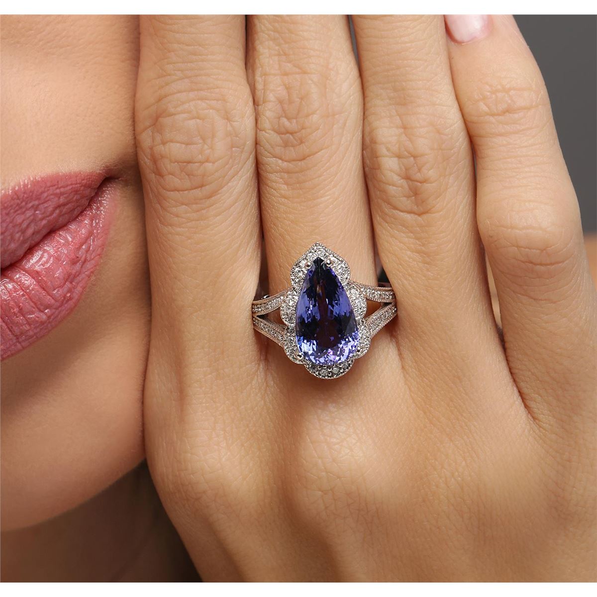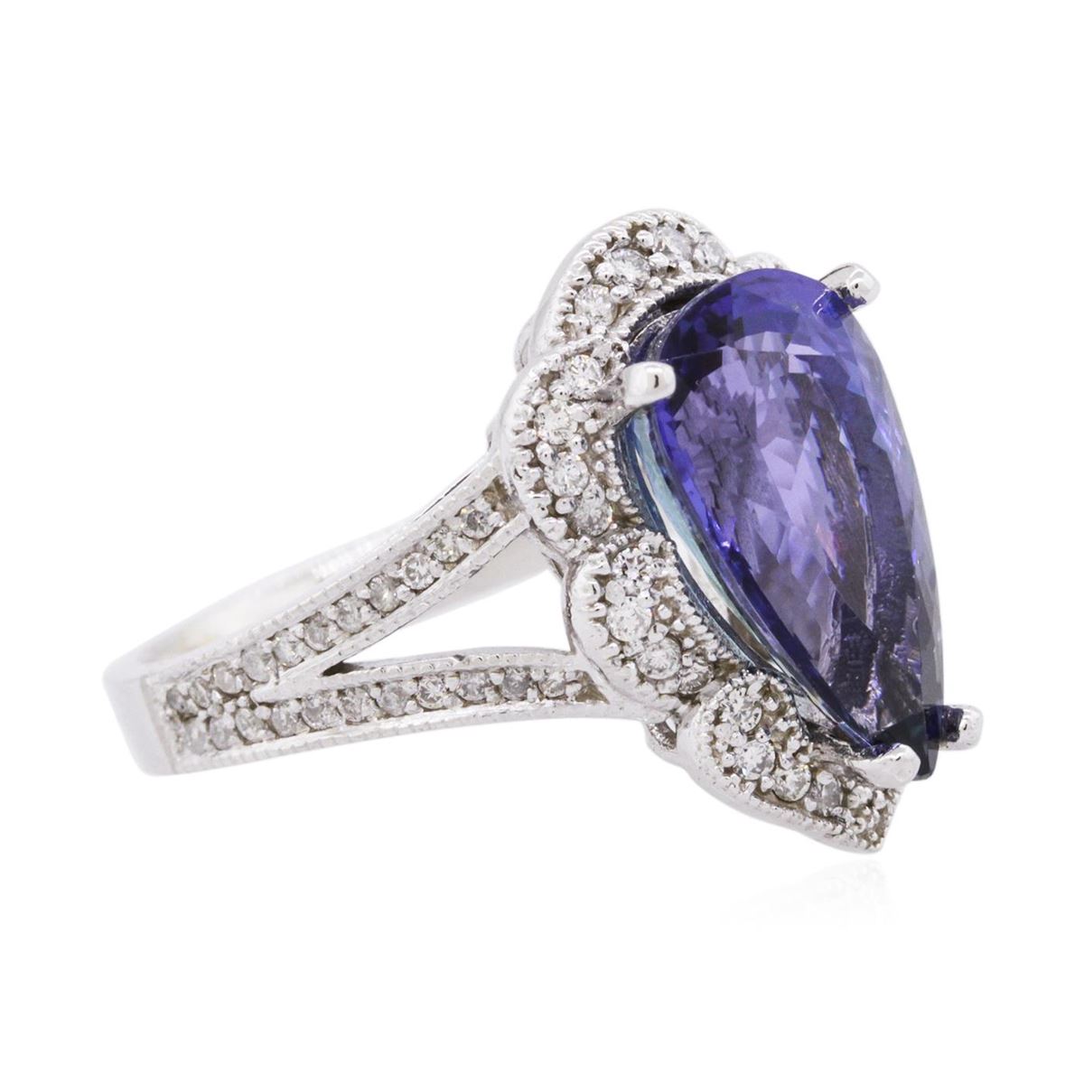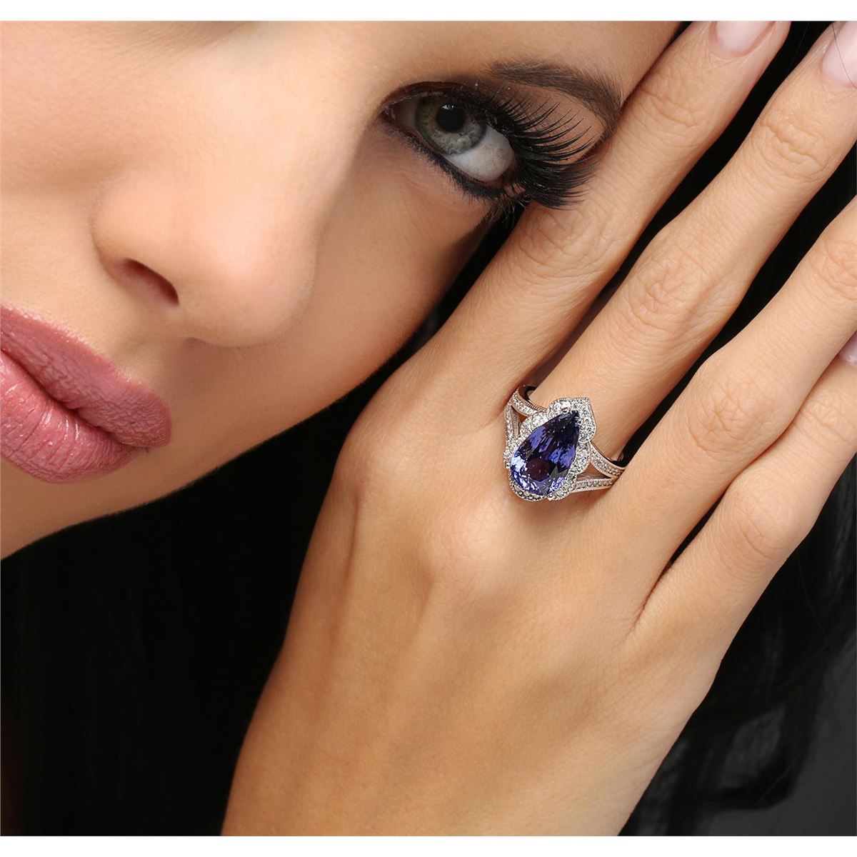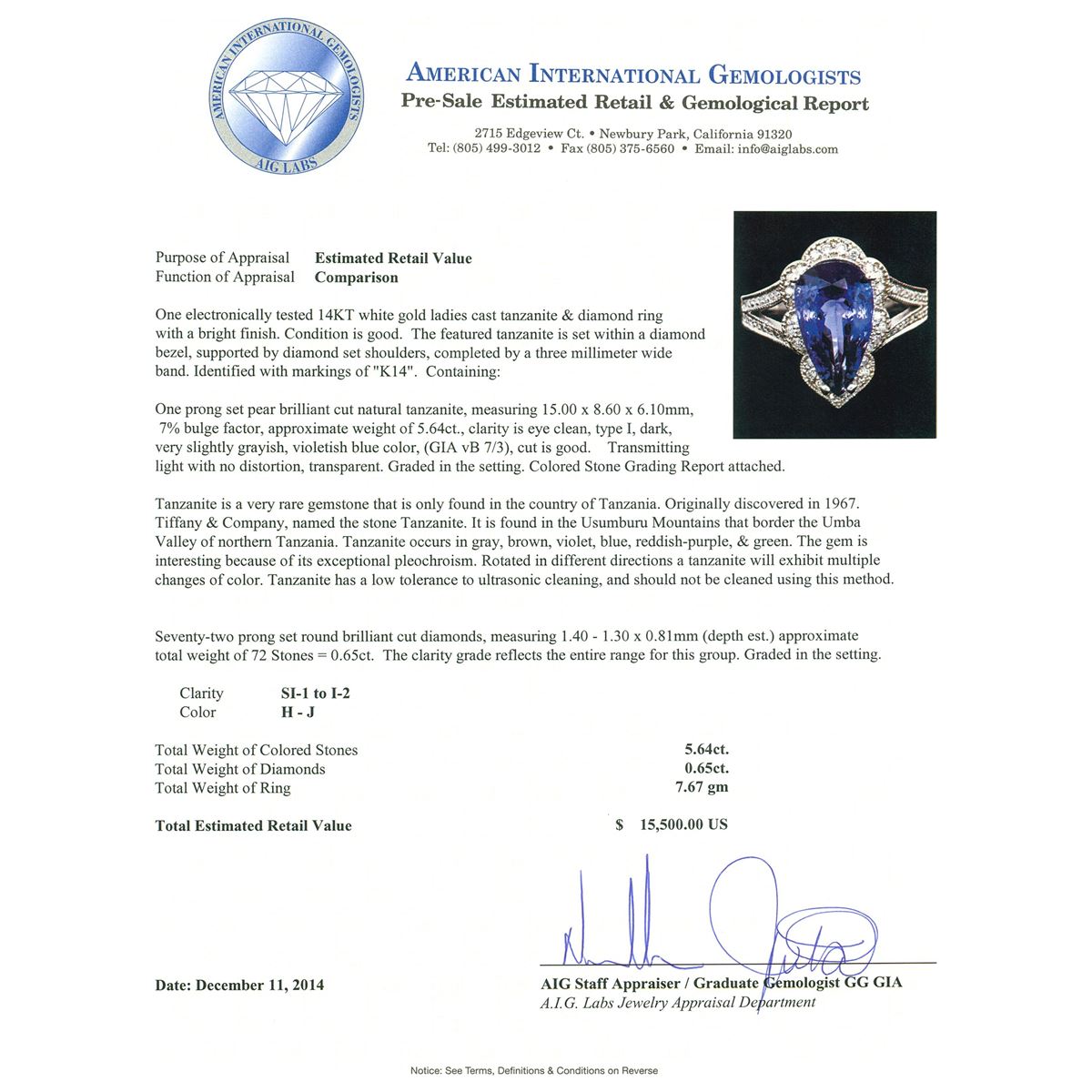 One electronically tested 14KT white gold ladies cast tanzanite & diamond ring with a bright finish. The featured tanzanite is set within a diamond bezel, supported by diamond set shoulders, completed by a three millimeter wide band. Identified with markings of "K14". Condition is good. Containing: One prong set pear brilliant cut natural tanzanite, measuring 15.00 x 8.60 x 6.10mm, 7% bulge factor, approximate weight of 5.64ct., clarity is eye clean, type I, dark, very slightly grayish, violetish blue color, (GIA vB 7/3), cut is good. Transmitting light with no distortion, transparent. Graded in the setting. Colored Stone Grading Report attached. Tanzanite is a very rare gemstone that is only found in the country of Tanzania. Originally discovered in 1967. Tiffany & Company, named the stone Tanzanite. It is found in the Usumburu Mountains that border the Umba Valley of northern Tanzania. Tanzanite occurs in gray, brown, violet, blue, reddish-purple, & green. The gem is interesting because of its exceptional pleochroism. Rotated in different directions a tanzanite will exhibit multiple changes of color. Tanzanite has a low tolerance to ultrasonic cleaning, and should not be cleaned using this method. Seventy-Two prong set round brilliant cut diamonds, measuring 1.40 - 1.30 x 0.81mm (depth est.) approximate total weight of 72 Stones = 0.65ct. The clarity grade reflects the entire range for this group. Graded in the setting. Clarity: SI-1 to I-2. Color: H - J. Total Weight of Colored Stones 5.64ct. Total Weight of Diamonds 0.65ct. Total Weight of Ring 7.67 grams. AIG Appraised at $15,500.00.