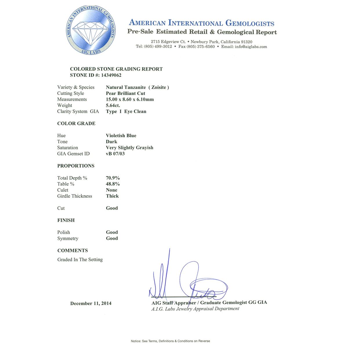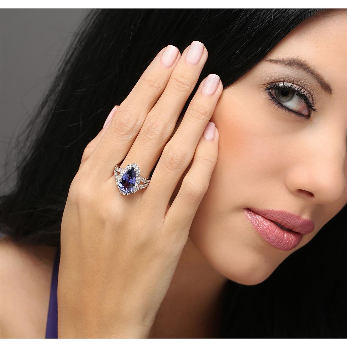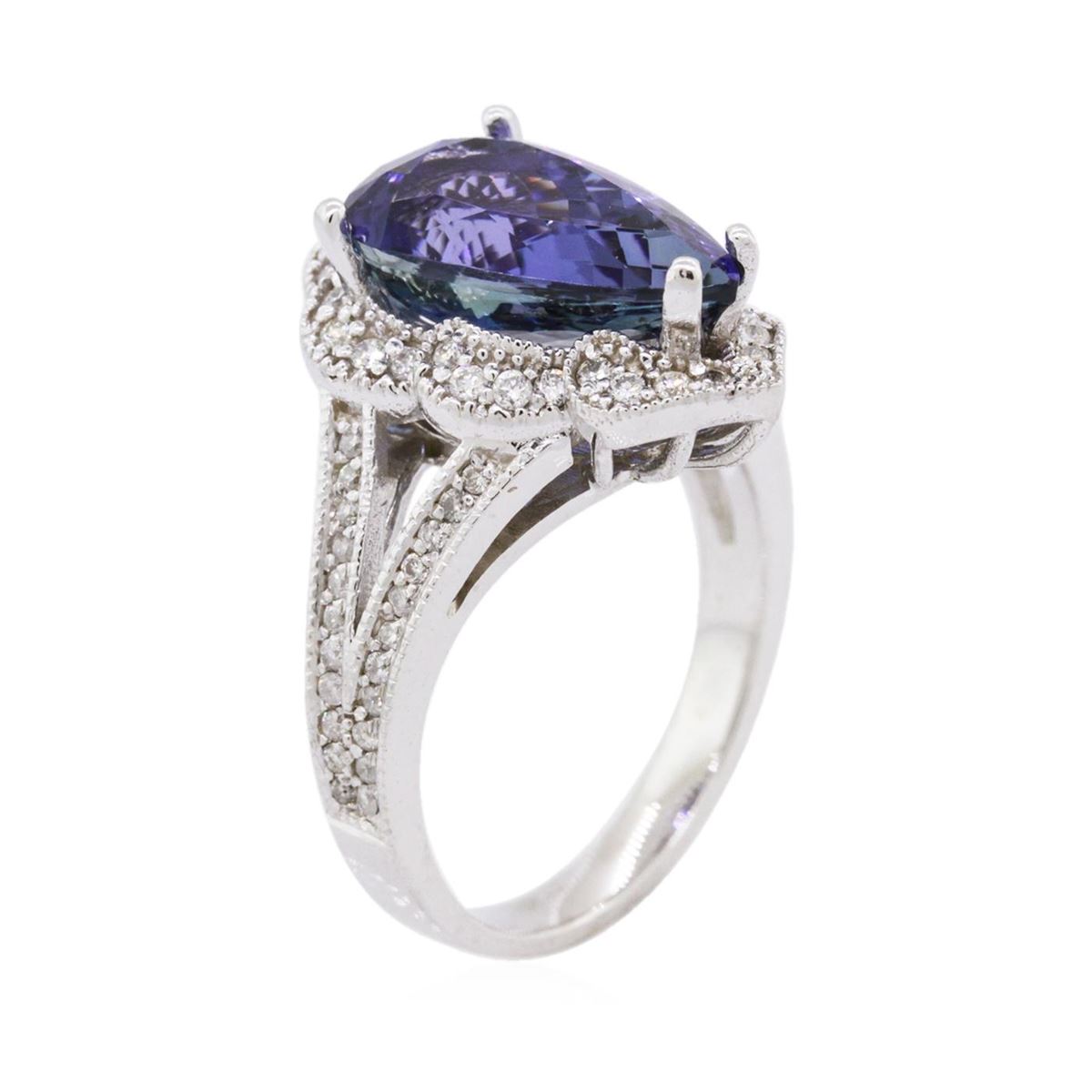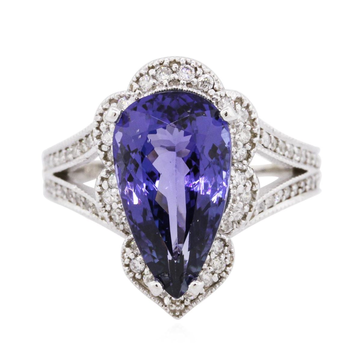 One electronically tested 14KT white gold ladies cast tanzanite & diamond ring with a bright finish. The featured tanzanite is set within a diamond bezel, supported by diamond set shoulders, completed by a three millimeter wide band. Identified with markings of "K14". Condition is good. Containing: One prong set pear brilliant cut natural tanzanite, measuring 15.00 x 8.60 x 6.10mm, 7% bulge factor, approximate weight of 5.64ct., clarity is eye clean, type I, dark, very slightly grayish, violetish blue color, (GIA vB 7/3), cut is good. Transmitting light with no distortion, transparent. Graded in the setting. Colored Stone Grading Report attached. Tanzanite is a very rare gemstone that is only found in the country of Tanzania. Originally discovered in 1967. Tiffany & Company, named the stone Tanzanite. It is found in the Usumburu Mountains that border the Umba Valley of northern Tanzania. Tanzanite occurs in gray, brown, violet, blue, reddish-purple, & green. The gem is interesting because of its exceptional pleochroism. Rotated in different directions a tanzanite will exhibit multiple changes of color. Tanzanite has a low tolerance to ultrasonic cleaning, and should not be cleaned using this method. Seventy-Two prong set round brilliant cut diamonds, measuring 1.40 - 1.30 x 0.81mm (depth est.) approximate total weight of 72 Stones = 0.65ct. The clarity grade reflects the entire range for this group. Graded in the setting. Clarity: SI-1 to I-2. Color: H - J. Total Weight of Colored Stones 5.64ct. Total Weight of Diamonds 0.65ct. Total Weight of Ring 7.67 grams. AIG Appraised at $15,500.00.