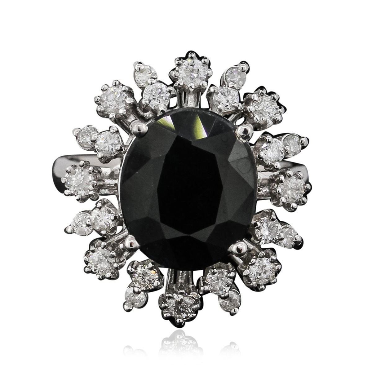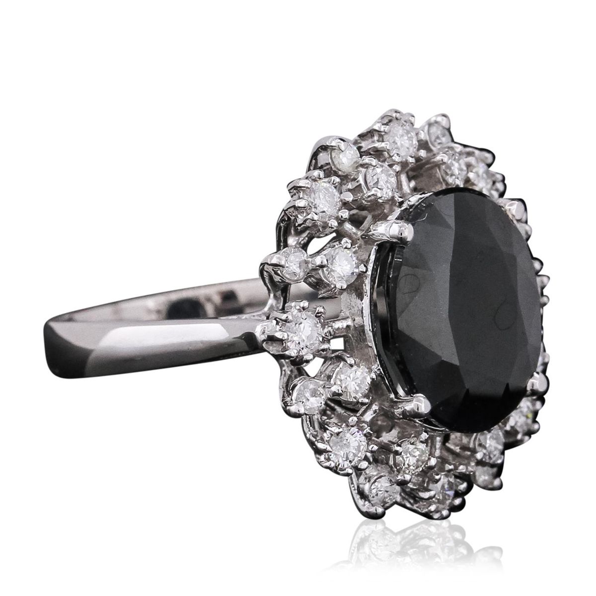 One electronically tested 14KT white gold ladies cast sapphire and diamond ring with a bright polish finish. The featured sapphire is set within a stylized diamond bezel, completed by a two and one-half millimeter wide band. Identified with markings of "K14". Condition is new, good workmanship. Containing: One prong set oval mixed cut natural blue sapphire, measuring 12.00 x 10.00 x 5.50mm, 6% bulge factor, approximate weight of 5.64ct., type II, very dark, very slightly grayish, very slightly greenish blue color, (GIA vslgB 8/3), cut is good. Transmitting light diffusely, translucent to opaque. Naturally occurring internal & external characteristics are present. Colored Stone Grading Report attached. Graded in the setting. Twenty-Four prong set round brilliant cut diamonds, measuring 2.00 - 1.80 x 1.14mm (depth est.) approximate total weight of 24 Stones = 0.70ct. Graded in the setting. Clarity: I-1 to I-2. Color: G - I. Total Weight of Colored Stones 5.64ct. Total Weight of Diamonds 0.70ct. Total Weight of Ring 6.70 grams. AIG Appraised at $3,735.00.