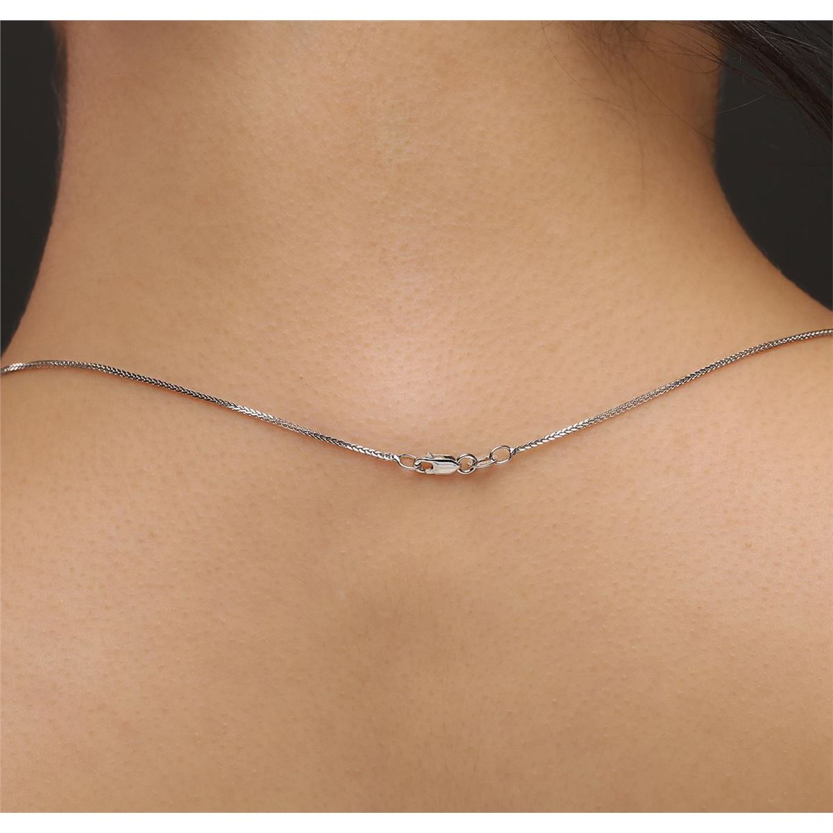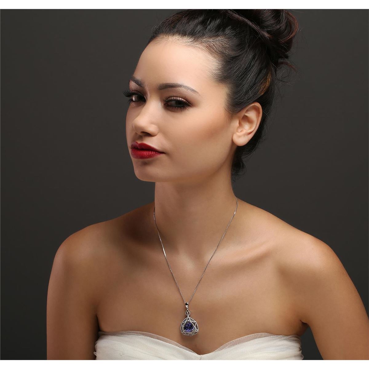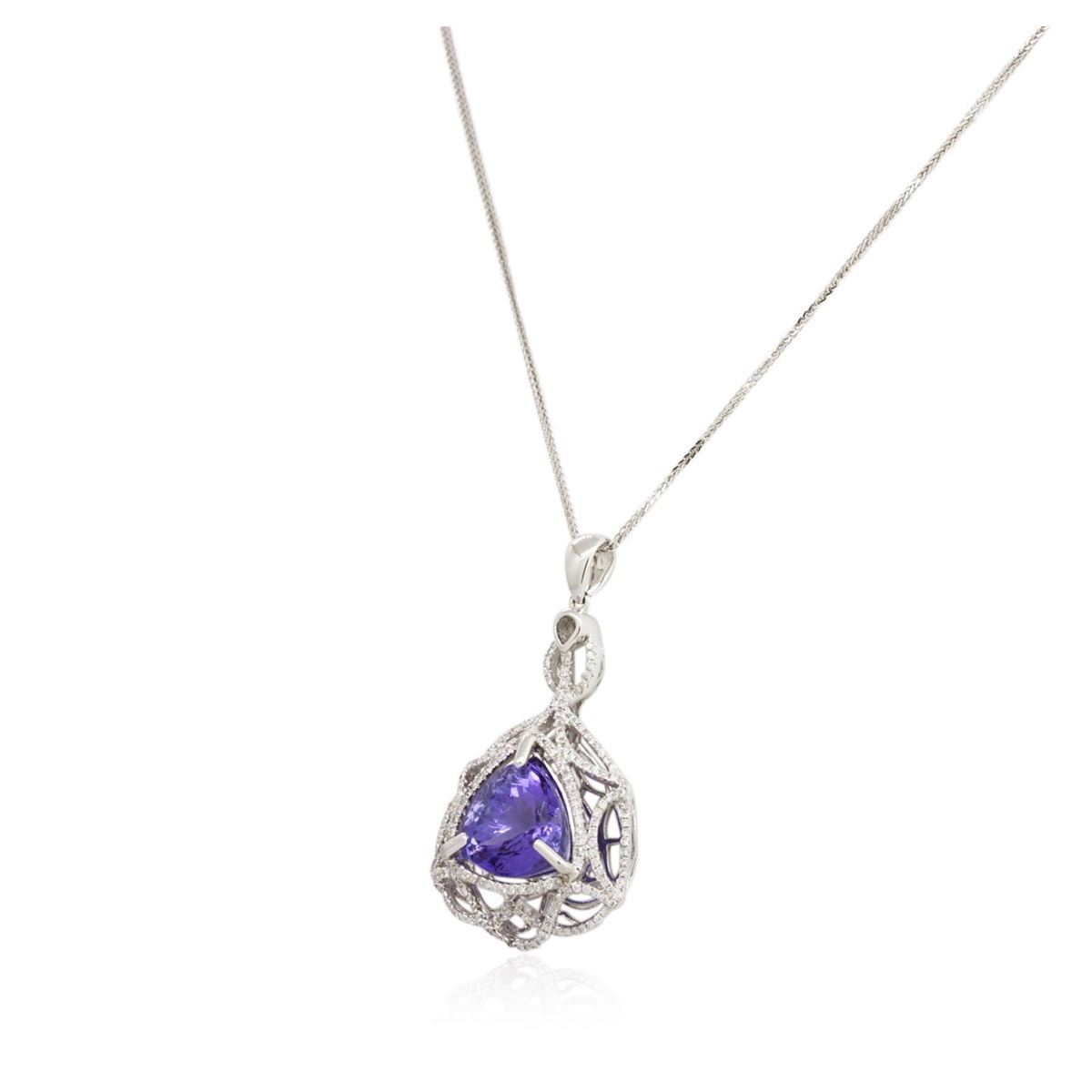 One electronically tested 14KT white gold Ladies combination cast & assembled pendant & chain 17.0" long, medium cable link with a lobster claw clasp with a bright polish finish. Condition is new. Identified with markings of "14K". Containing: One prong set triangle modified brilliant cut natural tanzanite, measuring 9.87 x 9.87 x 9.60mm, approximate weight of 5.64ct., clarity is eye clean, type I, medium light, moderately strong, violet color, (GIA V 4/4), cut is good. Colored gemstones are presumed to have been subjected to commonly used color/clarity enhancement processes. Two Hundred prong set round brilliant cut diamonds, measuring 1.00 - 1.00 x 0.60mm (depth est.) approximate. Total Weight of 200 Stones = 0.72ct. Clarity: I-1 to I-2. Color: I - J, Cut is Good. Total Weight of Colored Stones 5.64ct. Total Weight of Diamonds 0.72ct. Total Weight of Pendant & Chain 10.90 grams. GGL Appraised at $12,400.00.