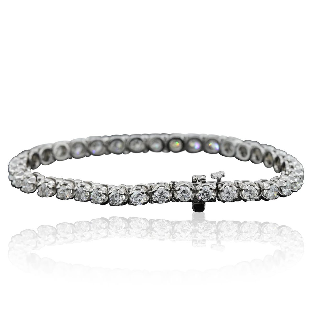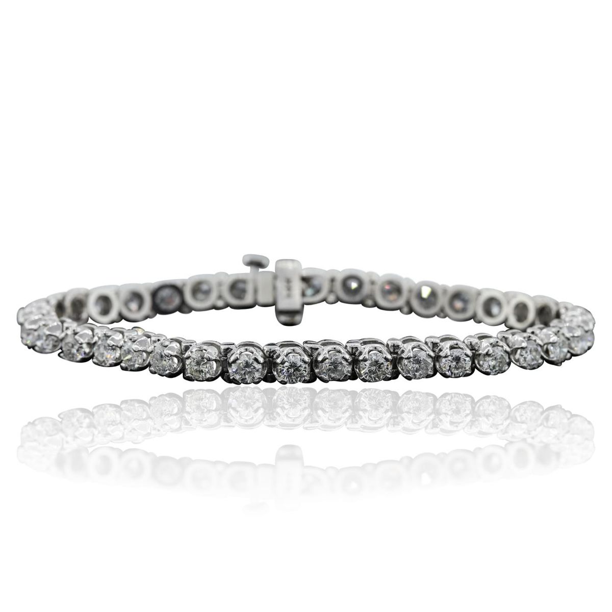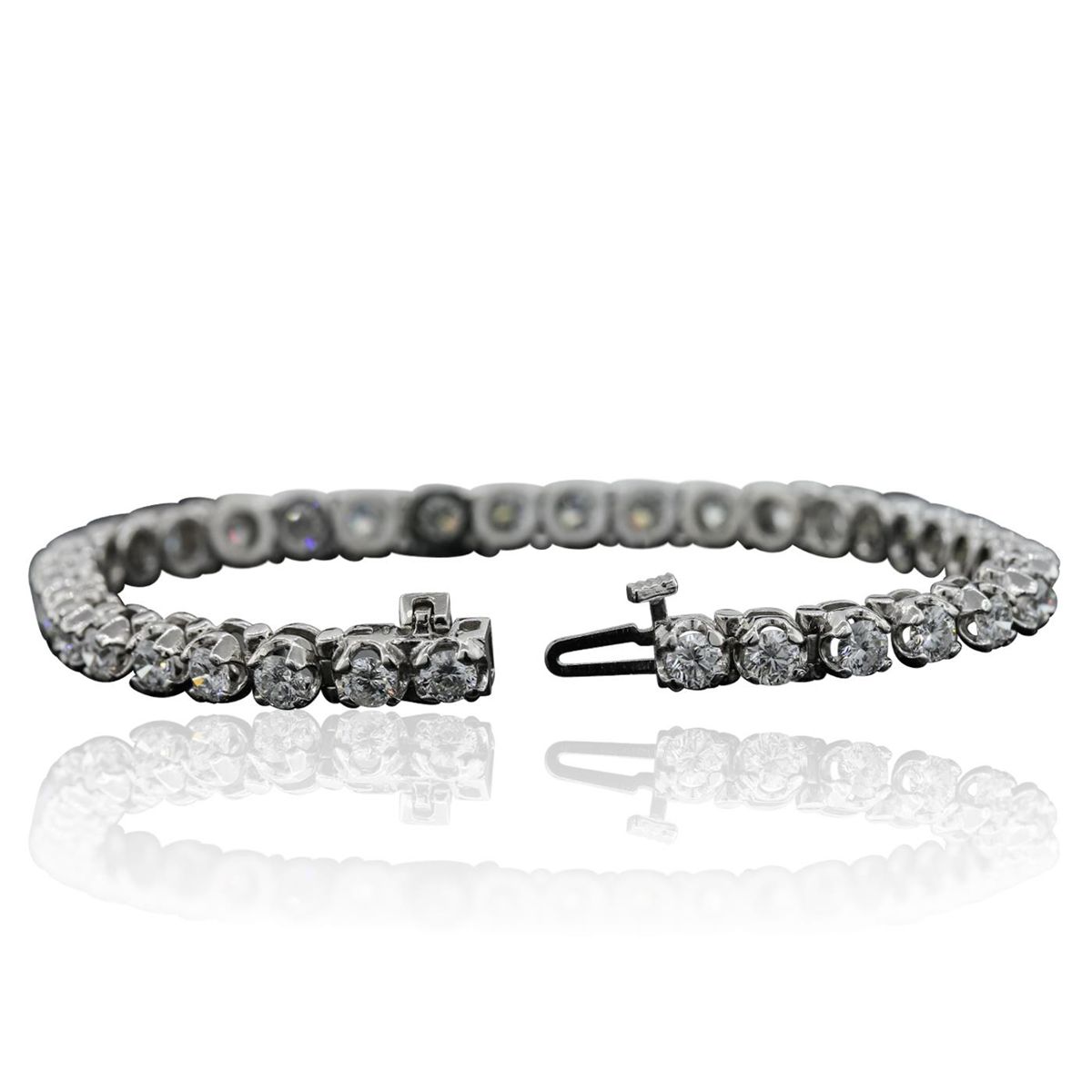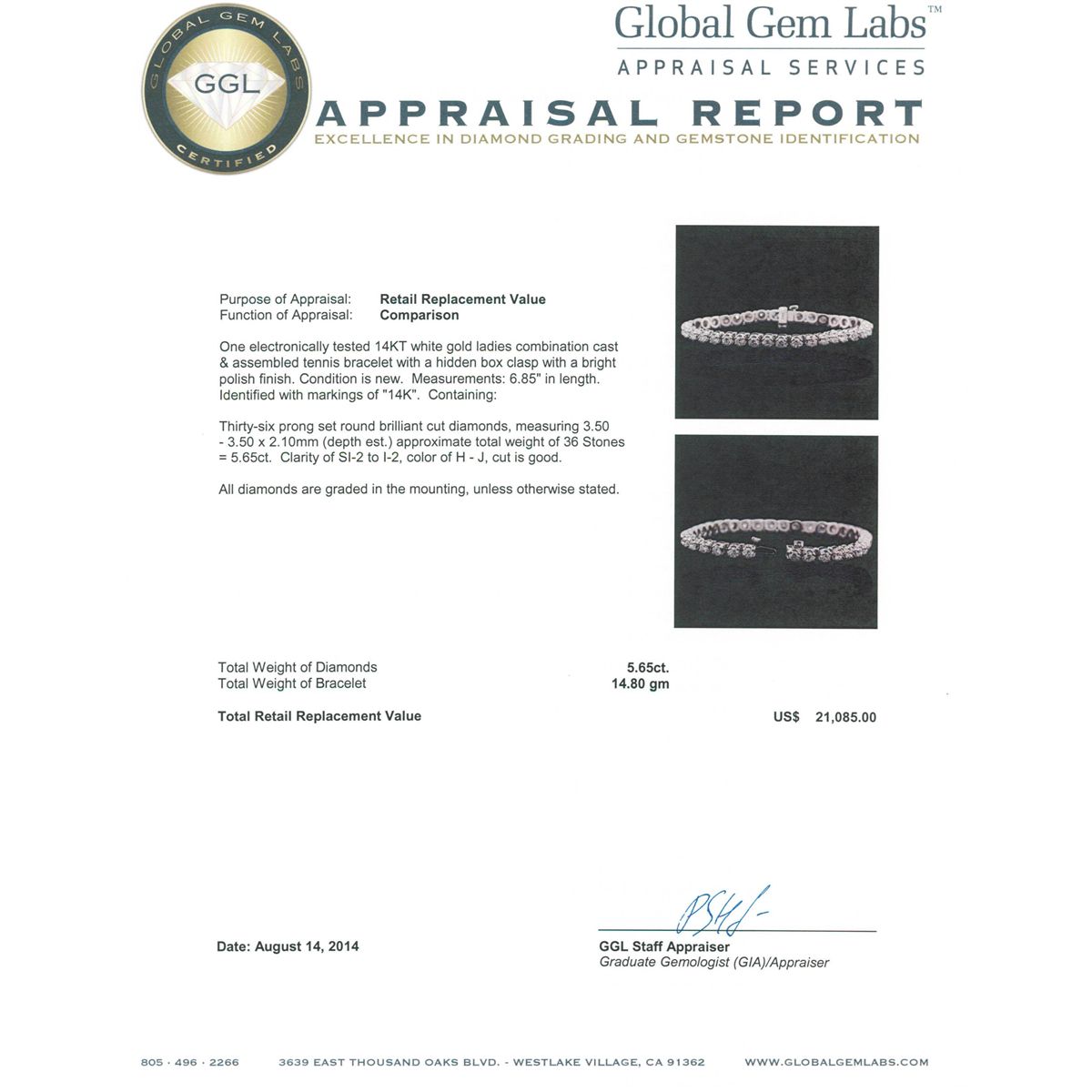 One electronically tested 14KT white gold ladies combination cast & assembled tennis bracelet with a hidden box clasp with a bright polish finish. Condition is new. Measurements: 6.85" in length. Identified with markings of "14K". Containing: Thirty-Six prong set round brilliant cut diamonds, measuring 3.50 - 3.50 x 2.10mm (depth est.) approximate total weight of 36 Stones = 5.65ct. Clarity: SI-2 to I-2. Color: H - J, Cut is Good. All diamonds are graded in the mounting, unless otherwise stated. Total Weight of Diamonds 5.65ct. Total Weight of Bracelet 14.80 grams. GGL Appraised at $21,085.00.