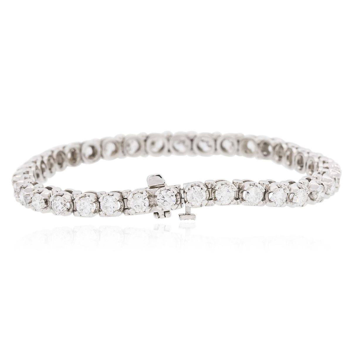 One electronically tested 14KT white gold ladies combination cast & assembled tennis bracelet with a hidden box clasp with a bright polish finish. Condition is new. Measurements: 6.85" in length. Identified with markings of "14K". Containing: Thirty-Six prong set round brilliant cut diamonds, measuring 3.50 - 3.50 x 2.10mm (depth est.) approximate total weight of 36 Stones = 5.65ct. Clarity: SI-2 to I-2. Color: H - J, Cut is Good. All diamonds are graded in the mounting, unless otherwise stated. Total Weight of Diamonds 5.65ct. Total Weight of Bracelet 14.80 grams. GGL Appraised at $21,085.00.